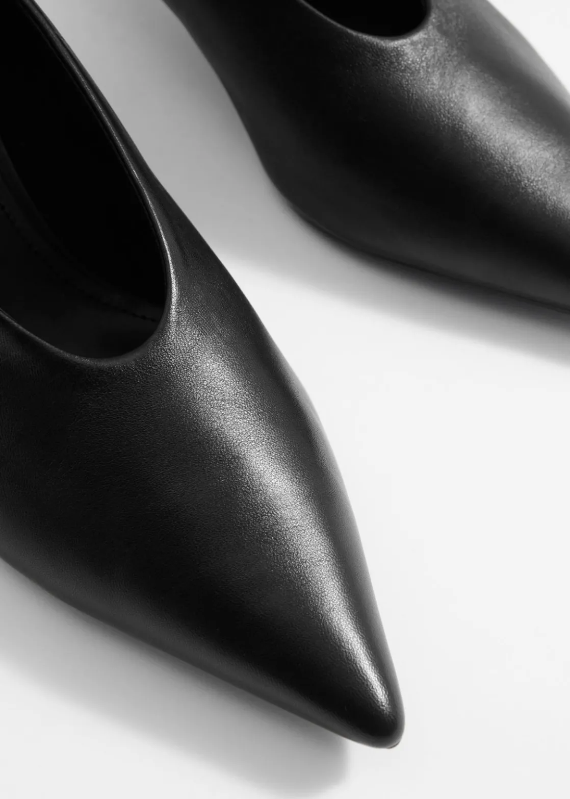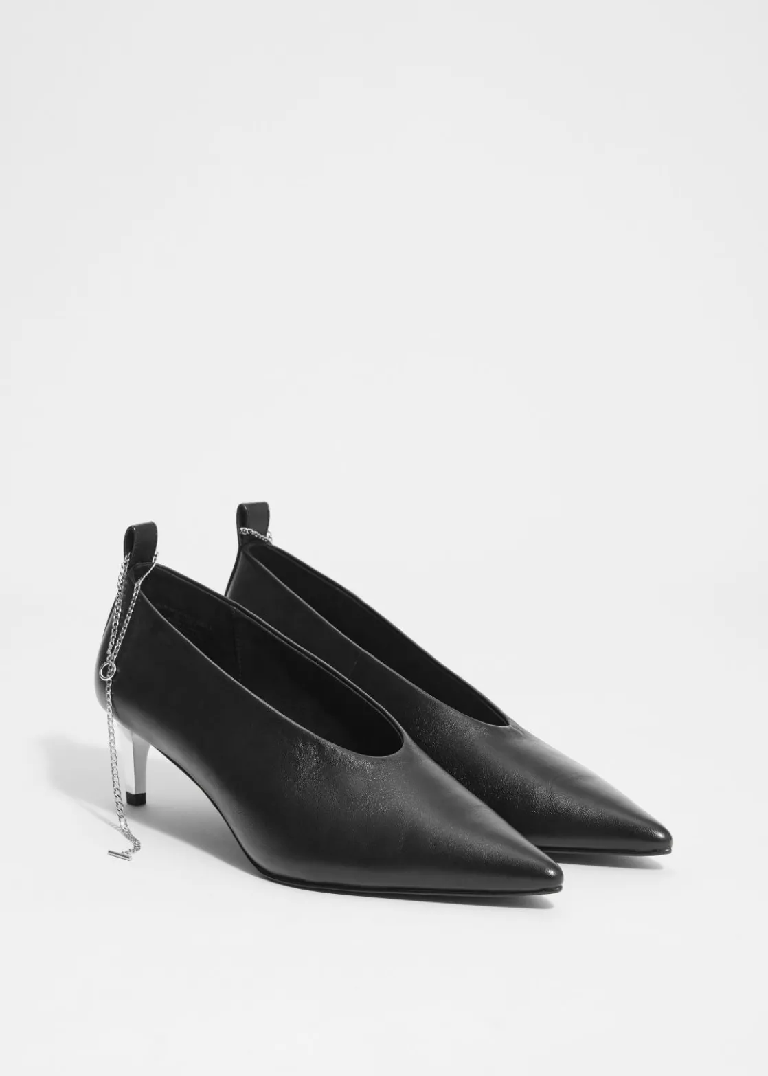 These pumps, crafted in smooth leather, are framed by detachable silver-tone anklets. They have a slightly higher vamp and sleek pointed toe. The 55mm silver plated kitten heel adds lift while remaining comfortable.