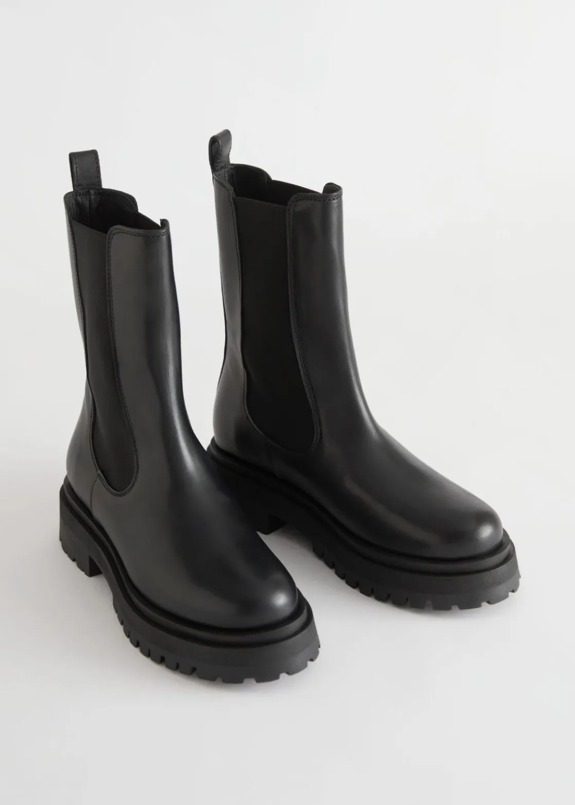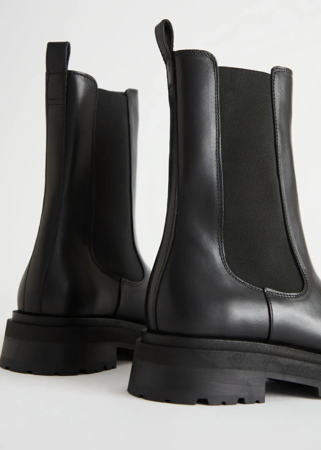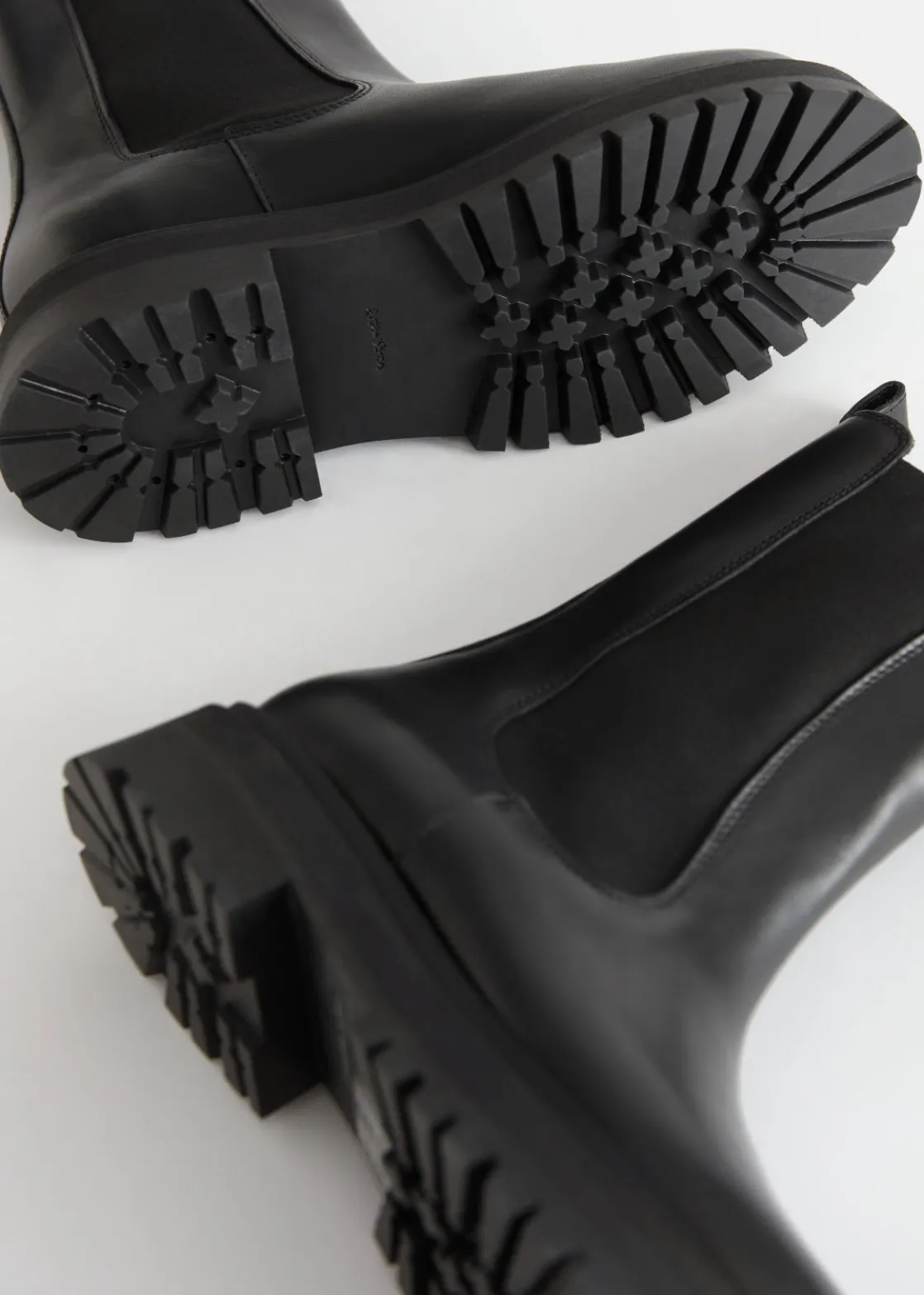 Chelsea leather boots featuring elasticated side panels and a chunky rubber sole.