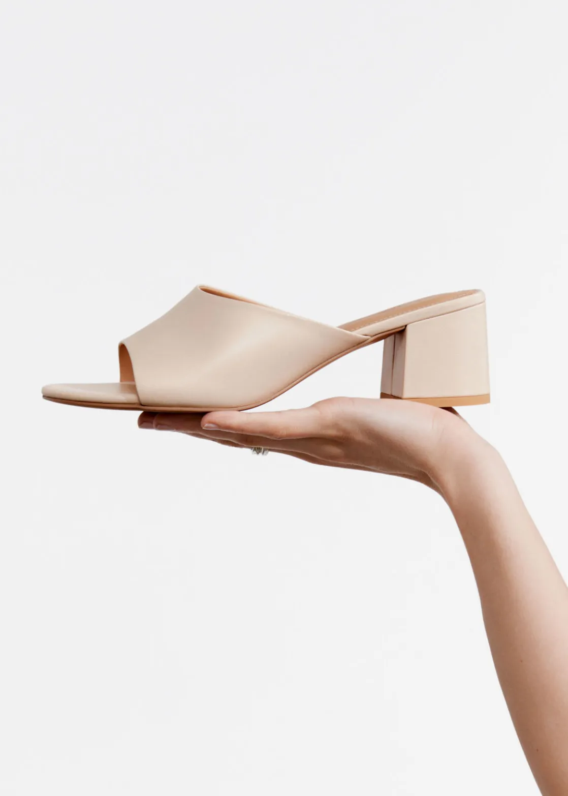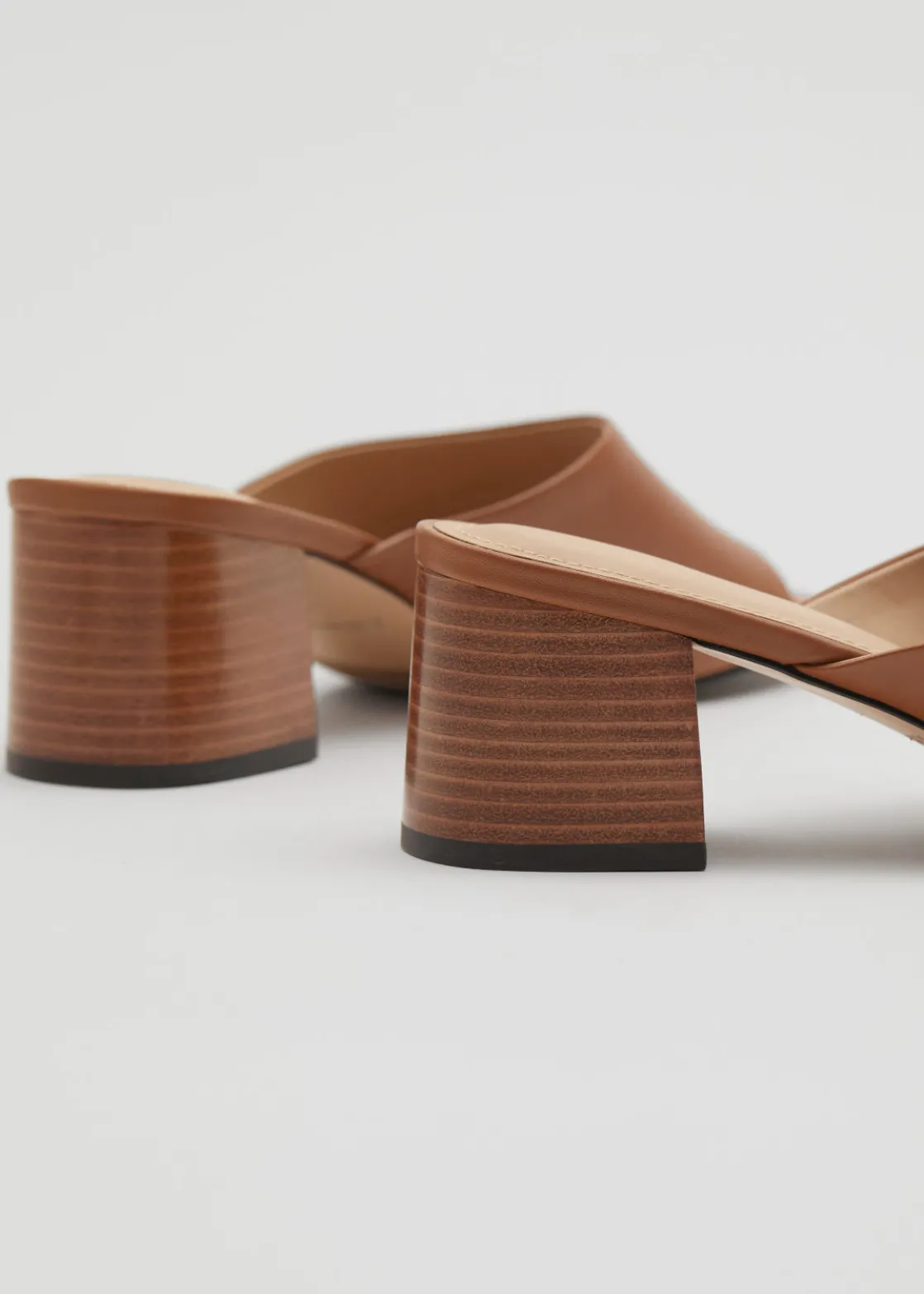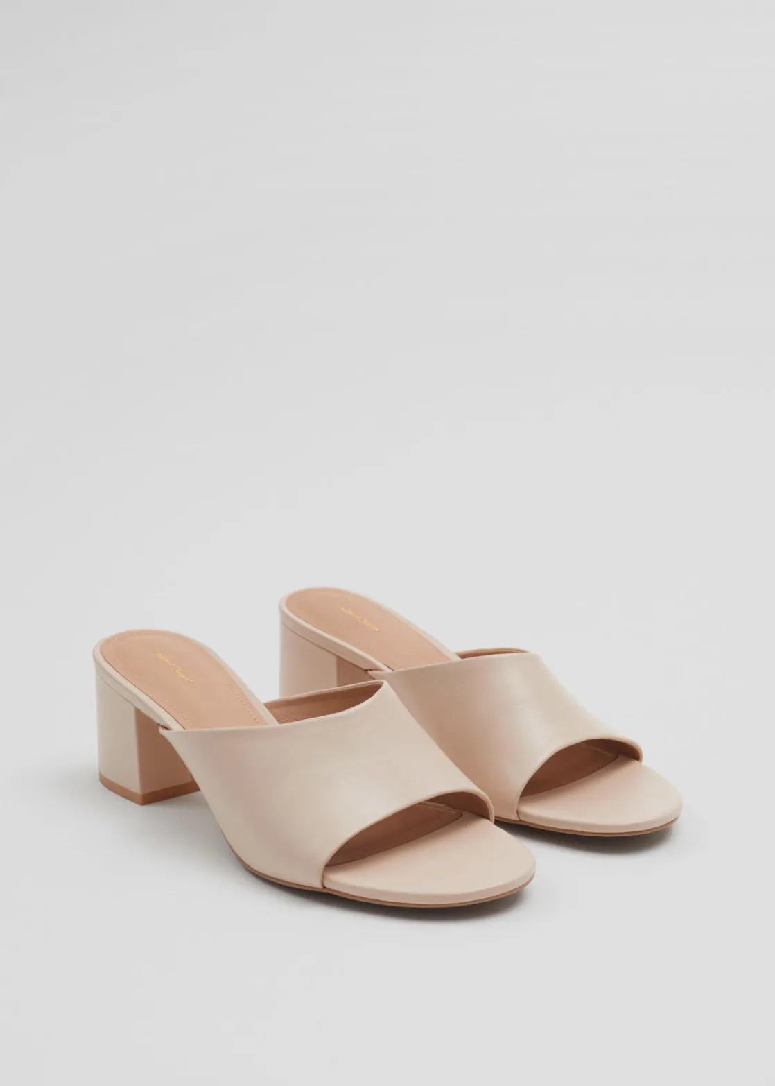Mules crafted from nappa leather featuring a slight ’90s feel with minimalist lines, rounded toes and stacked block heels.