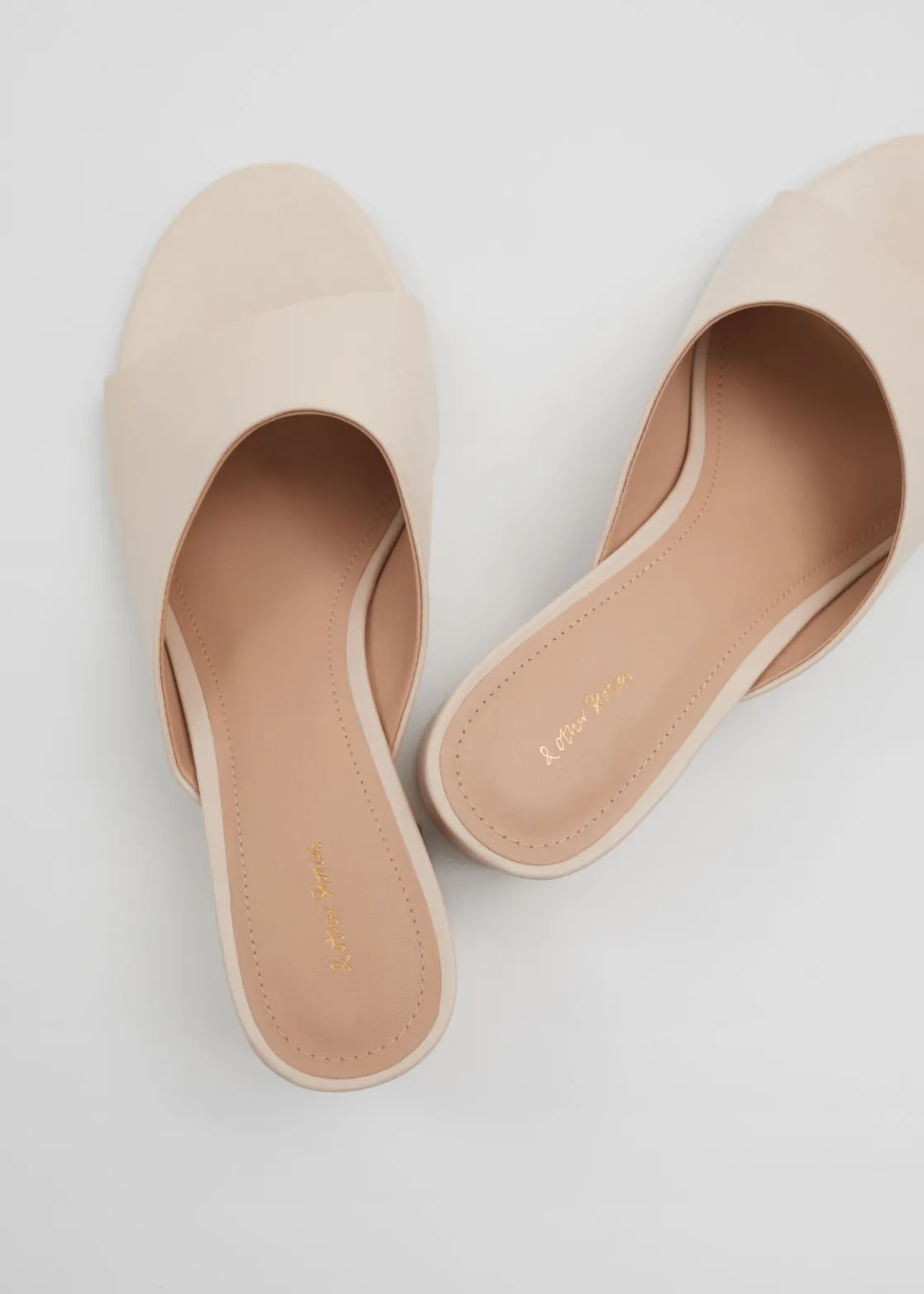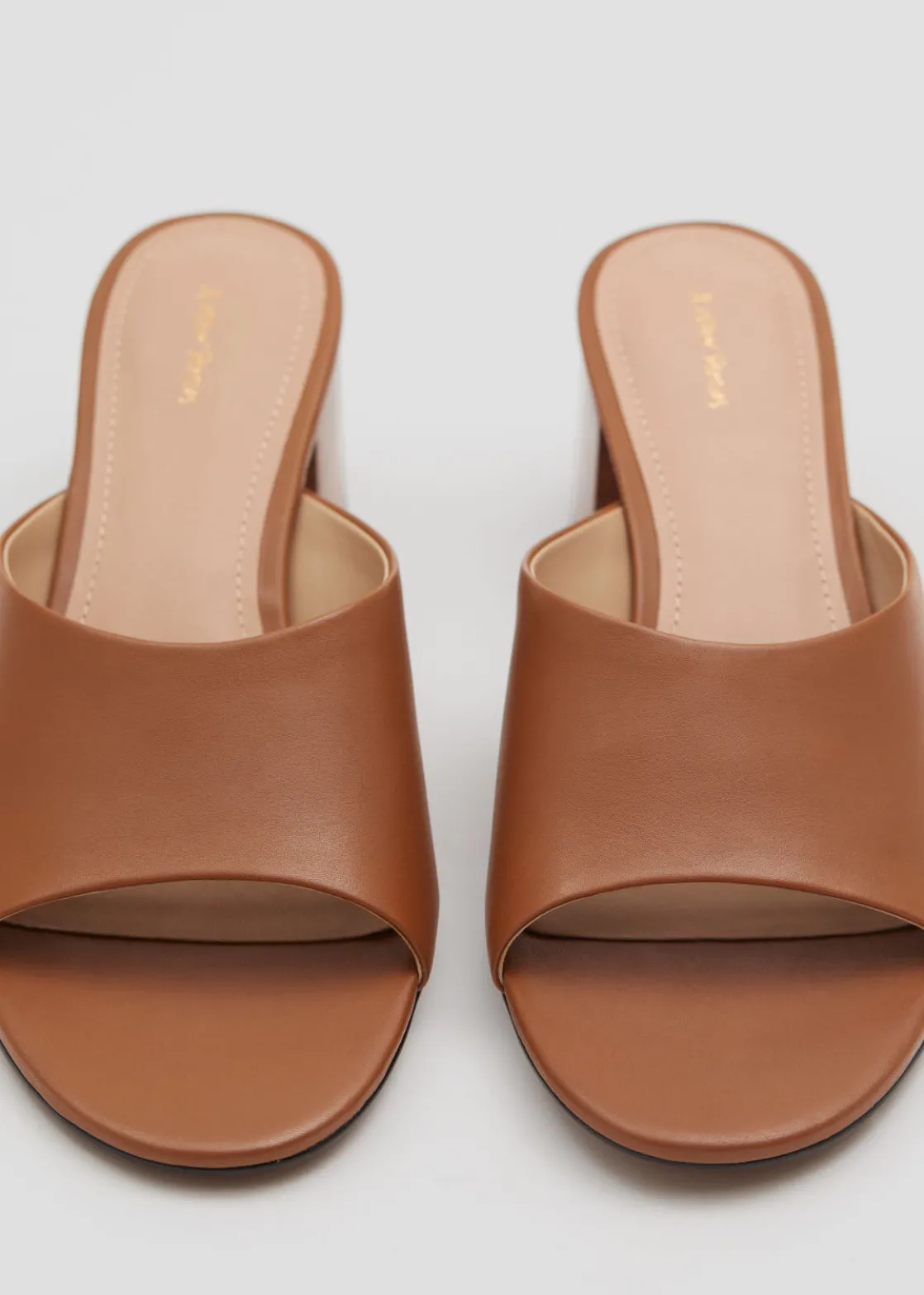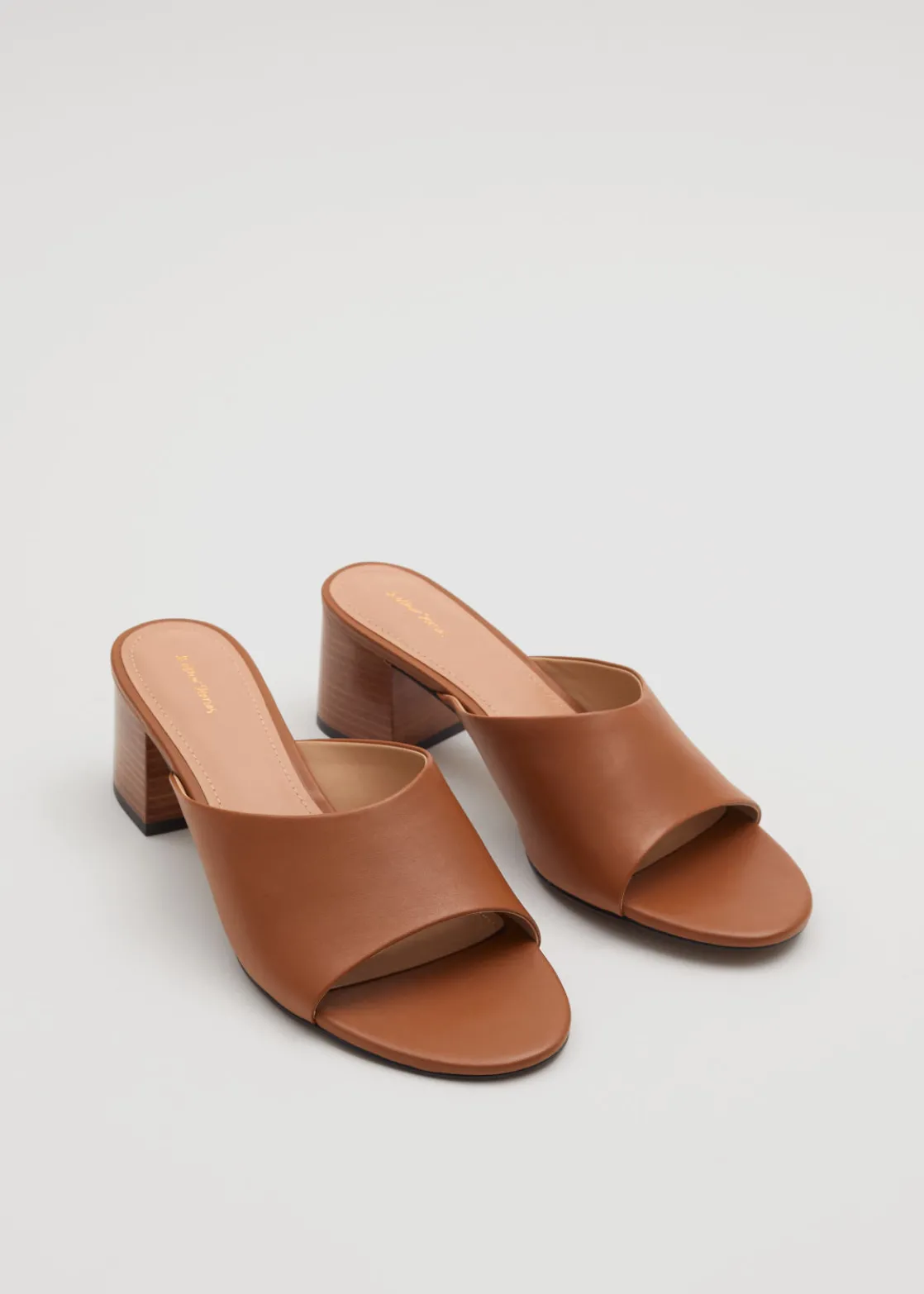 Mules crafted from nappa leather featuring a slight ’90s feel with minimalist lines, rounded toes and stacked block heels.