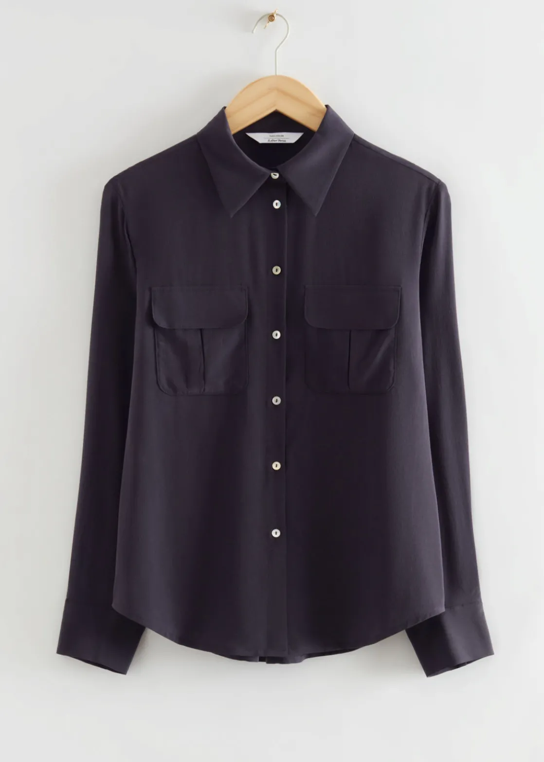 A classic mulberry silk shirt finished with a crisp collar, two chest patch pockets with flaps and inverted centre pleat and a buttoned front and cuffs. Regular fit.