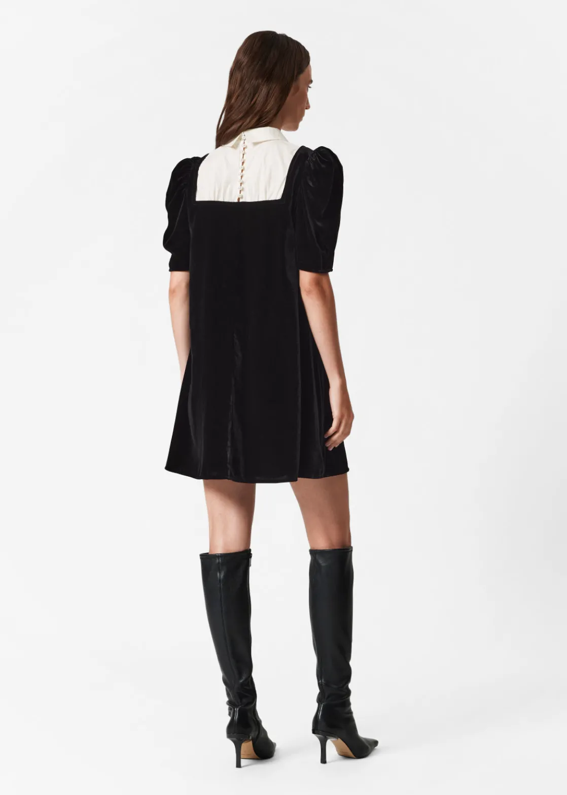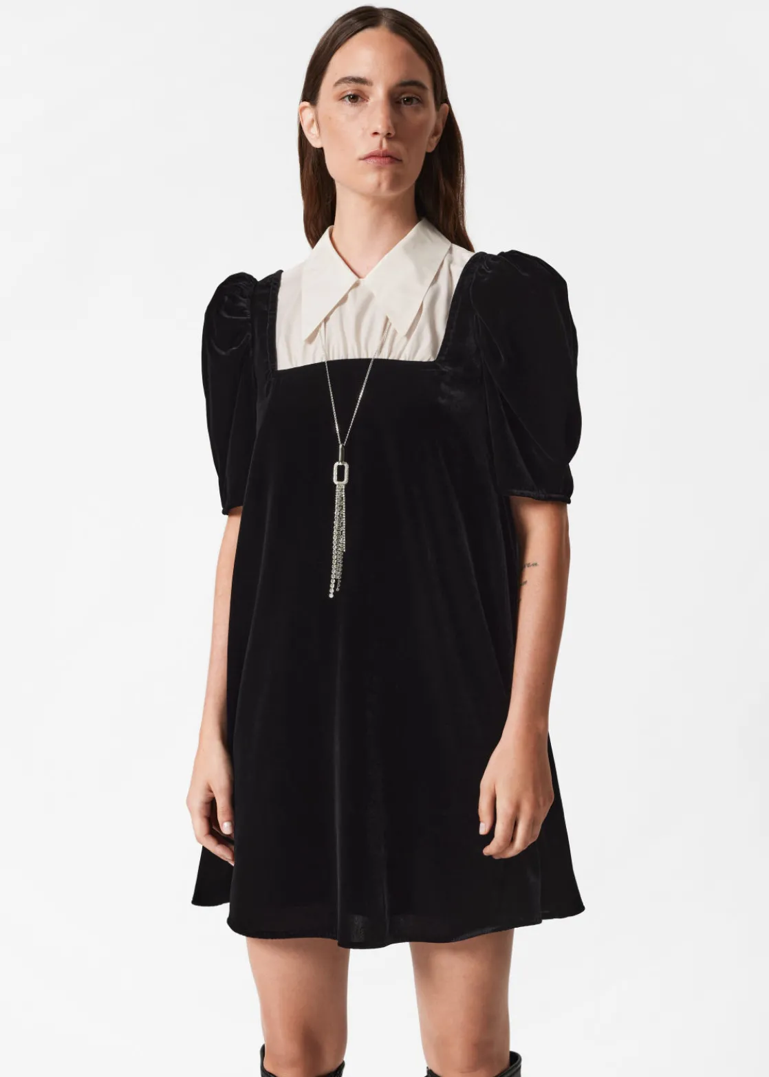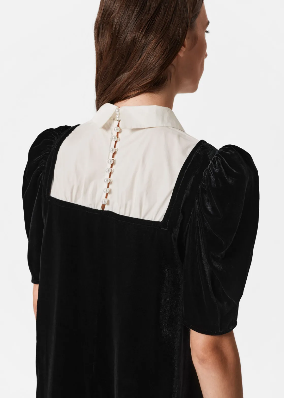 Velvet midi dress featuring a contrasting shirt material at the chest. Detailed with a turn-down collar and puff sleeves.