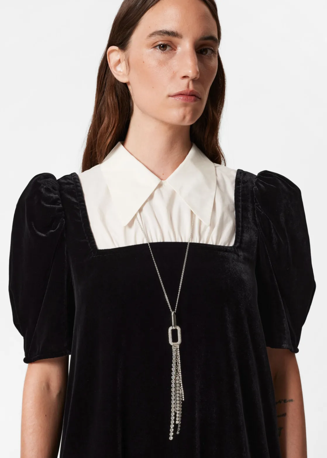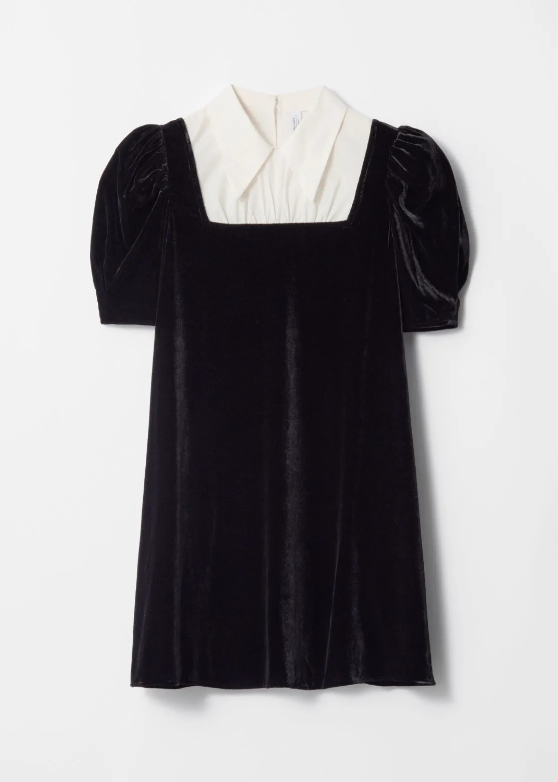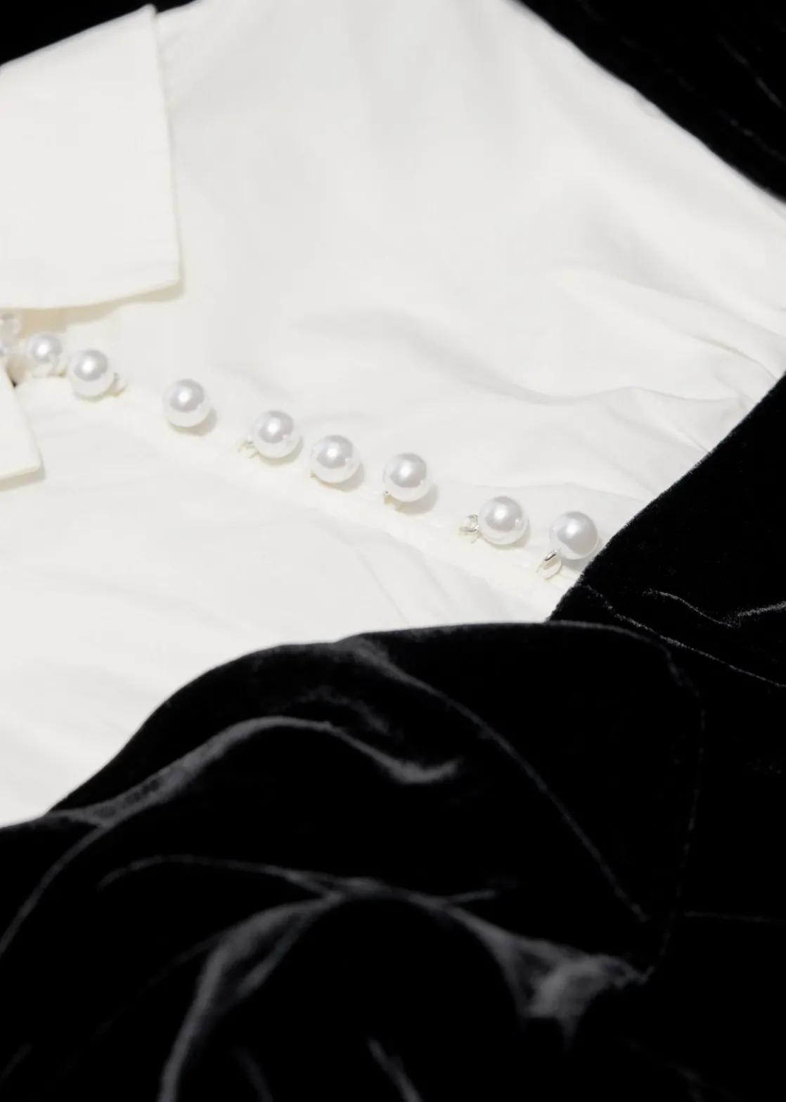 Velvet midi dress featuring a contrasting shirt material at the chest. Detailed with a turn-down collar and puff sleeves.