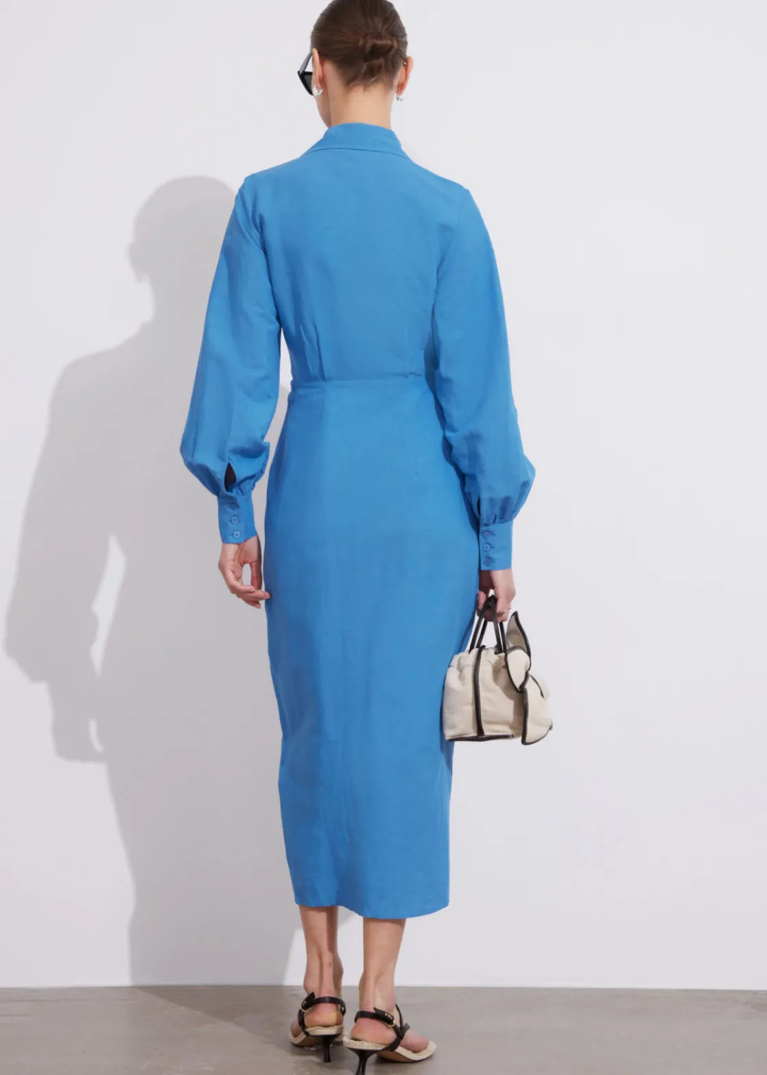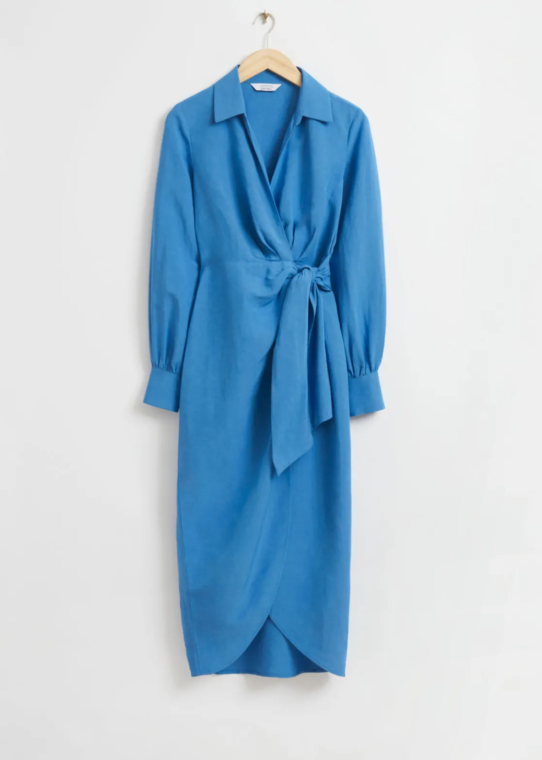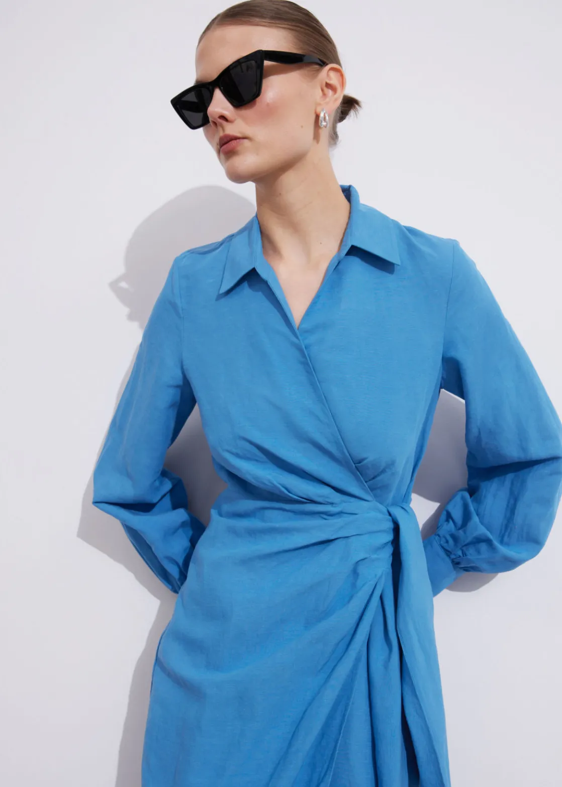 Collared v-cut wrap midi dress finished with a self-tie detail at the side.