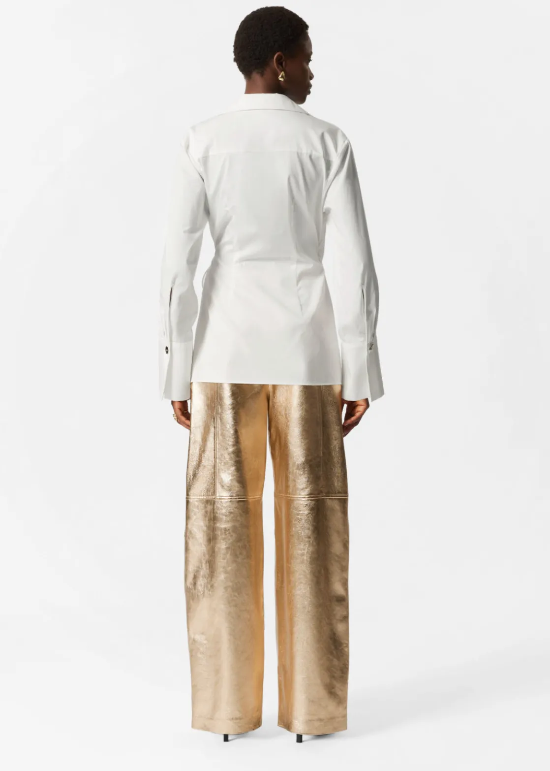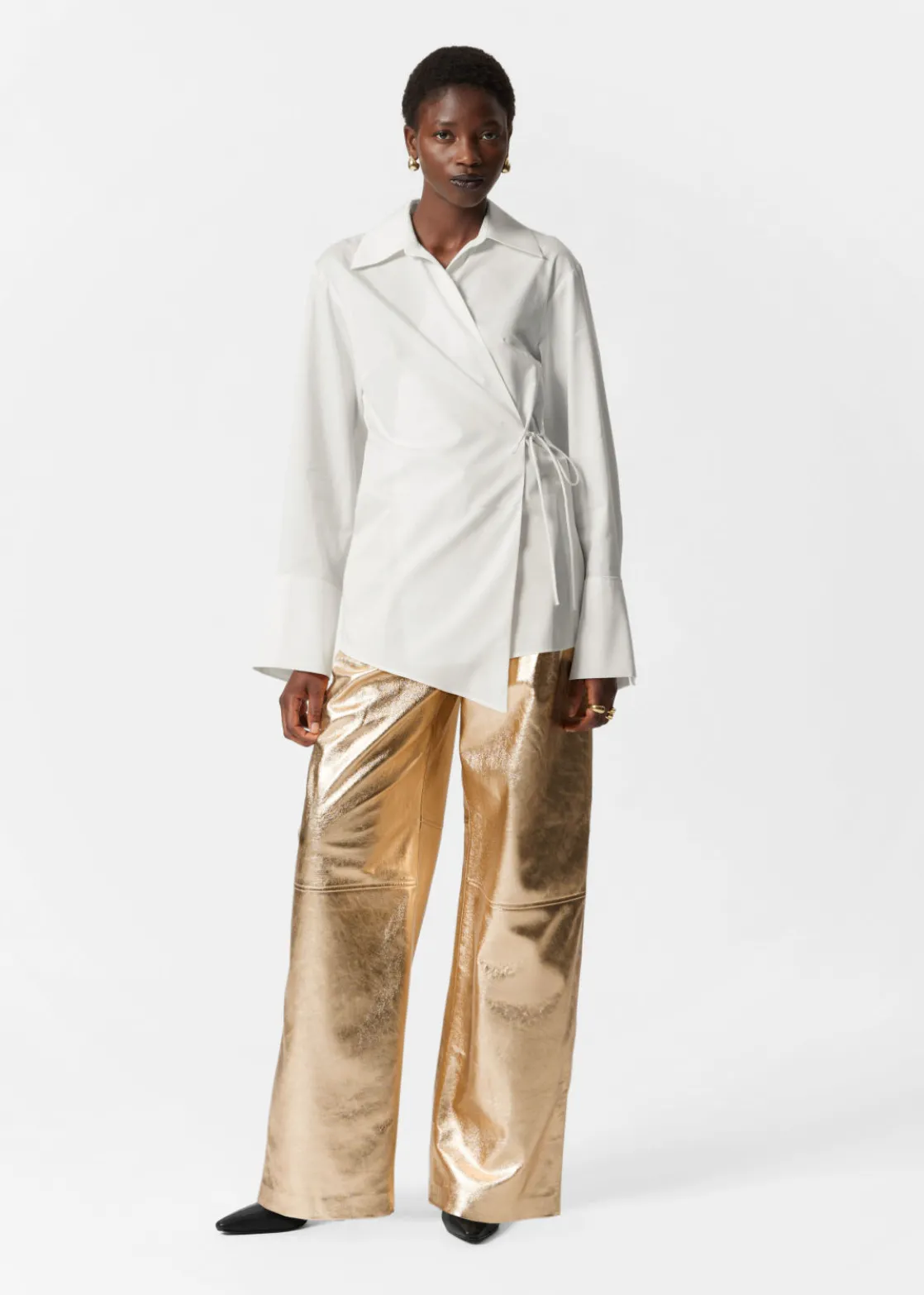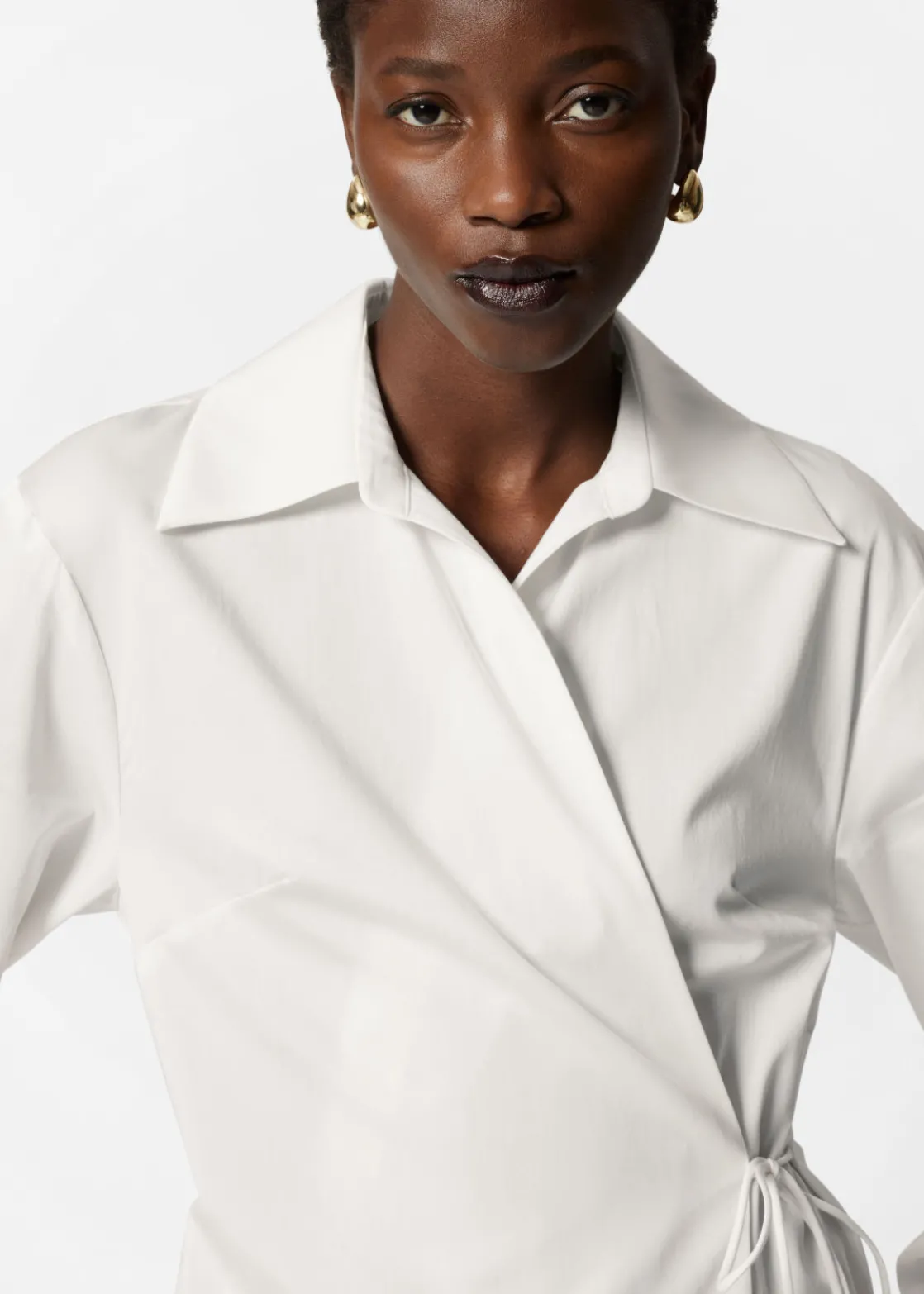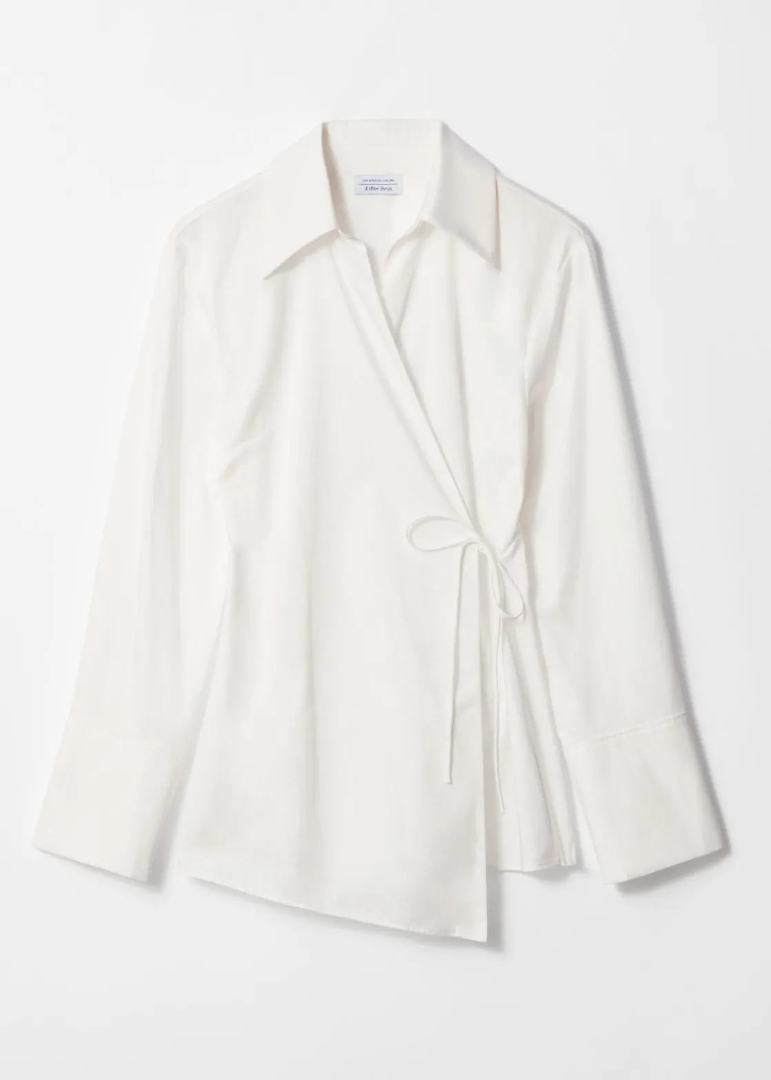 Long-sleeve cotton shirt with a wrap silhouette for an asymmetric hemline.