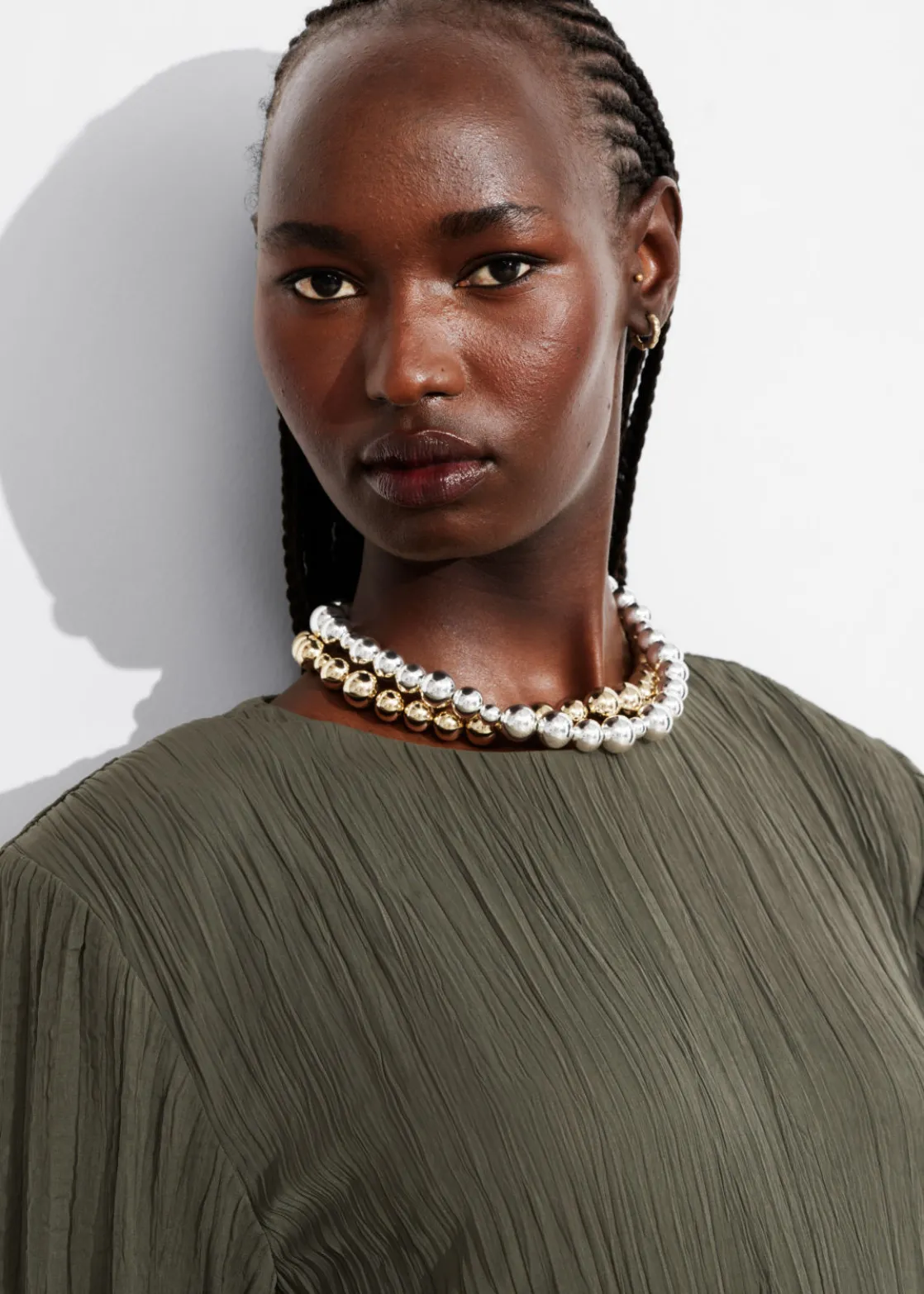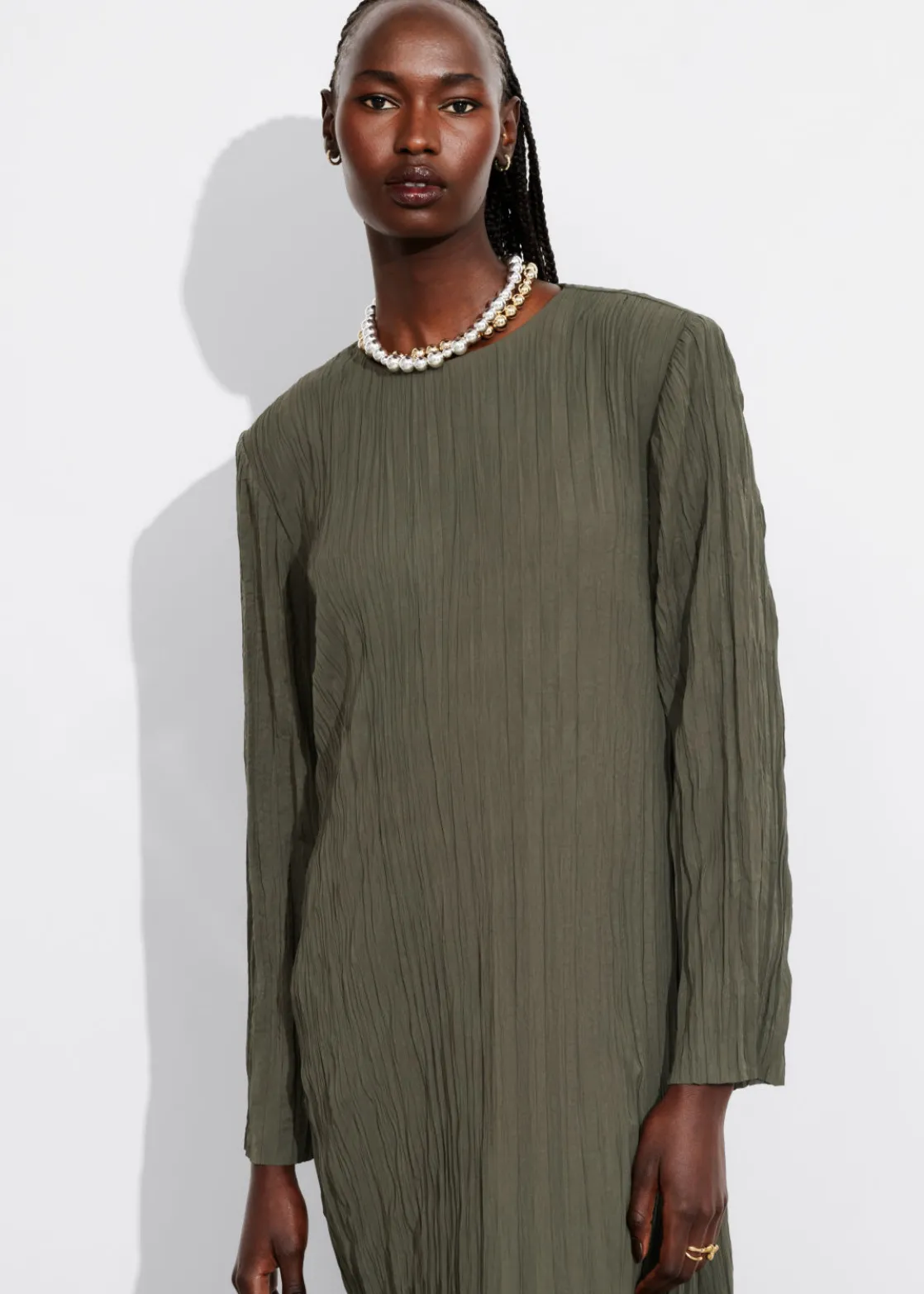 Long-sleeve midi dress defined by a crinkled finish. Finished with padded shoulders.