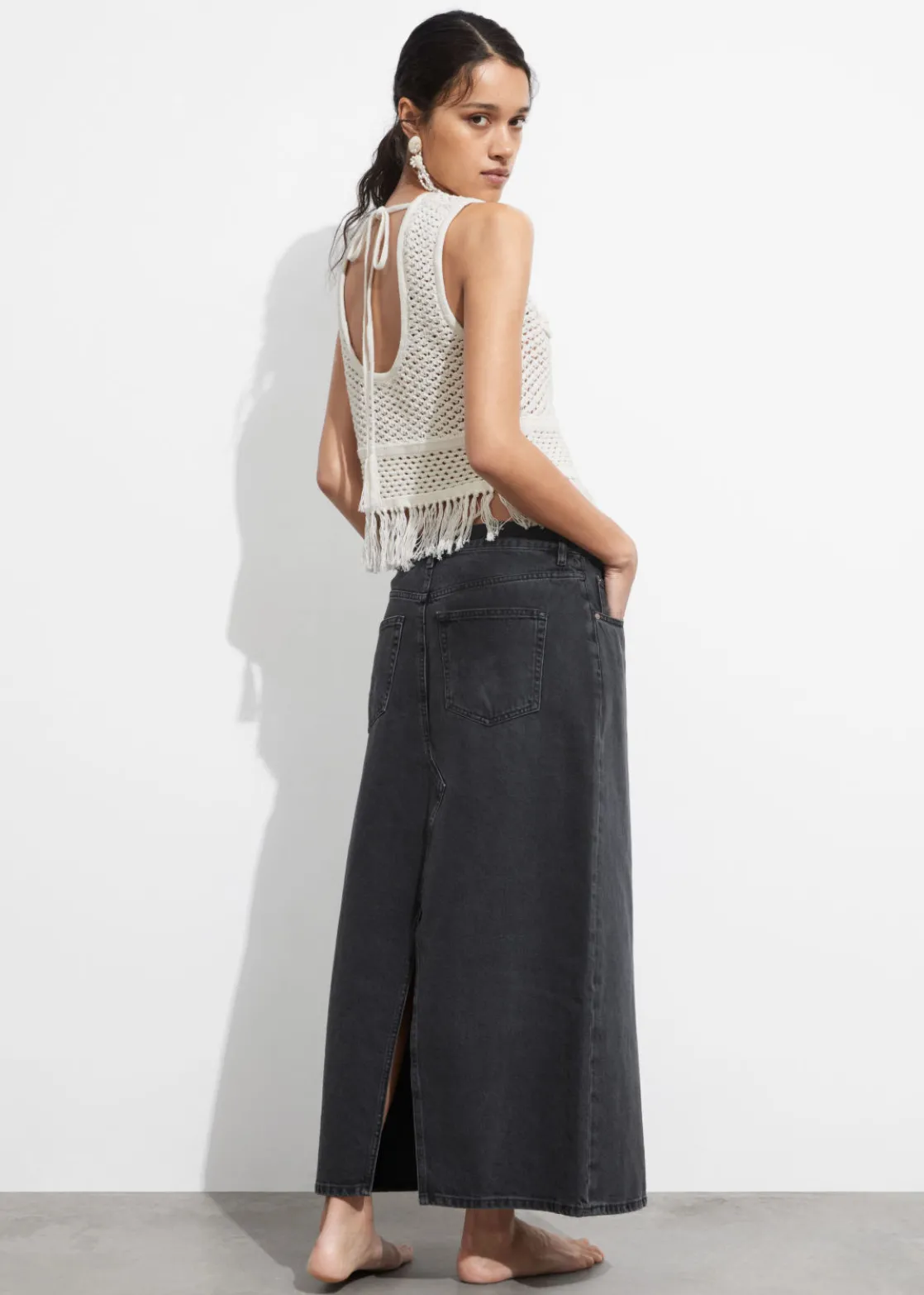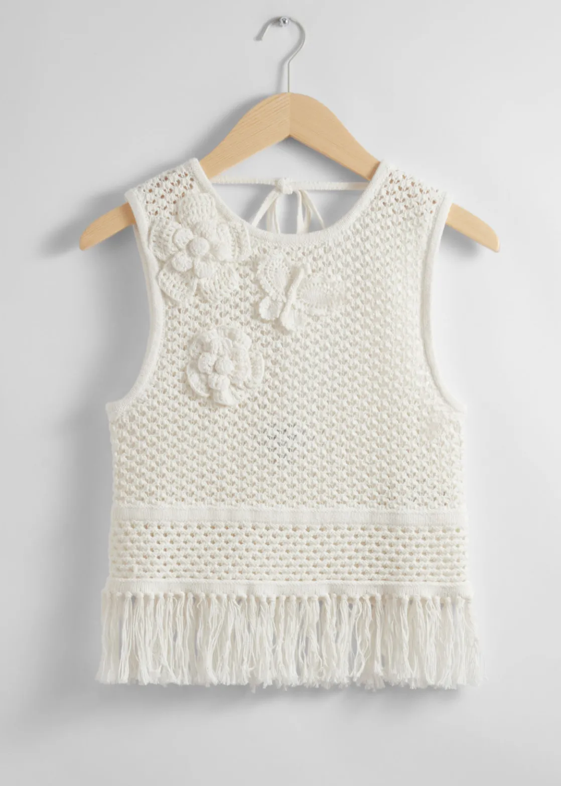 Crocheted tank top featuring floral-appliqué detailing at the chest and a fringed hemline. Finished with a scooped back secured with a tie detail at the neck.