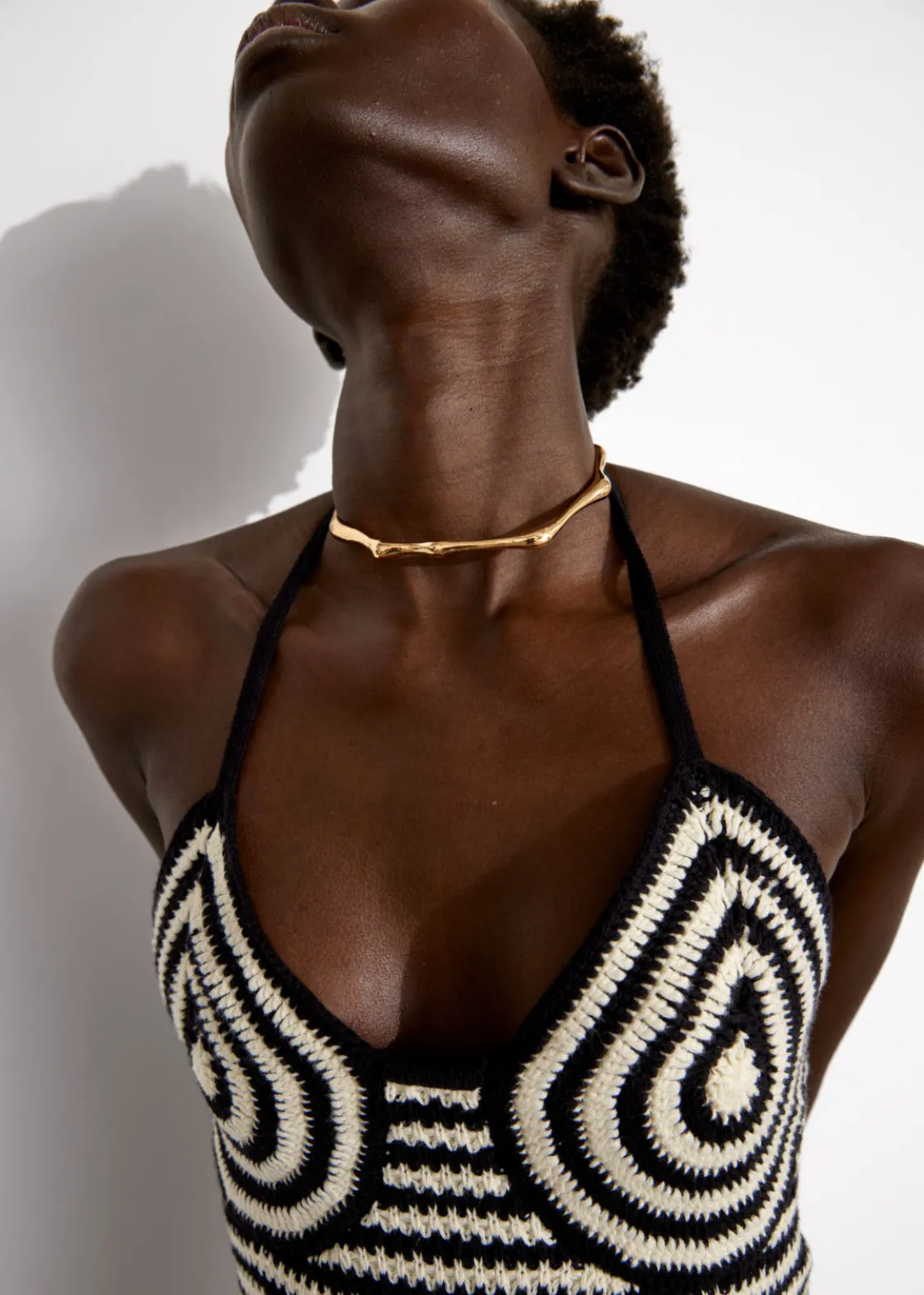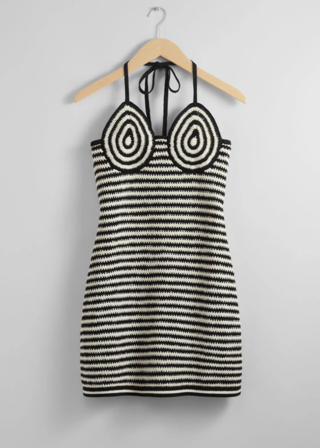 Crocheted halterneck mini dress with a zigzag-striped finish. Featuring bustier-inspired cups in a contrasting pattern.