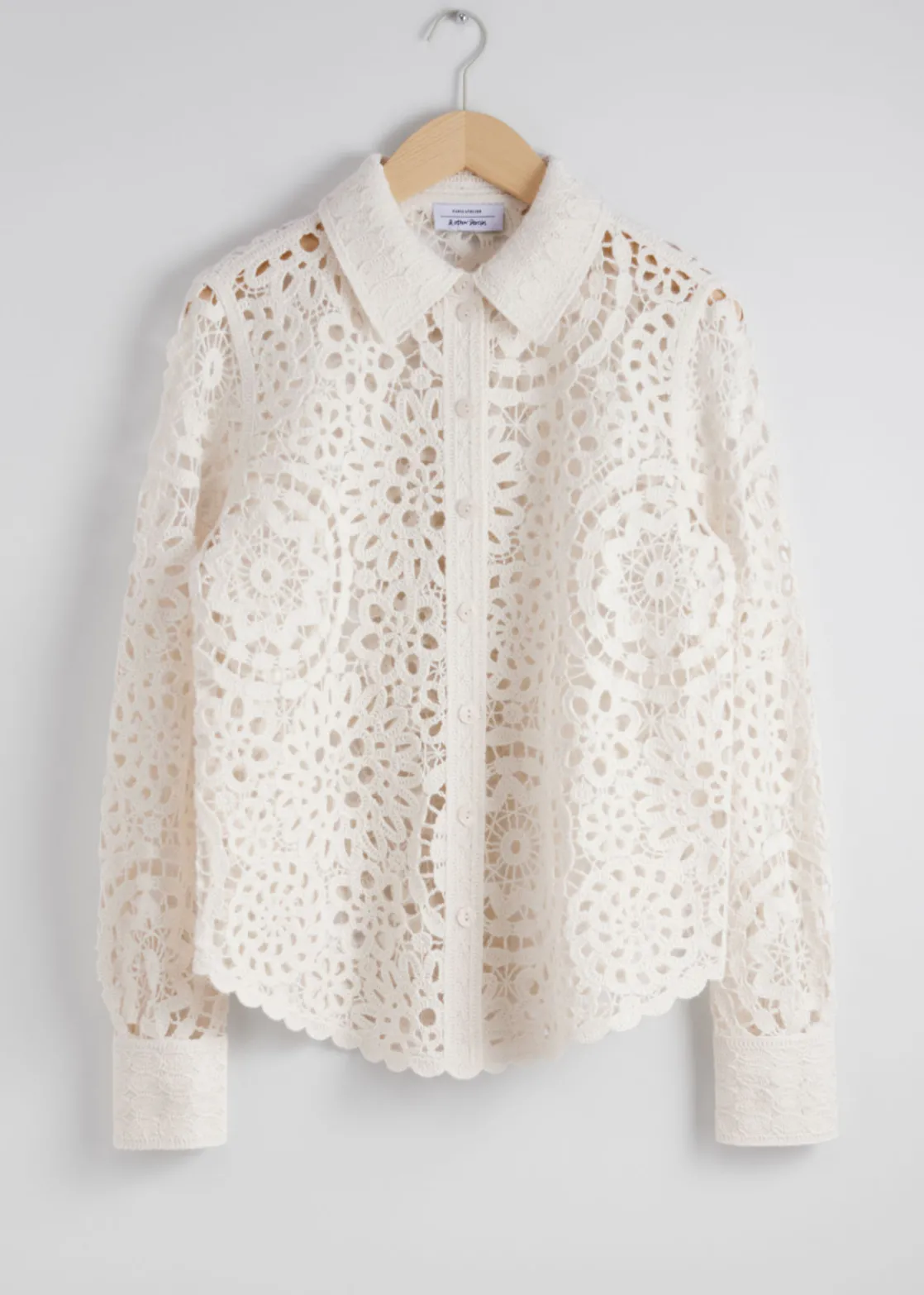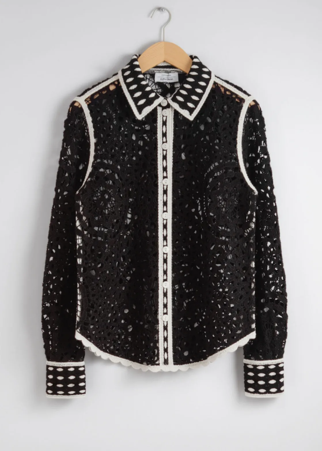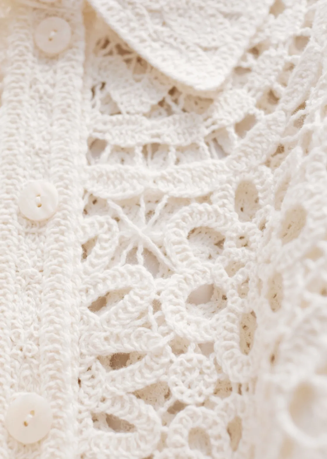 Crocheted shirt traced with centre front button closures. Finished with a turn-down collar and a scalloped hemline.