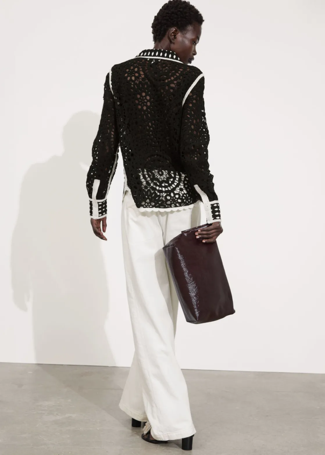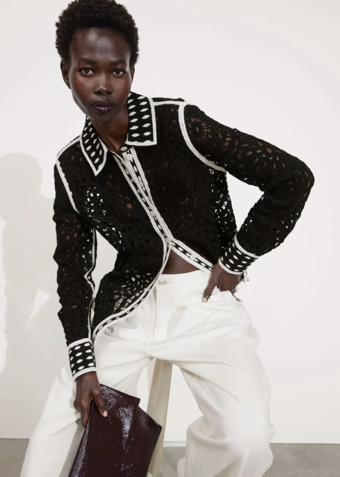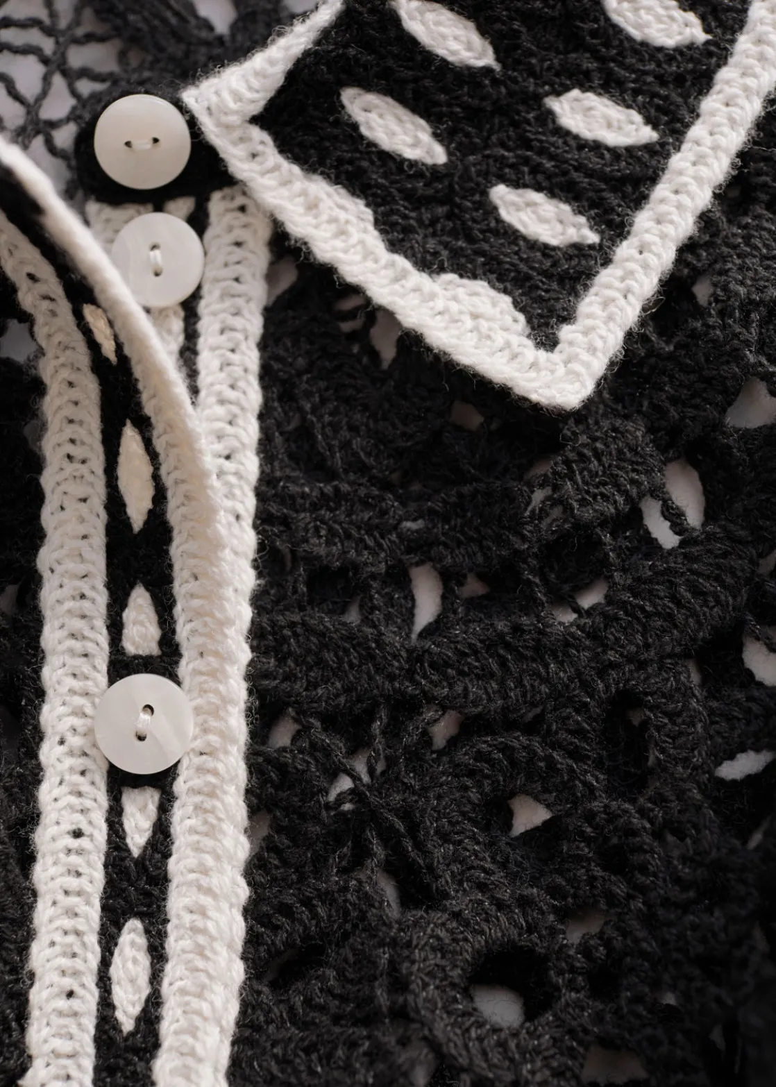 Crocheted shirt traced with centre front button closures. Finished with a turn-down collar and a scalloped hemline.