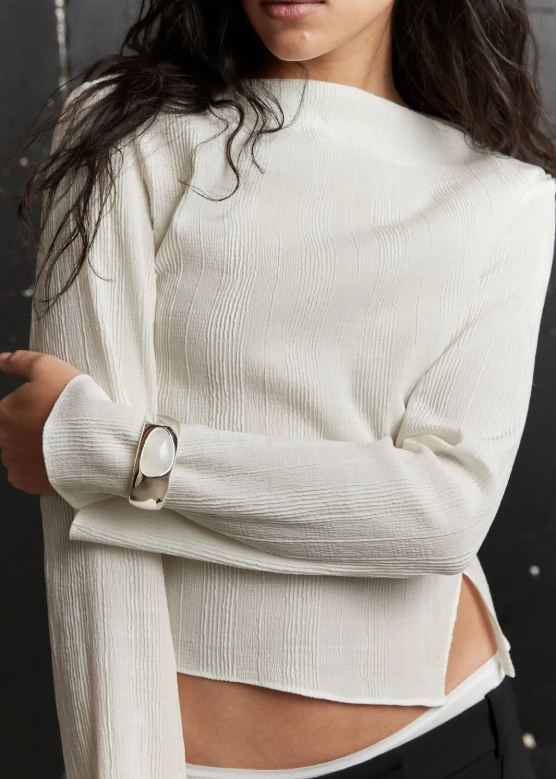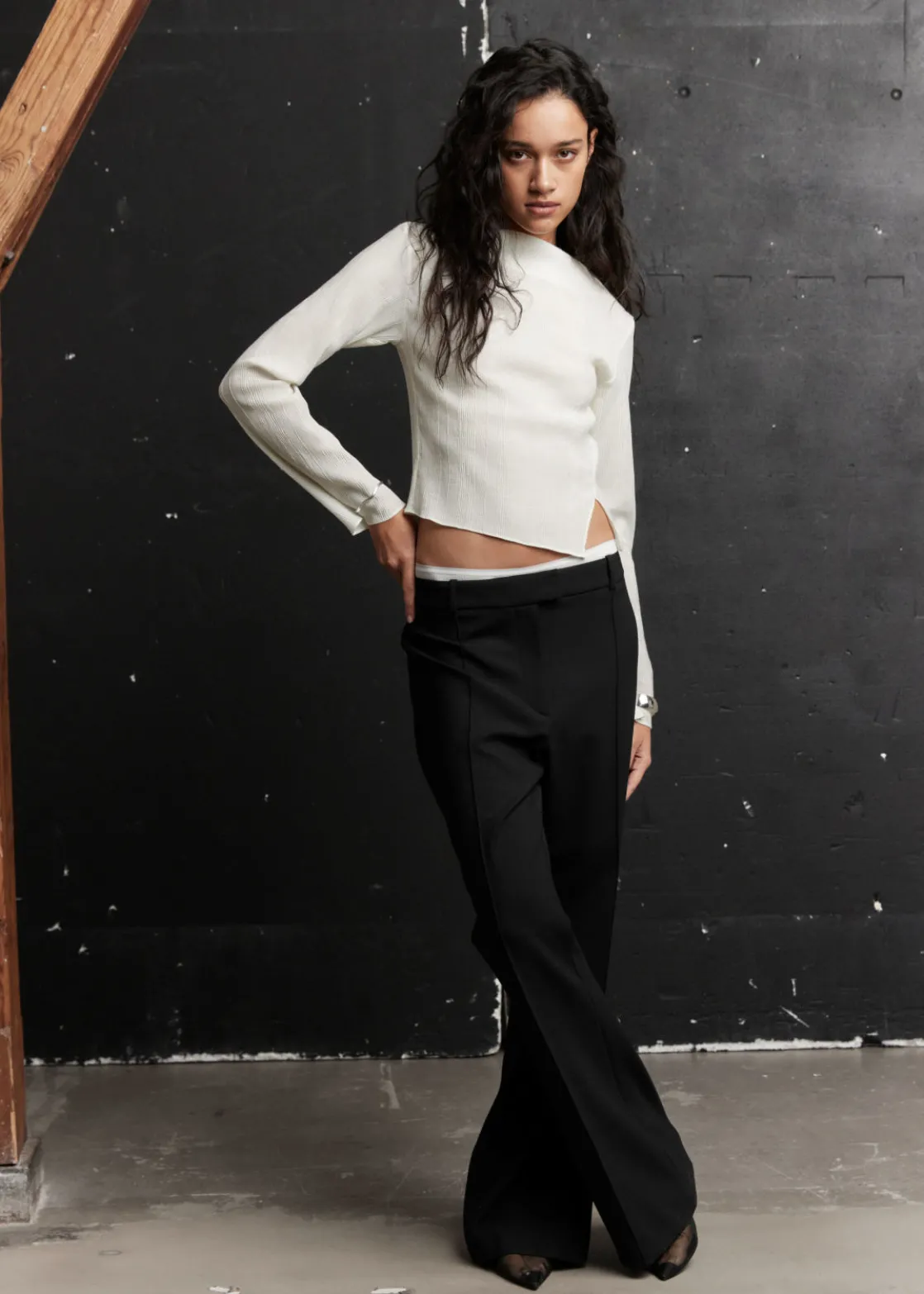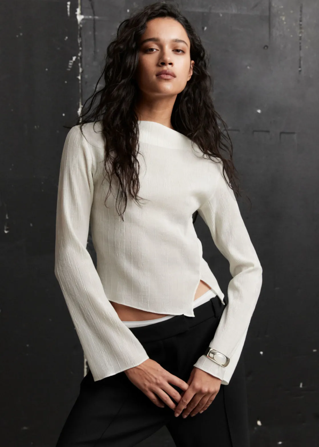 Fitted long-sleeve top with a cropped asymmetric cut, frilled edges and a ribbed finish.
