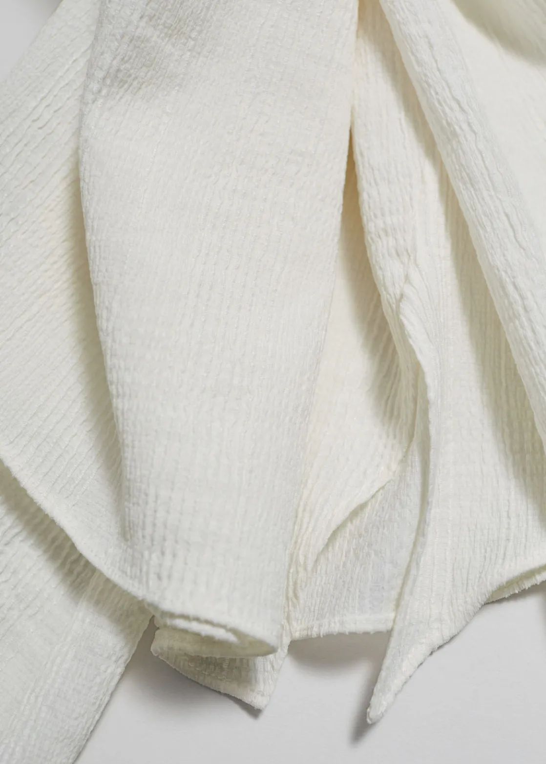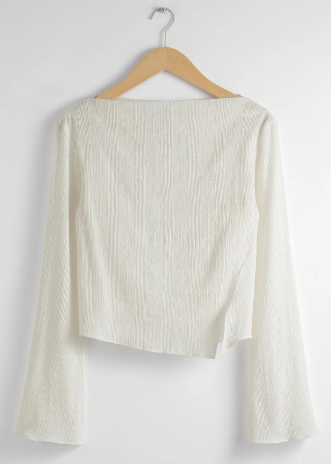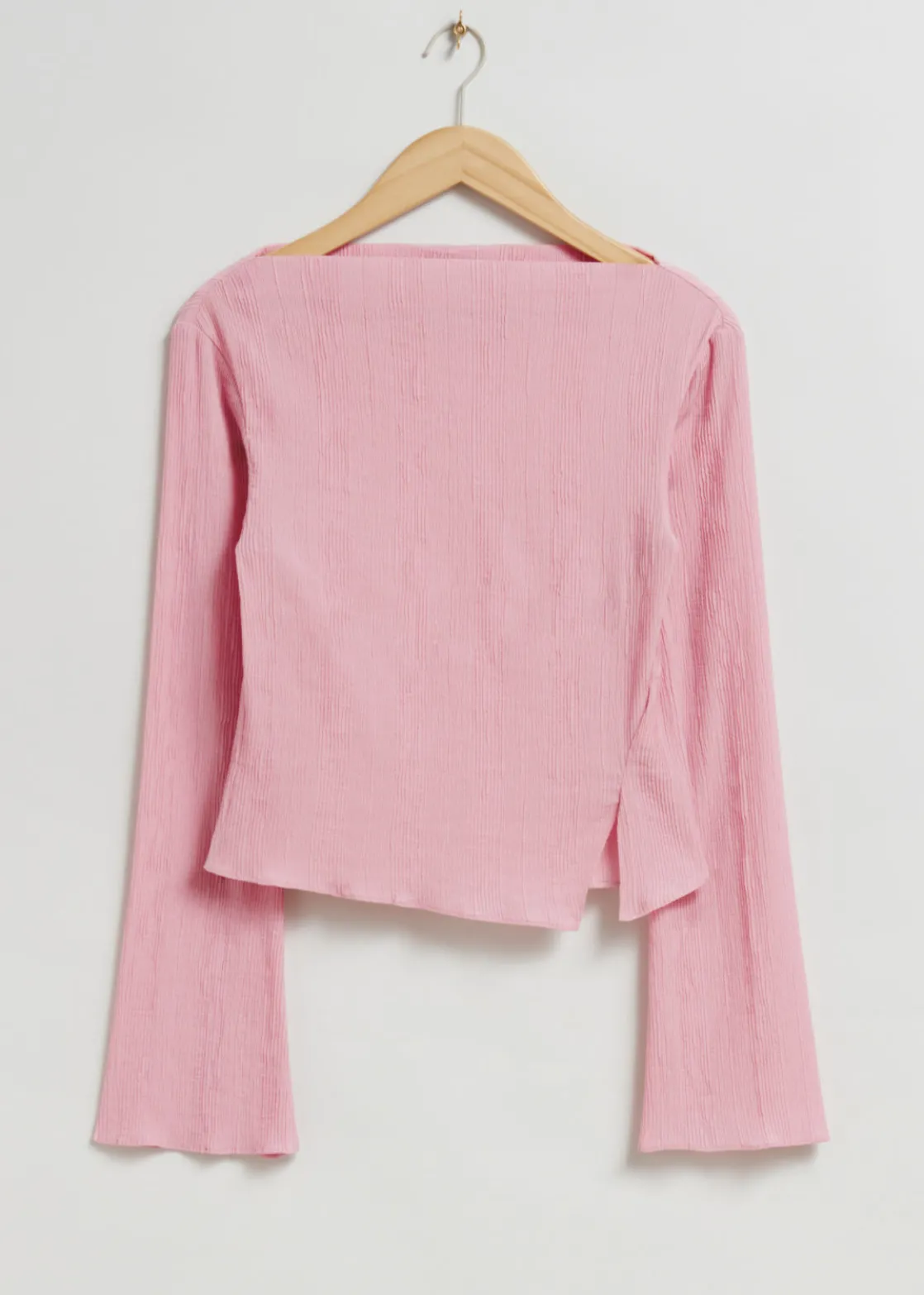 Fitted long-sleeve top with a cropped asymmetric cut, frilled edges and a ribbed finish.