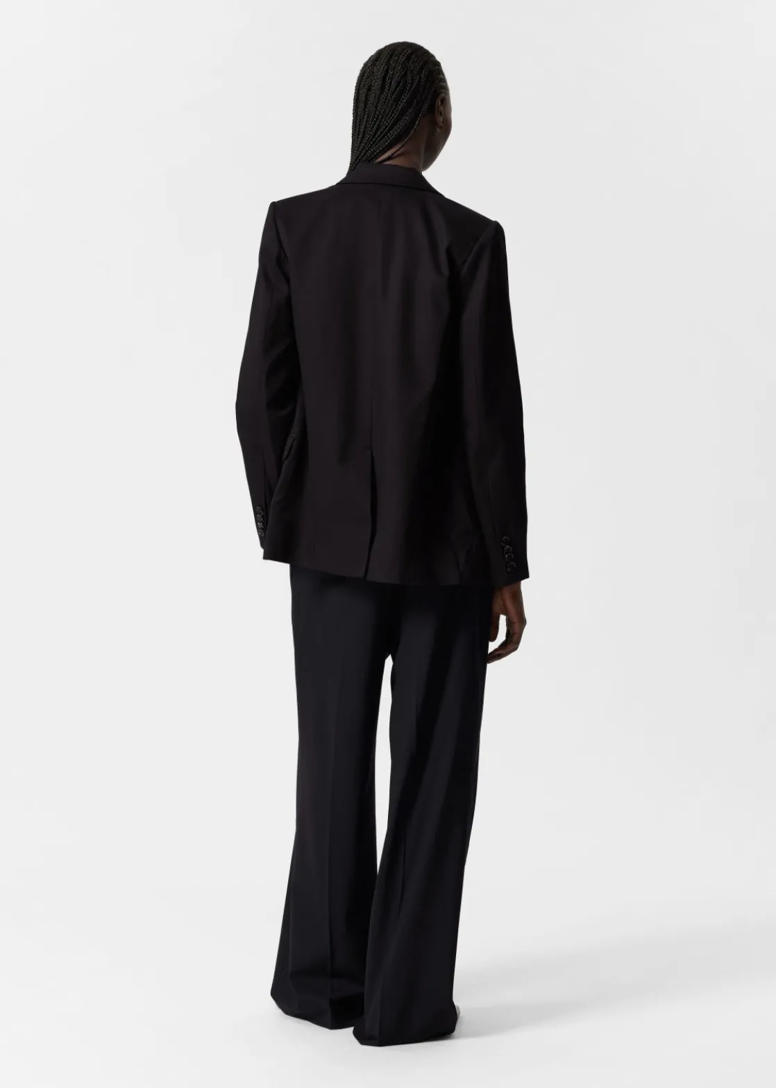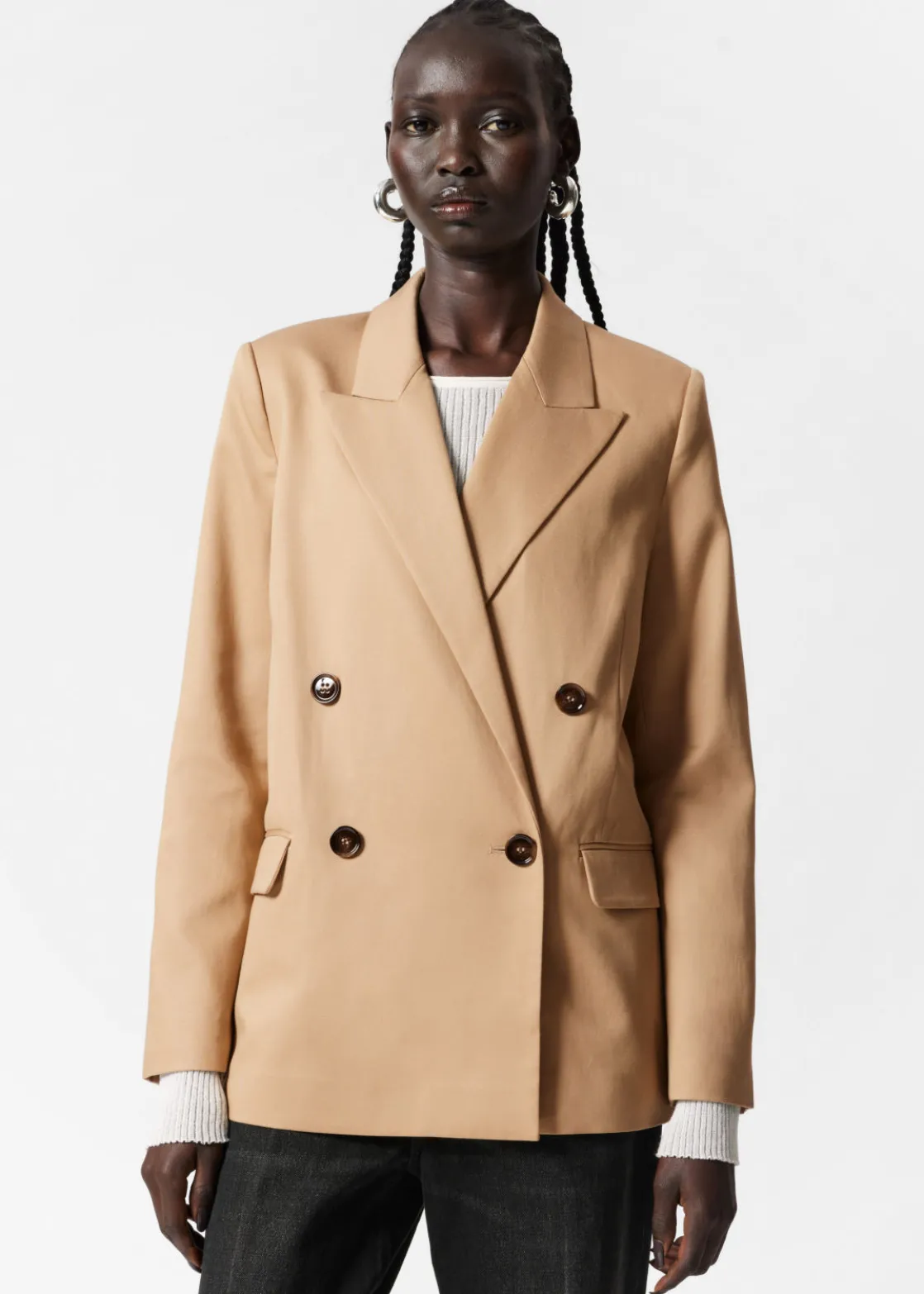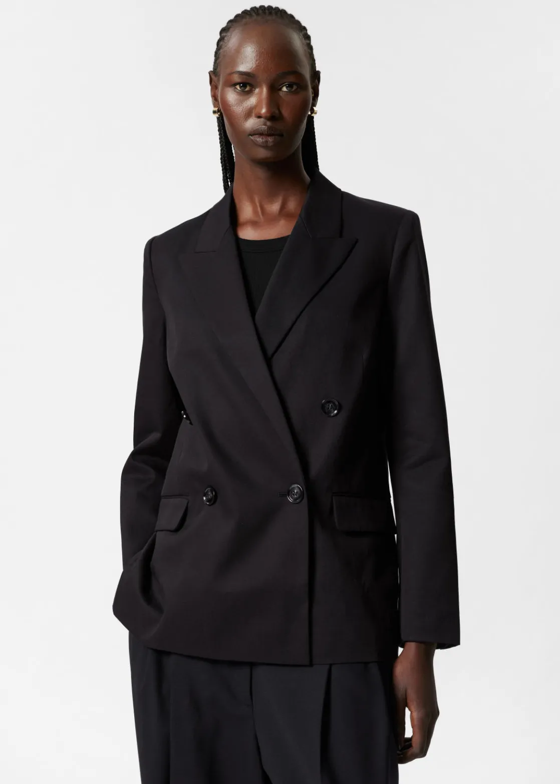 Double-breasted blazer crafted from satin twill. Designed with a peaked lapel collar and padded shoulders for a sharp, tailored look in a loose-fitting silhouette. Part of a matching set.