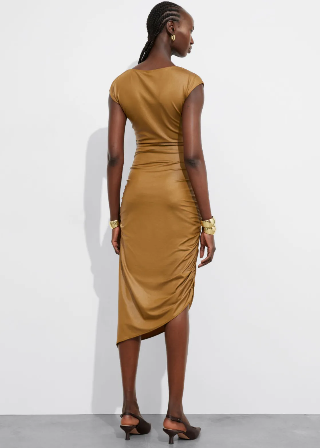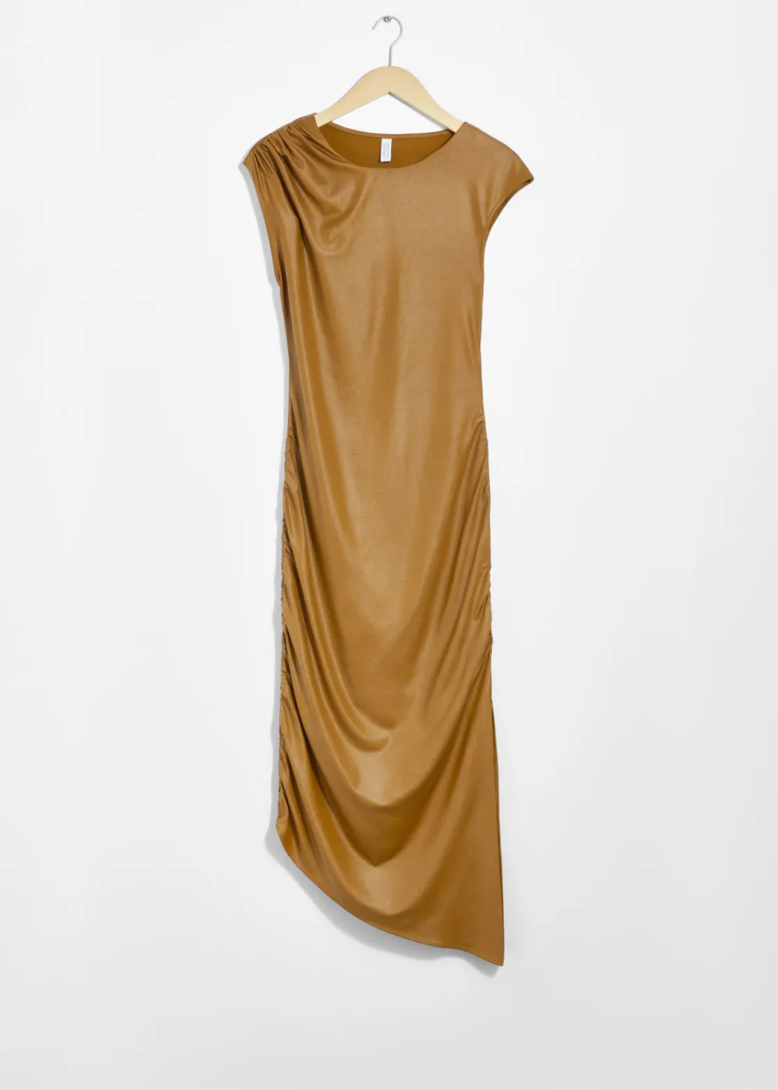 Sleeveless midi dress featuring a draped finish and a side slit. Finished with an asymmetric hemline.