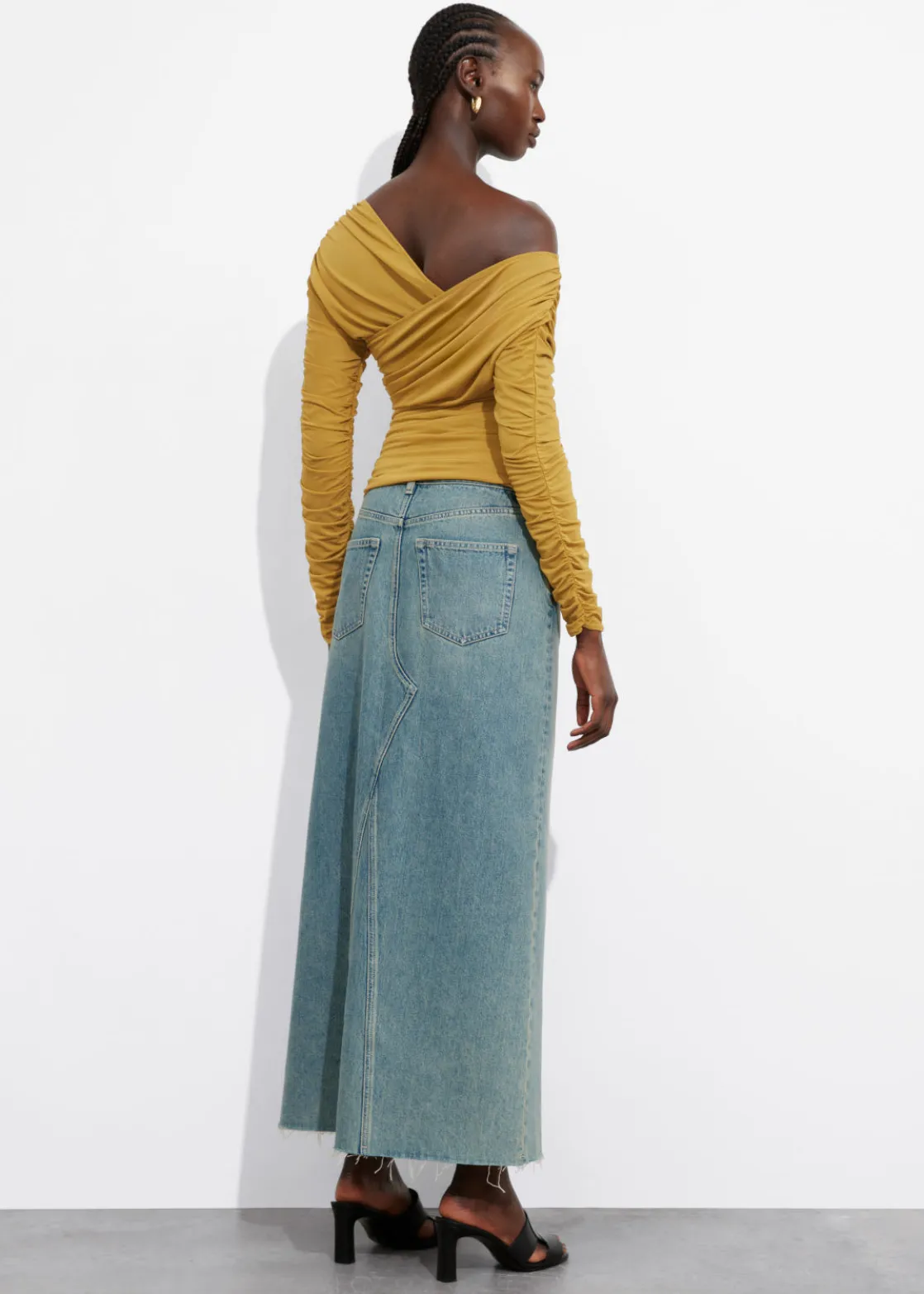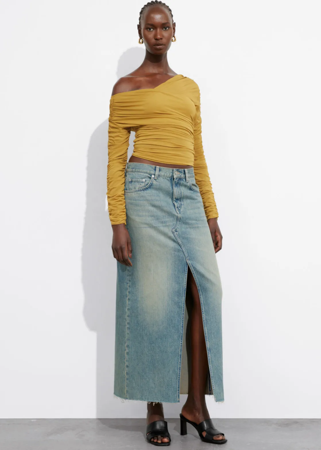 Long-sleeve top featuring a one-shoulder finish and allover draped detailing.