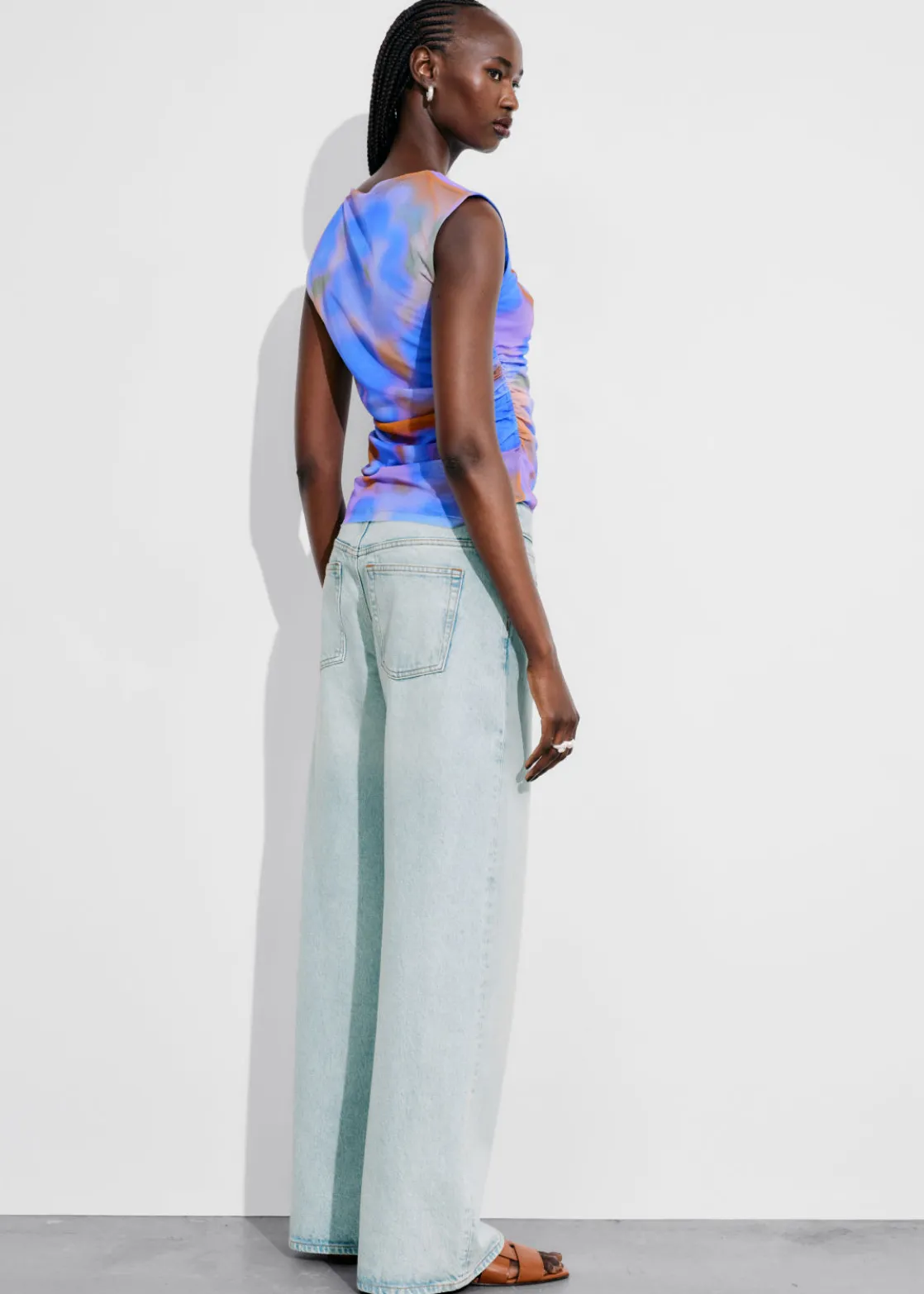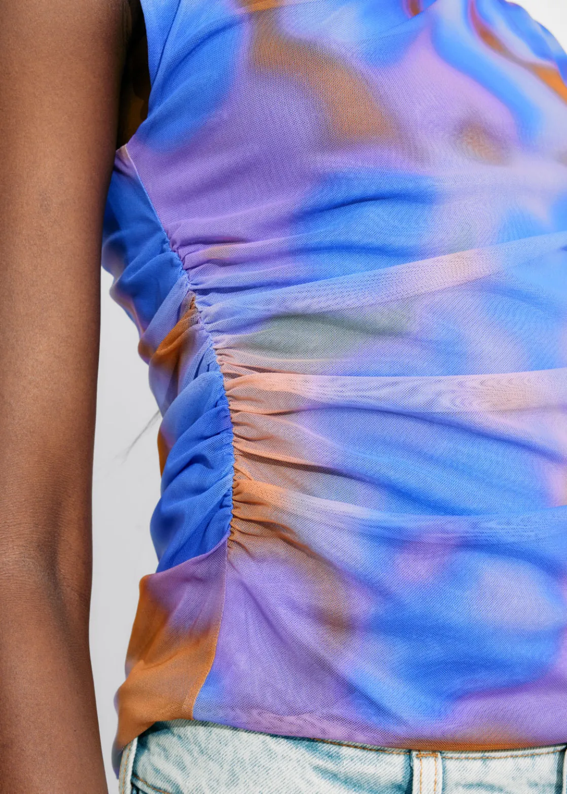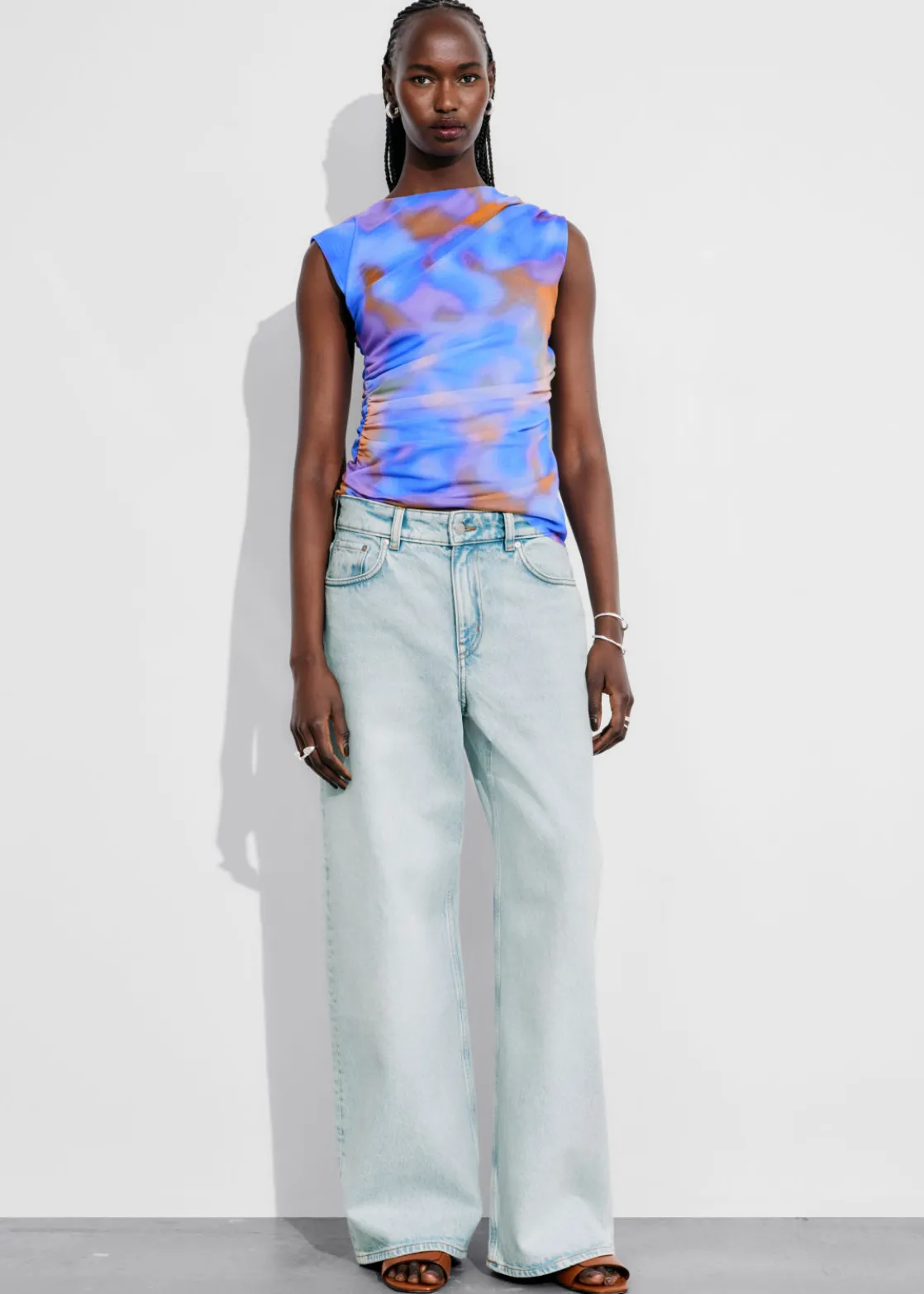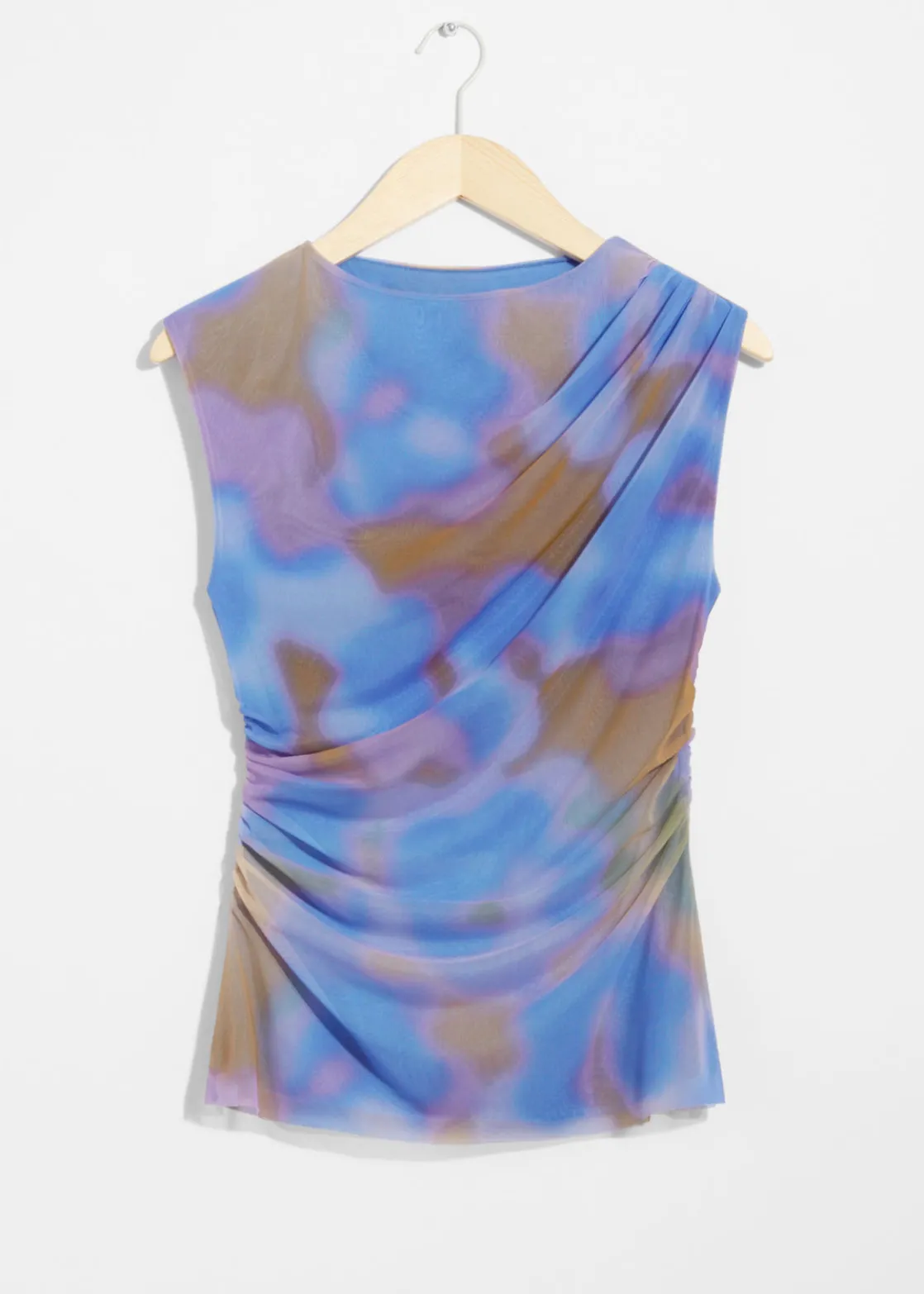 Sleeveless printed top with a draped finish.