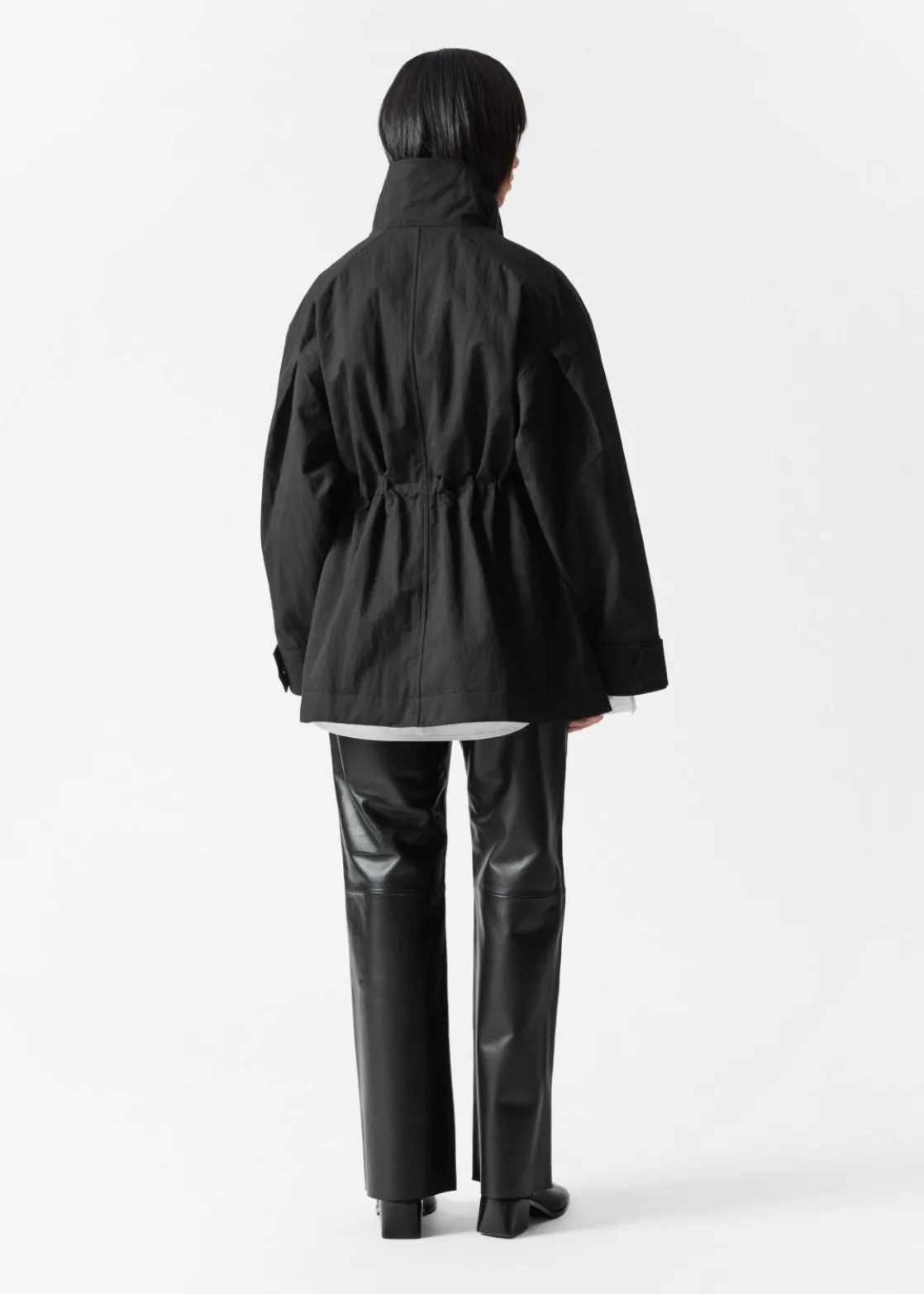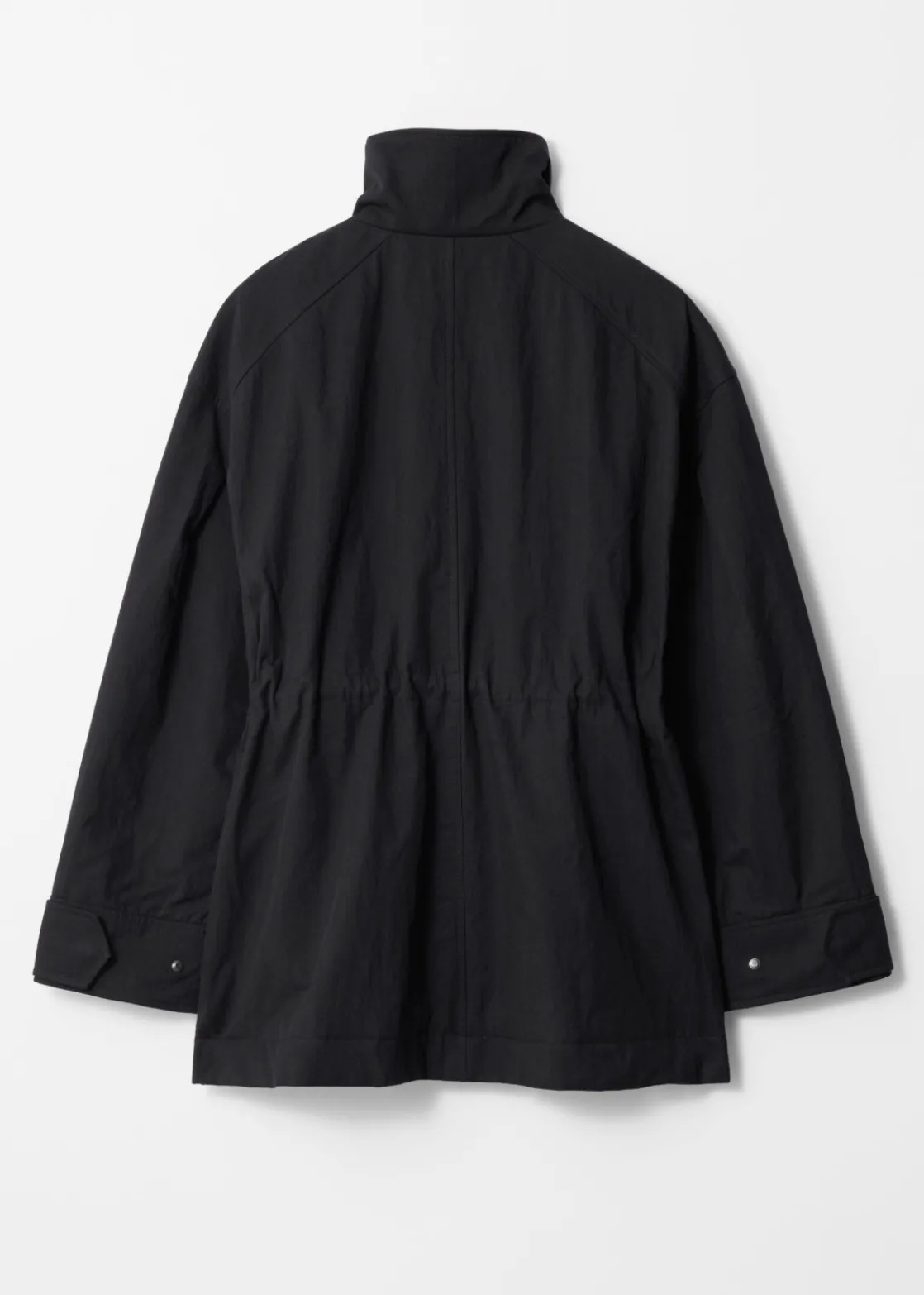 Jacket featuring designed with a high collar. Featuring a concealed zipper and snap button closures.