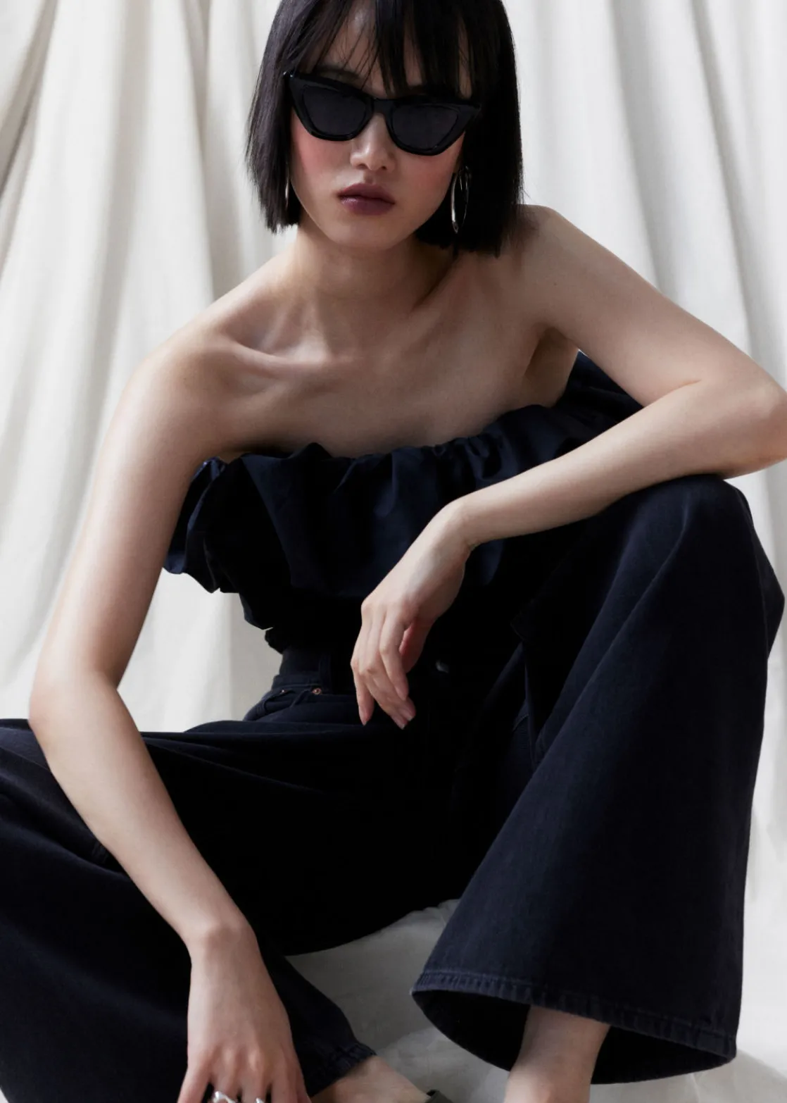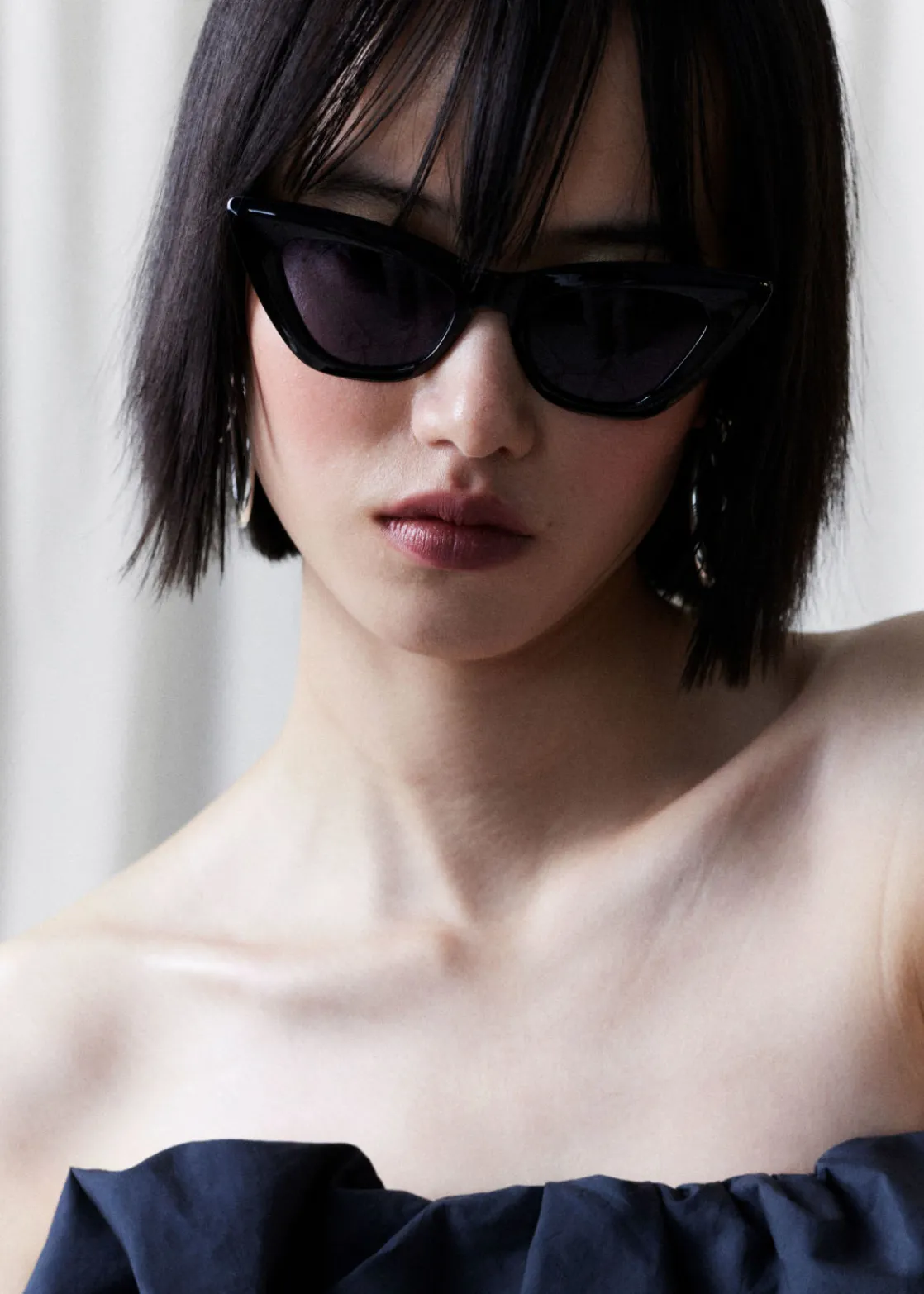 Cat-eye sunglasses are an invariable classic. These have black lenses that match the glossy angular frames.