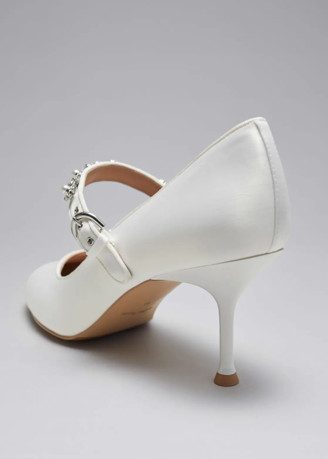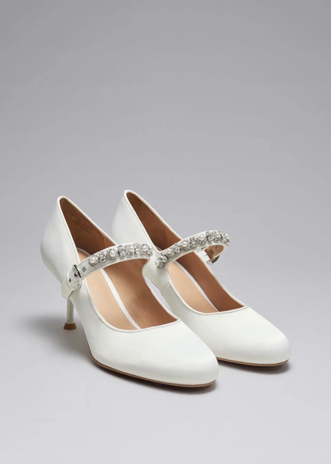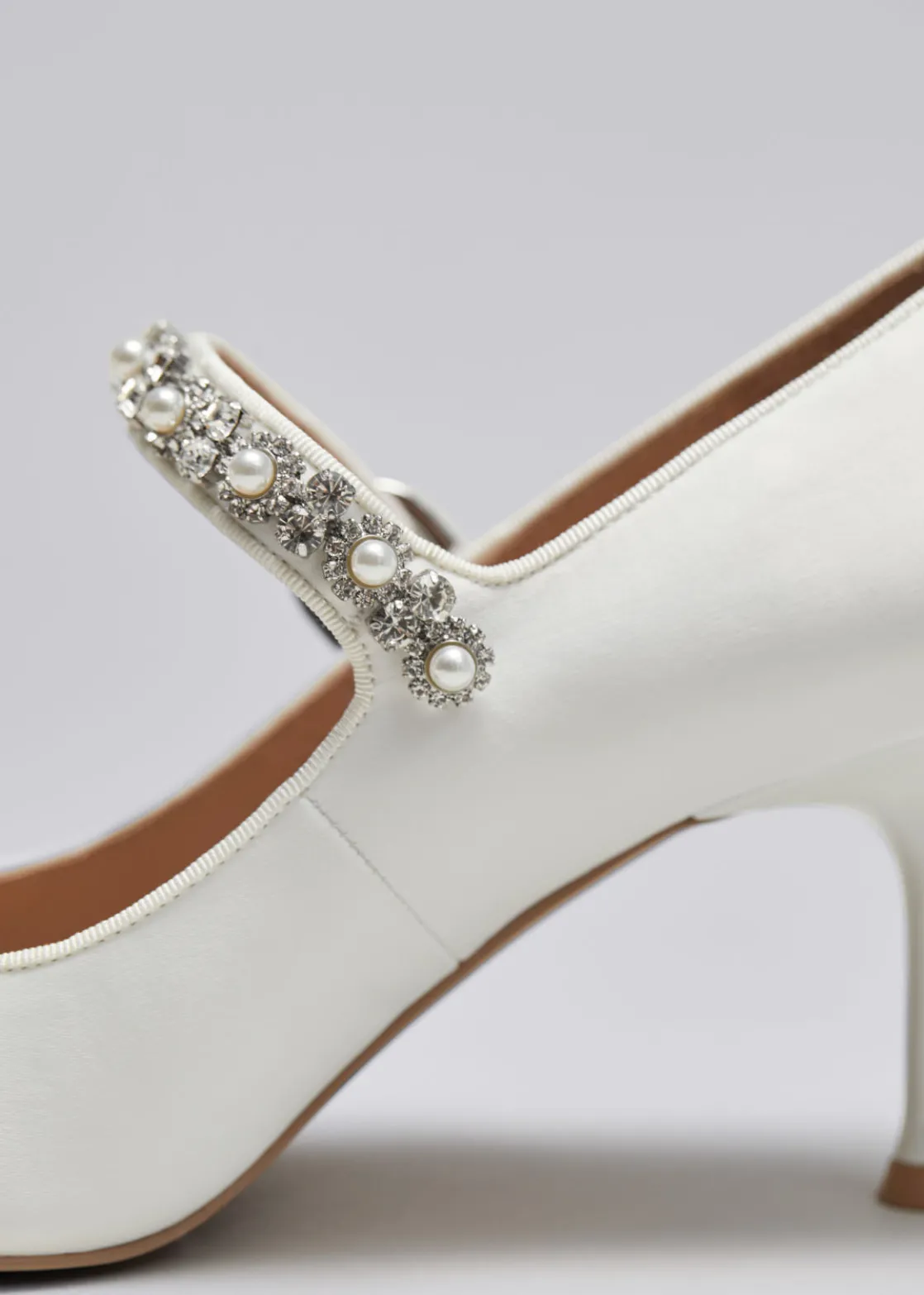 These Mary Jane style pumps have been crafted from lustrous satin and topped with crystals and pearls. They’re lined and soled in smooth leather for comfort and longevity.