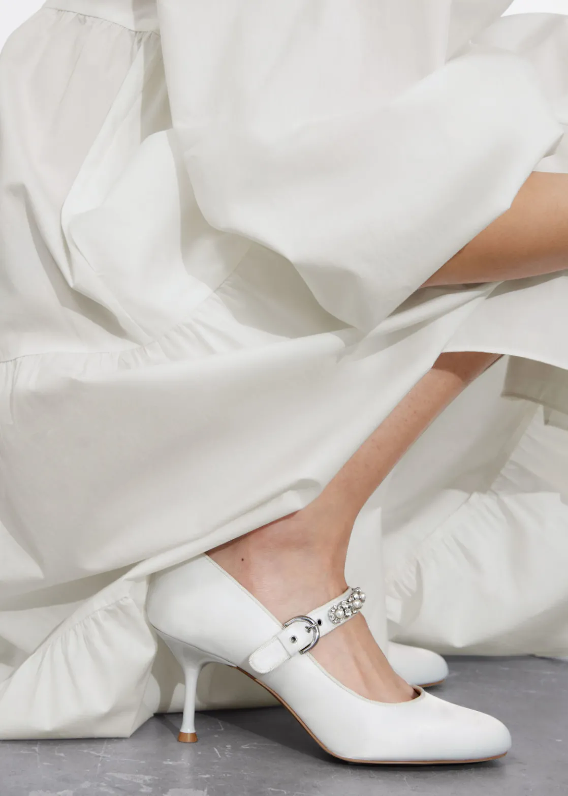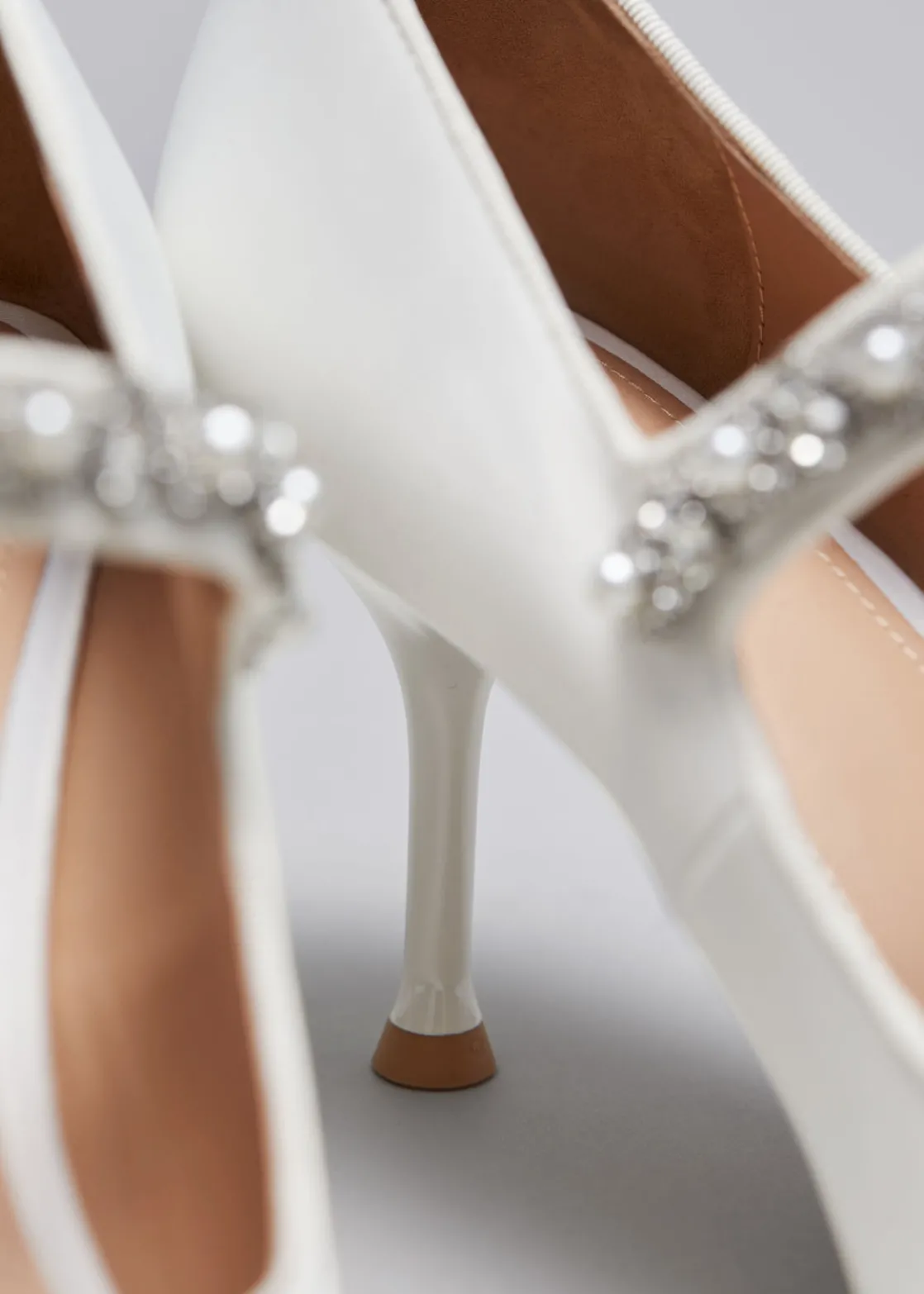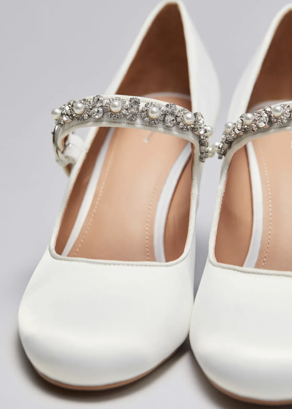 These Mary Jane style pumps have been crafted from lustrous satin and topped with crystals and pearls. They’re lined and soled in smooth leather for comfort and longevity.