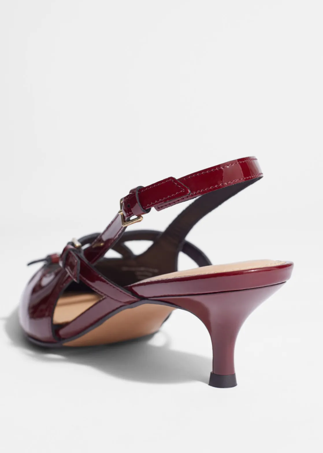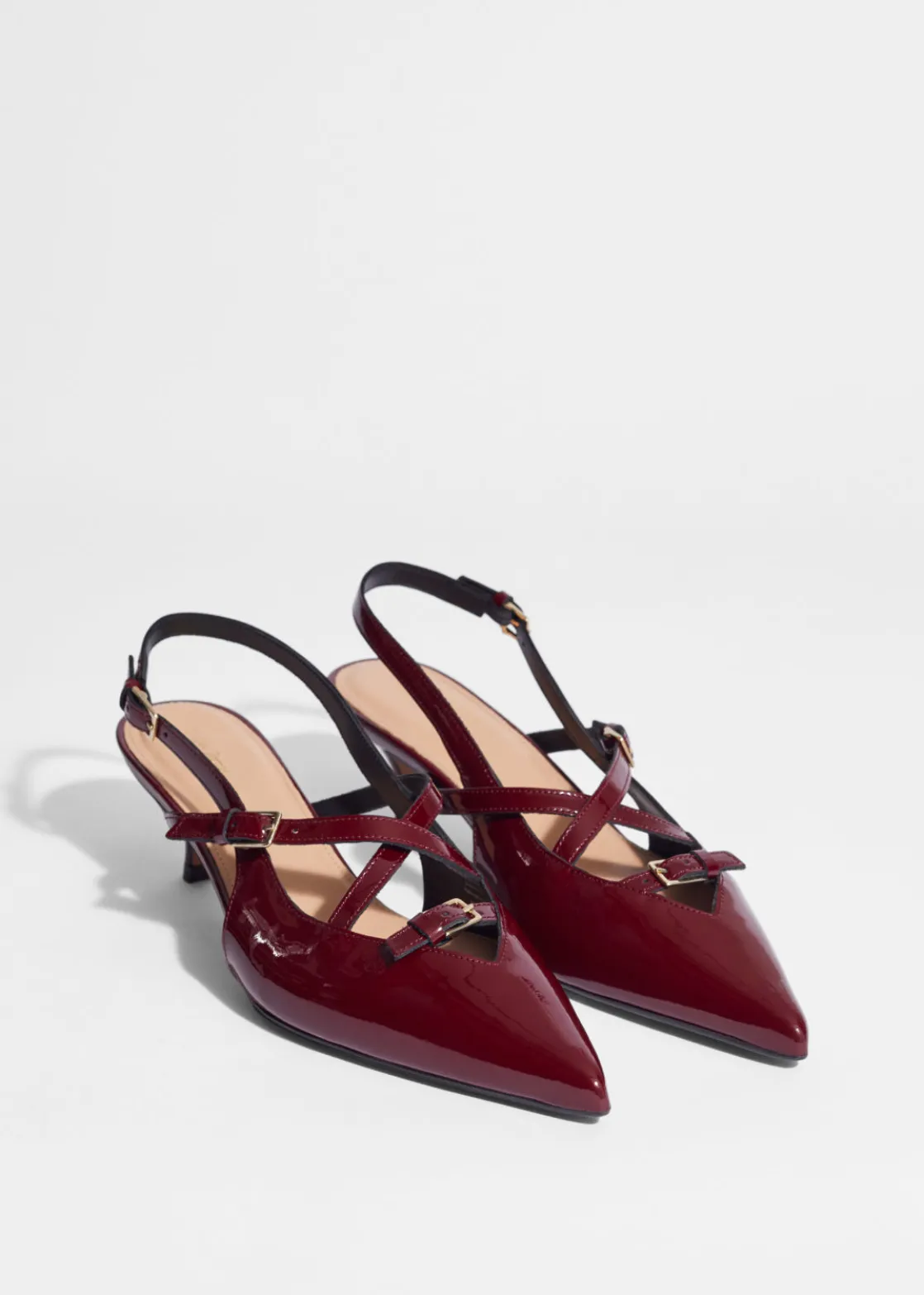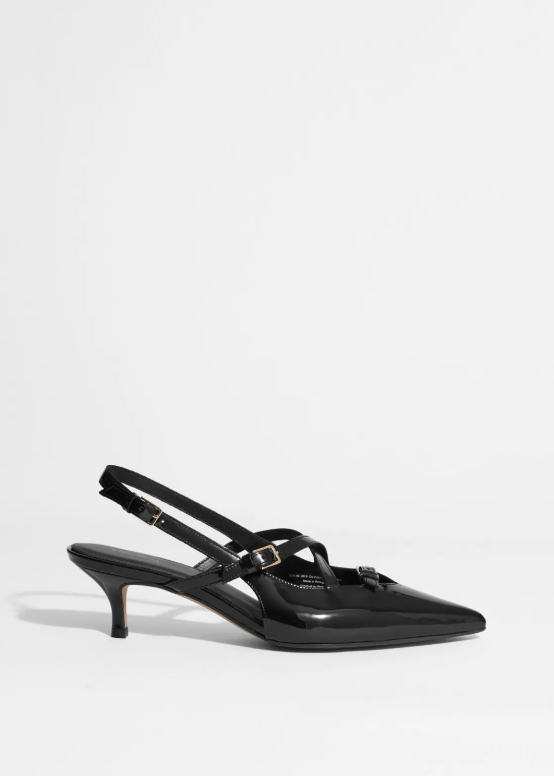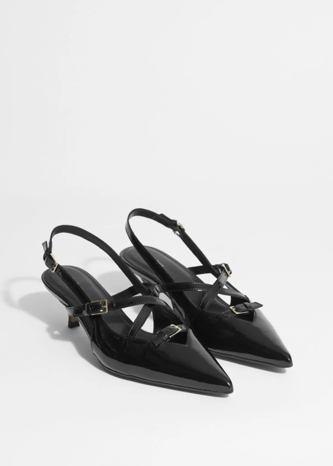These slingback pumps feature adjustable straps embellished with gold-tone buckles. They’ve been made in Portugal from glossy patent leather and have pointed toes. The 45mm kitten heels add just the right amount of lift.