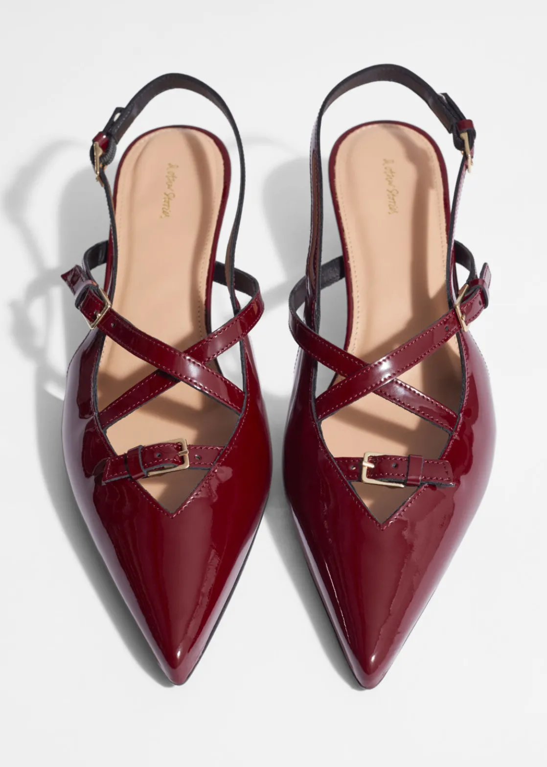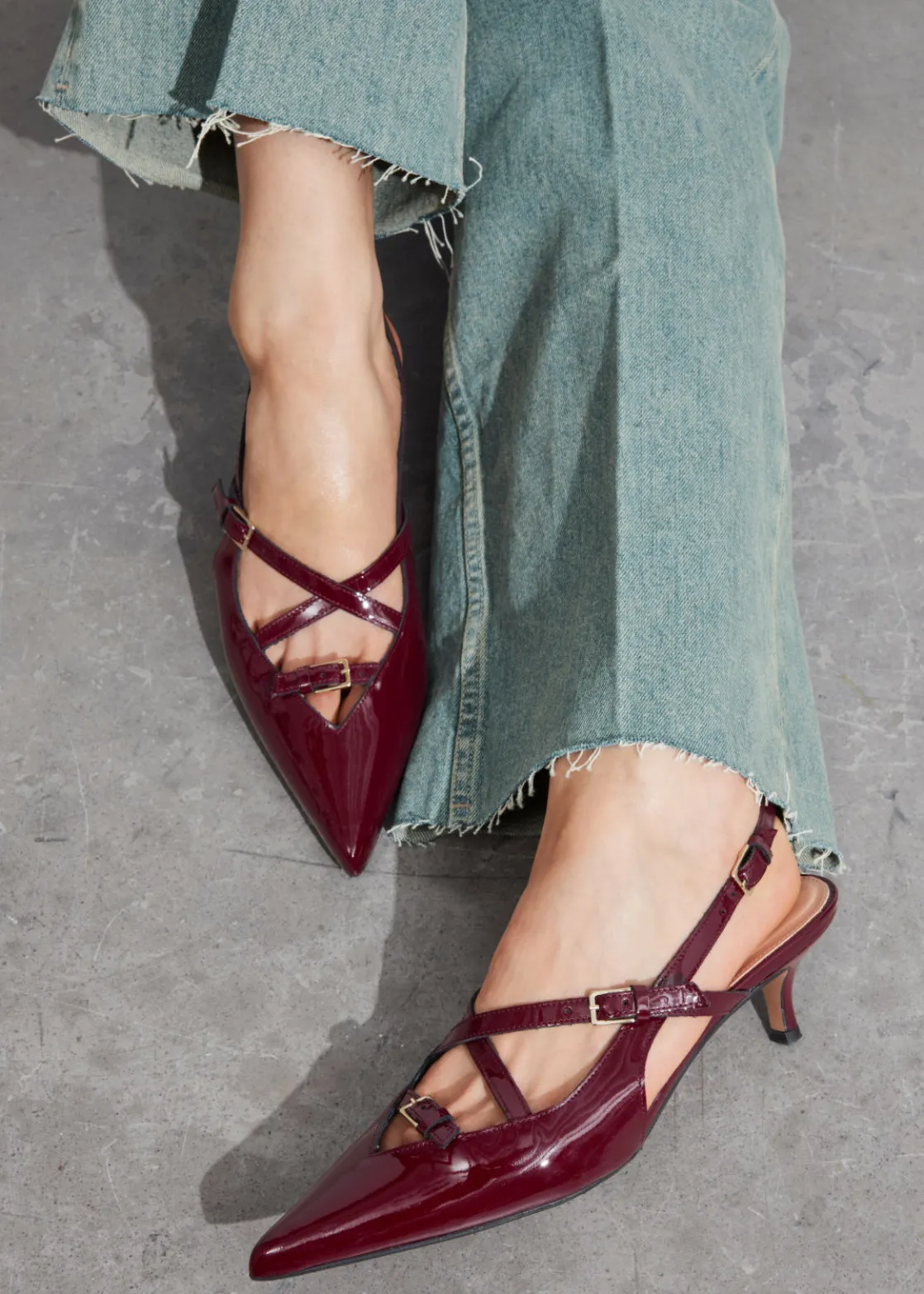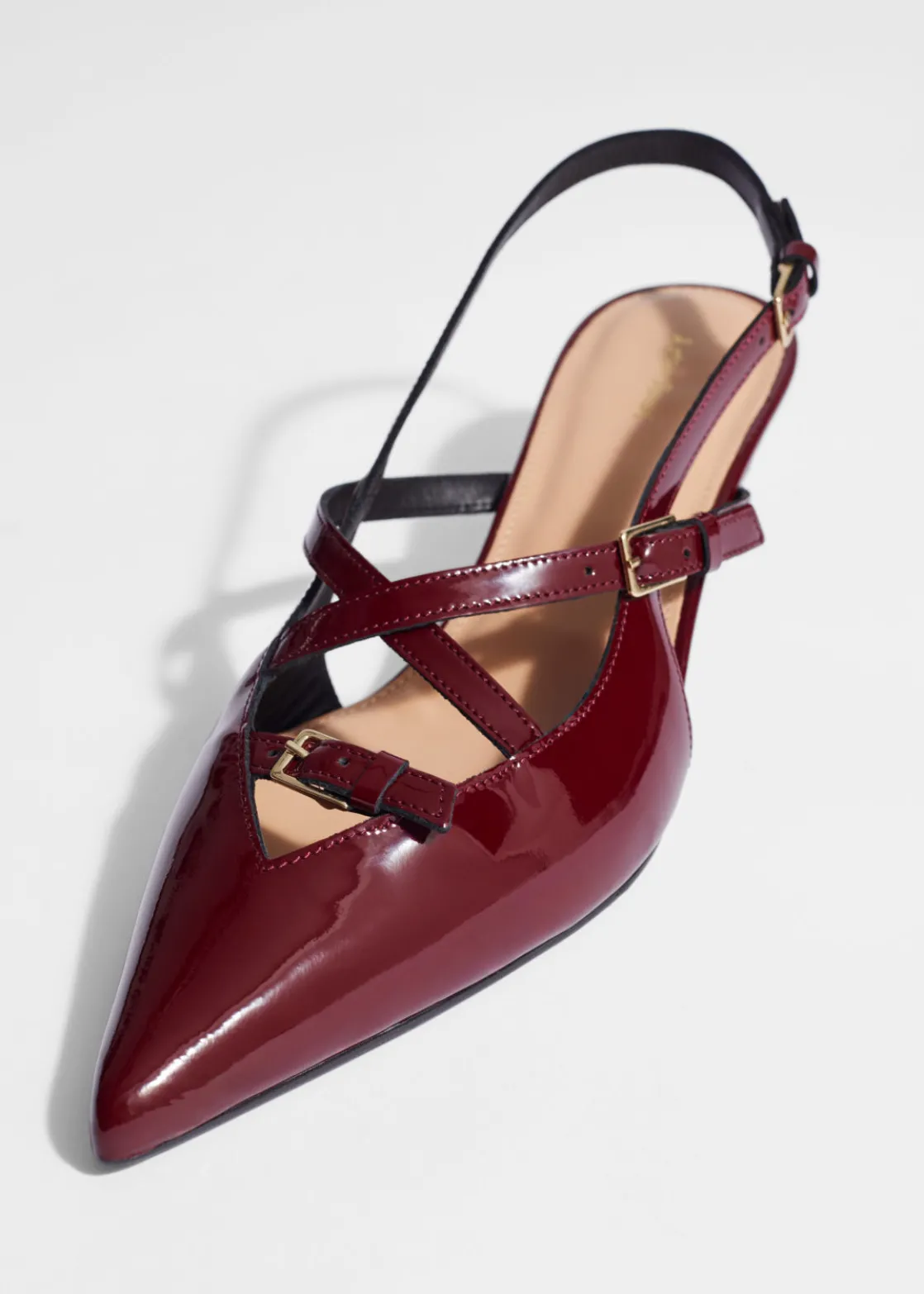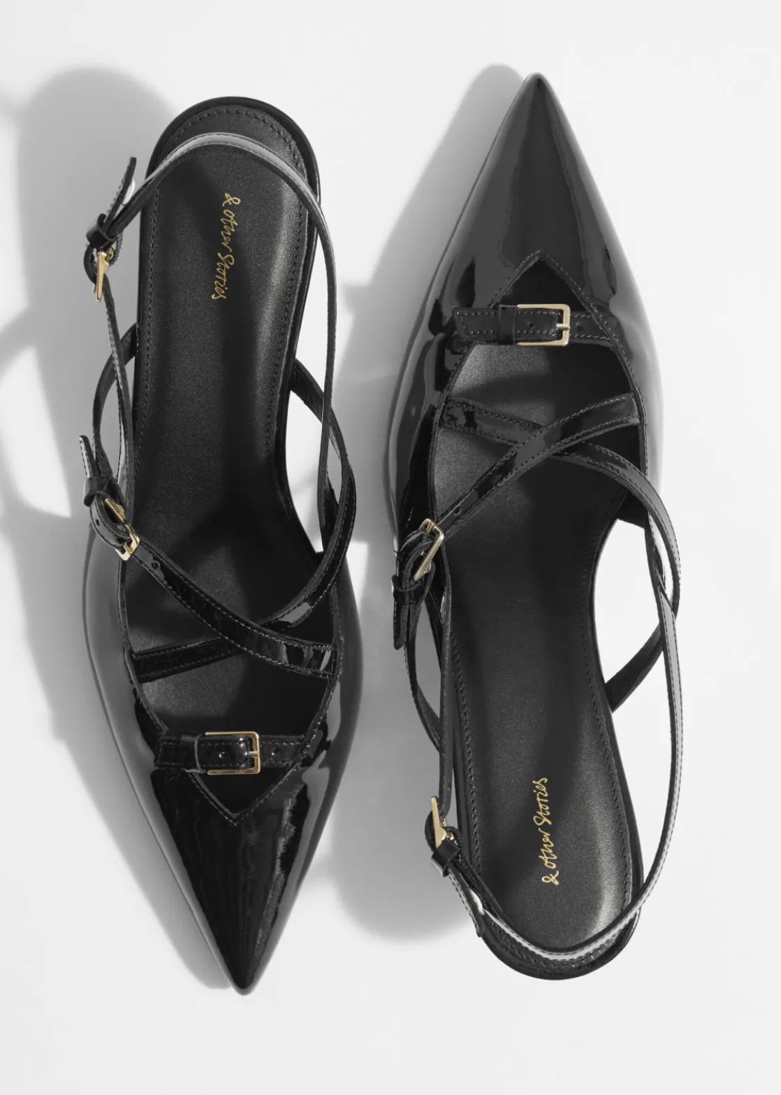These slingback pumps feature adjustable straps embellished with gold-tone buckles. They’ve been made in Portugal from glossy patent leather and have pointed toes. The 45mm kitten heels add just the right amount of lift.