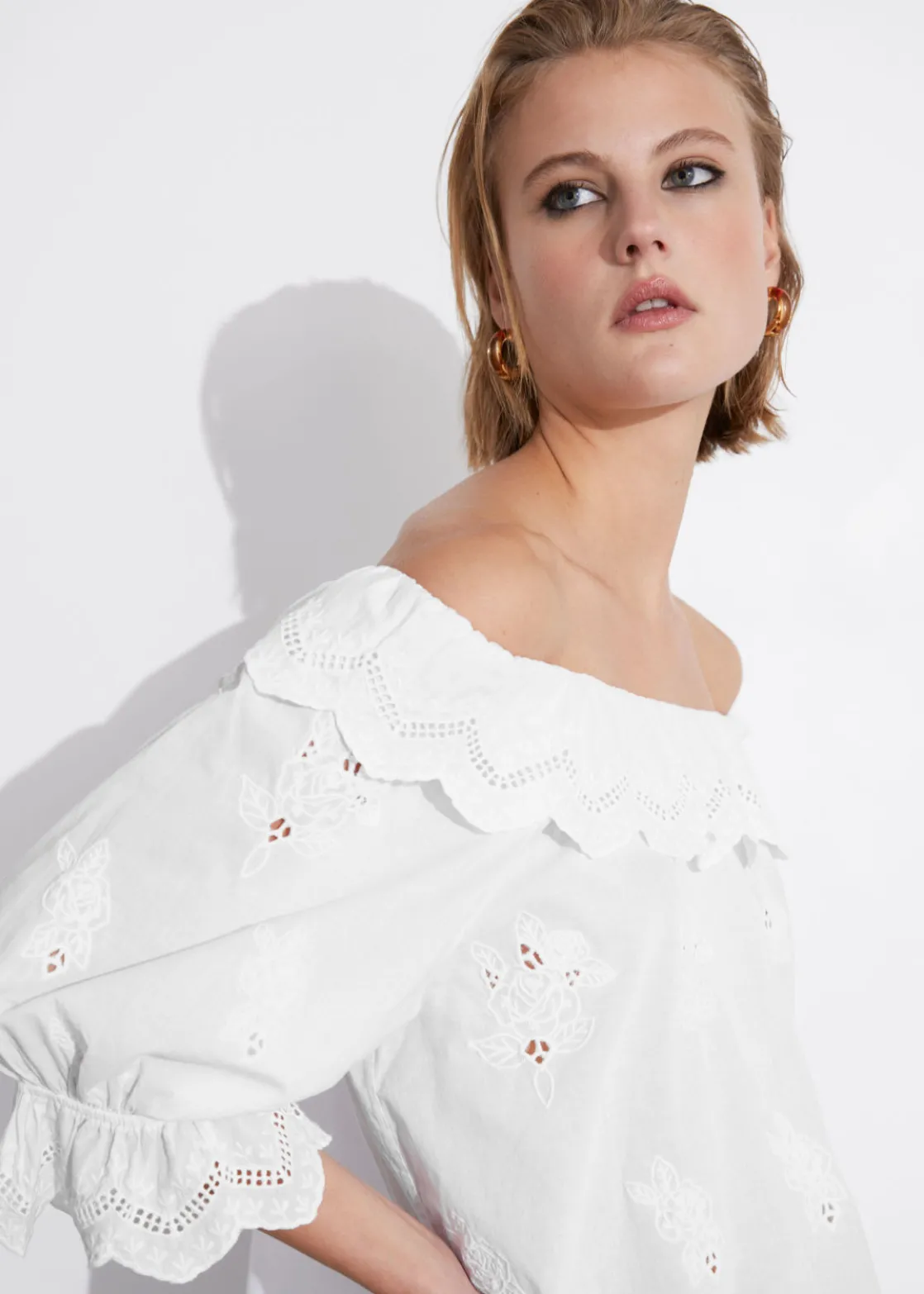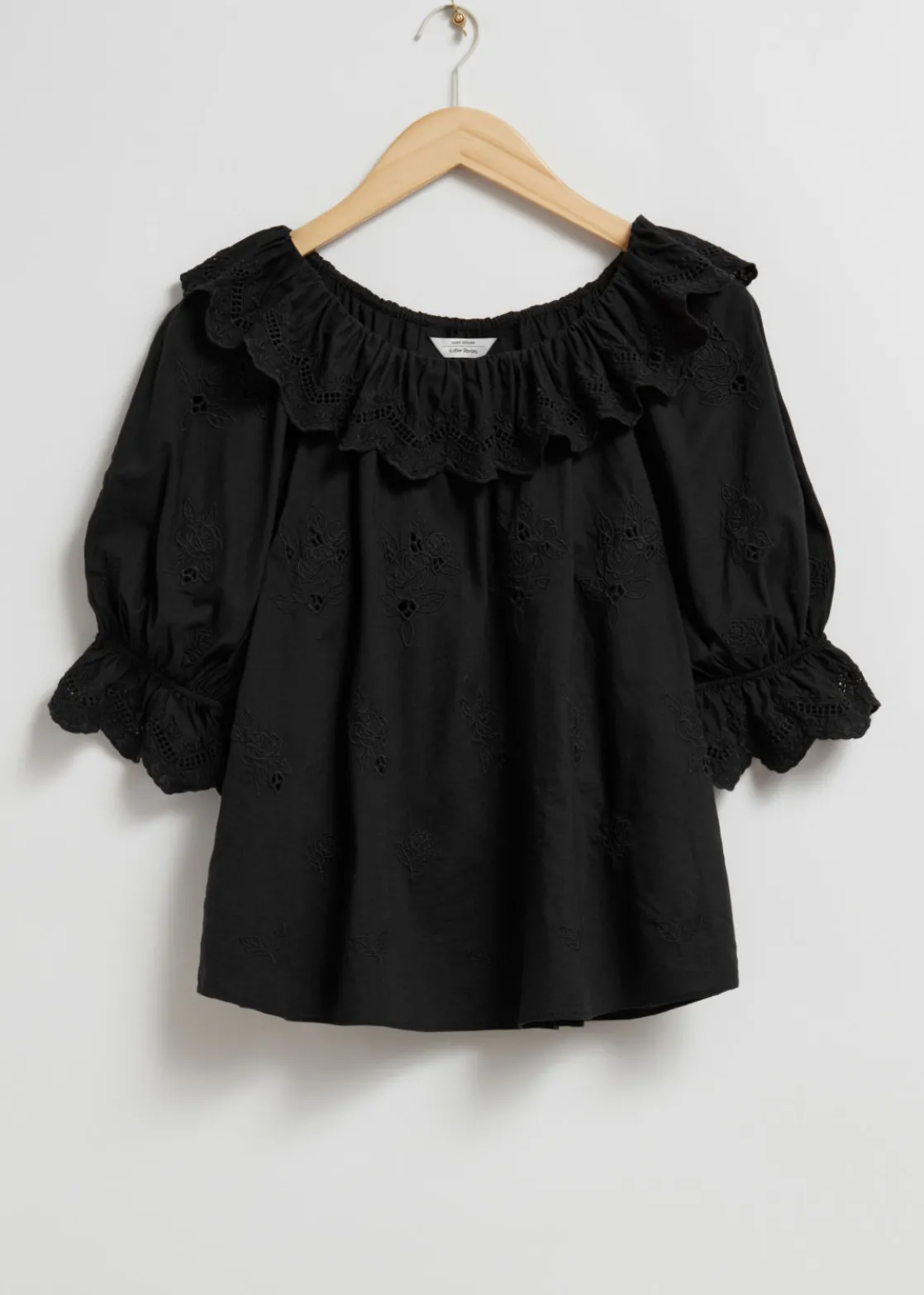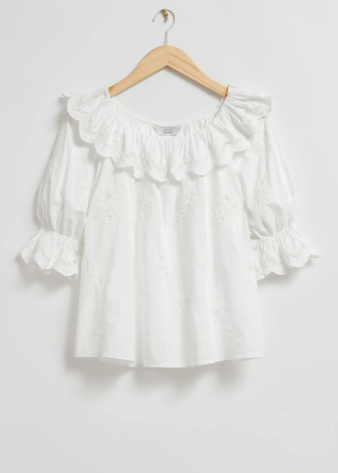 Embroidered blouse designed with a frilled, peter-pan style collar with a scooped neckline and short three-quarter-length scalloped sleeves in a loose-fitting silhouette.