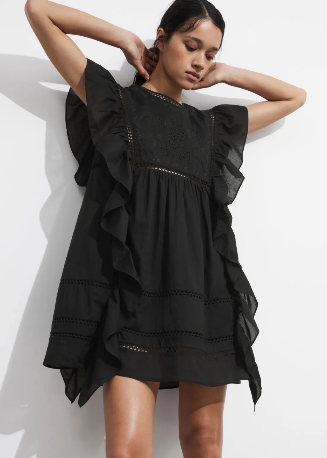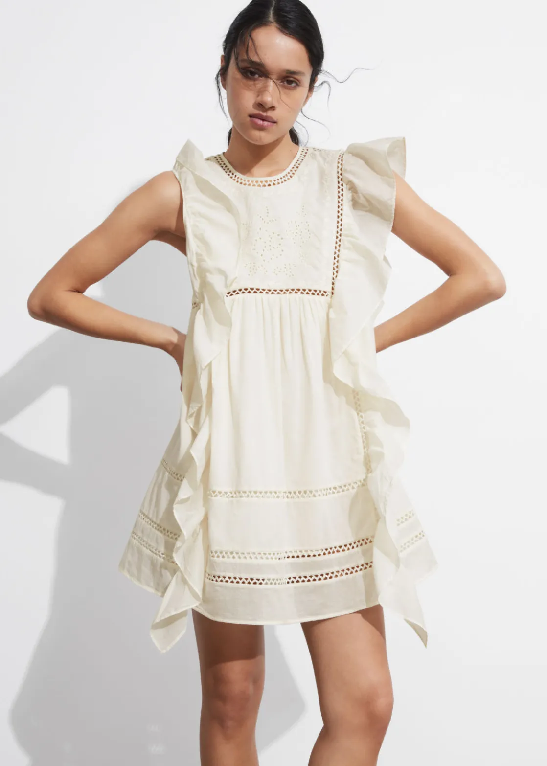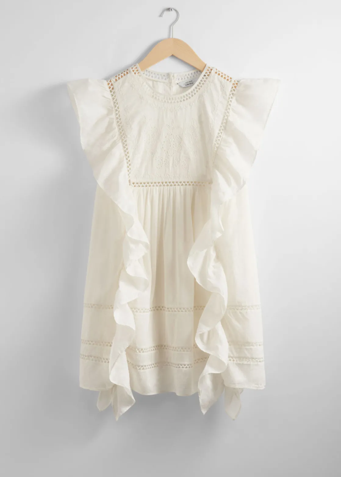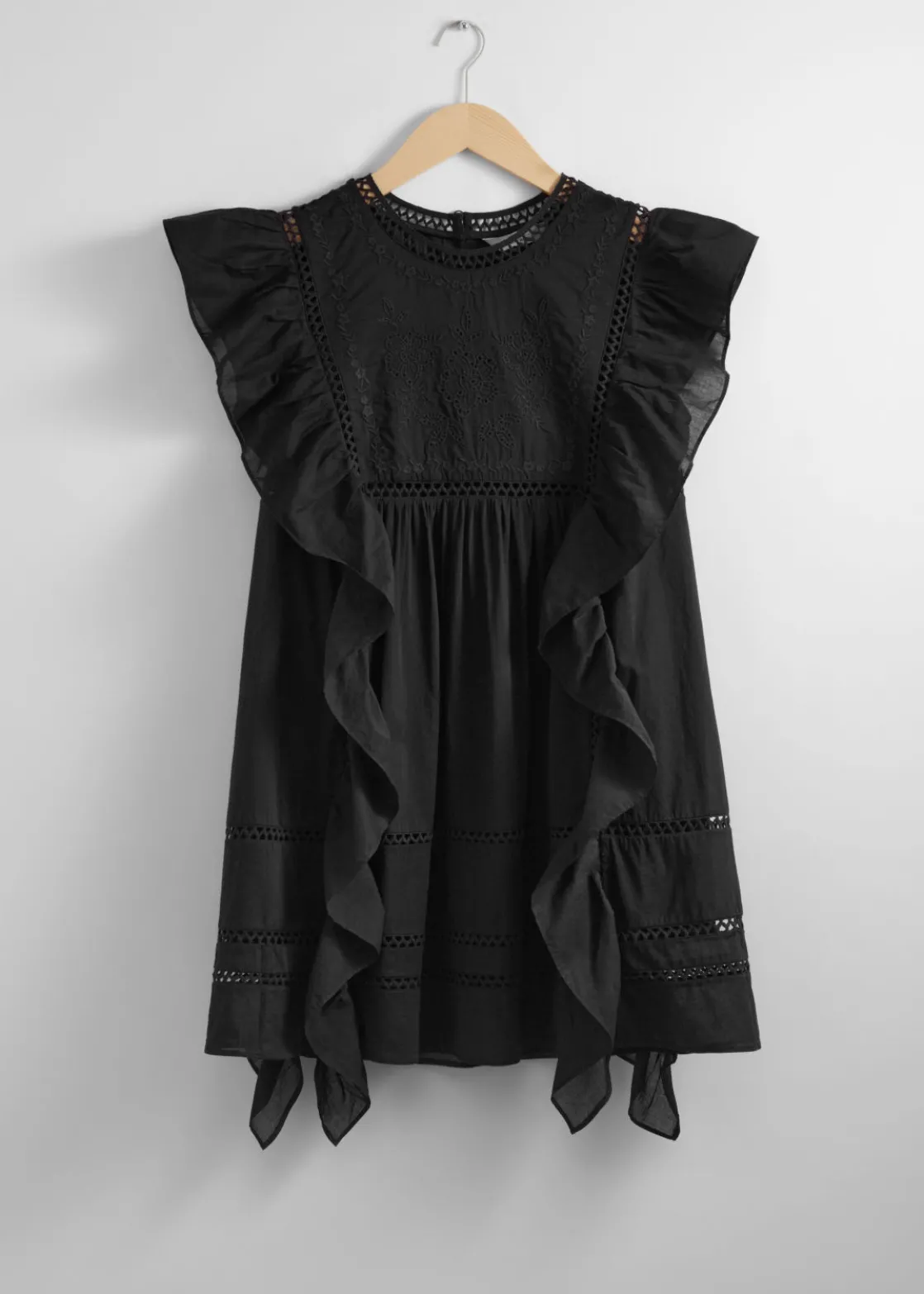 Mini dress featuring floral embroidery at the chest. Traced with cascading ruffles along the shoulders and down the sides.