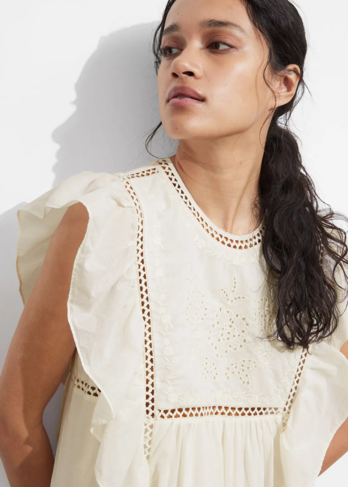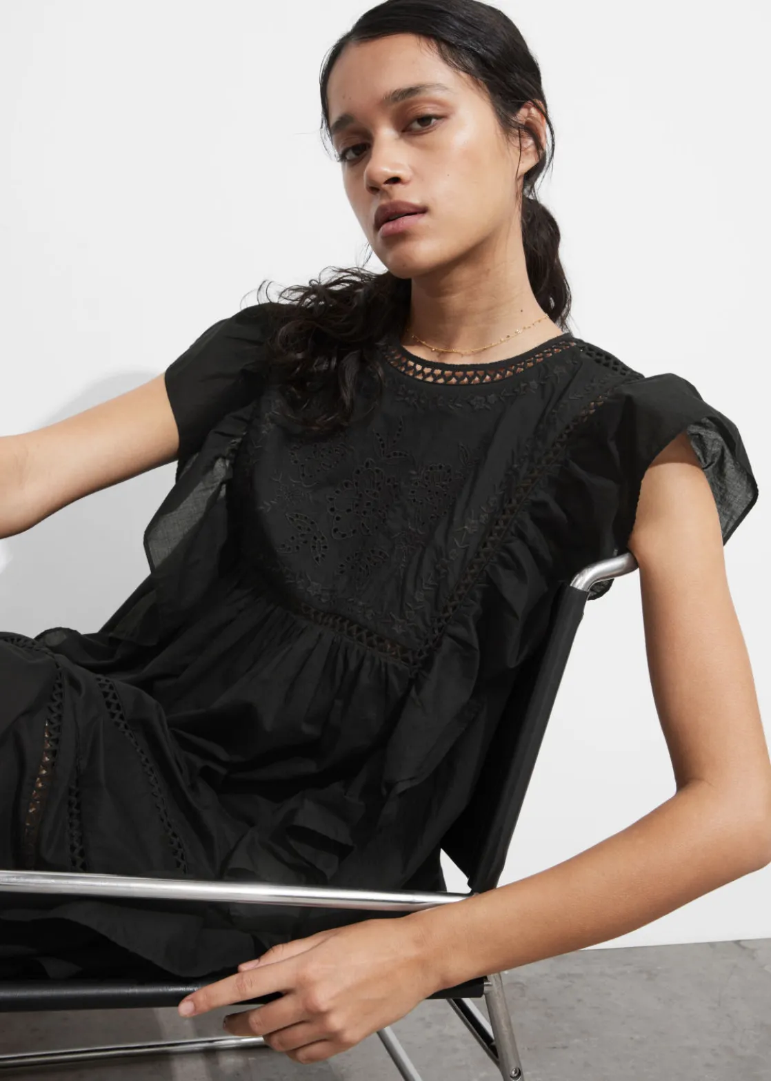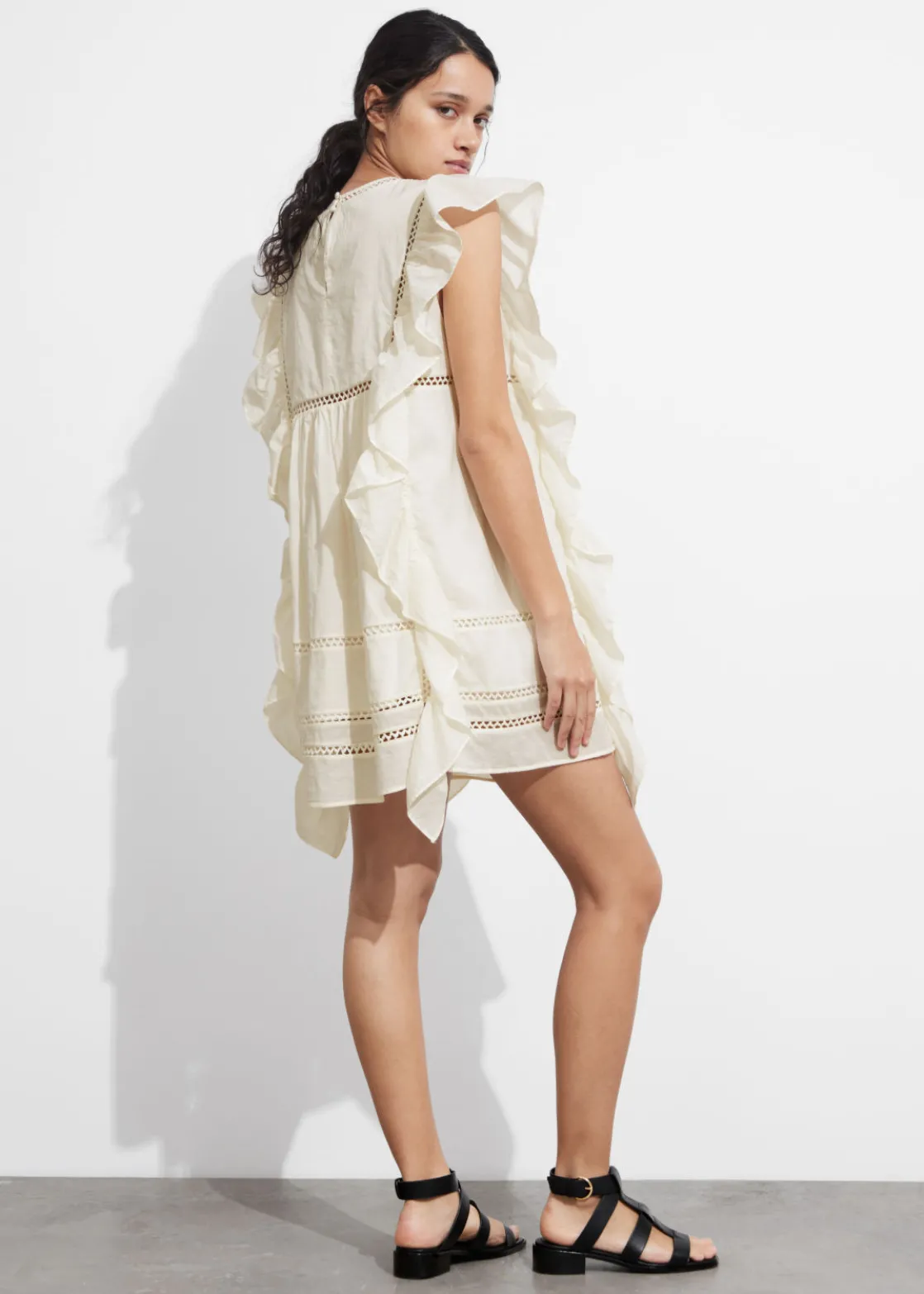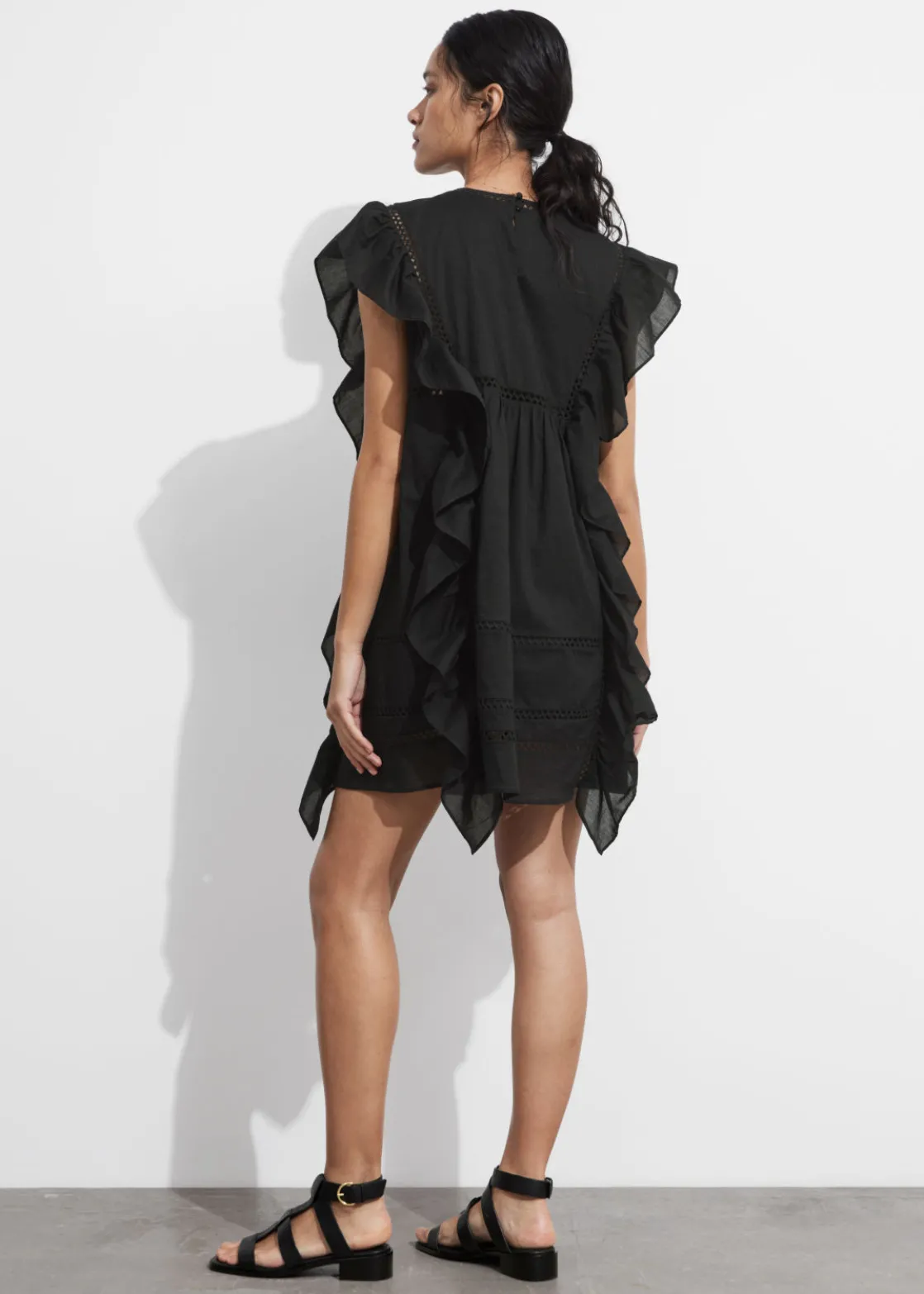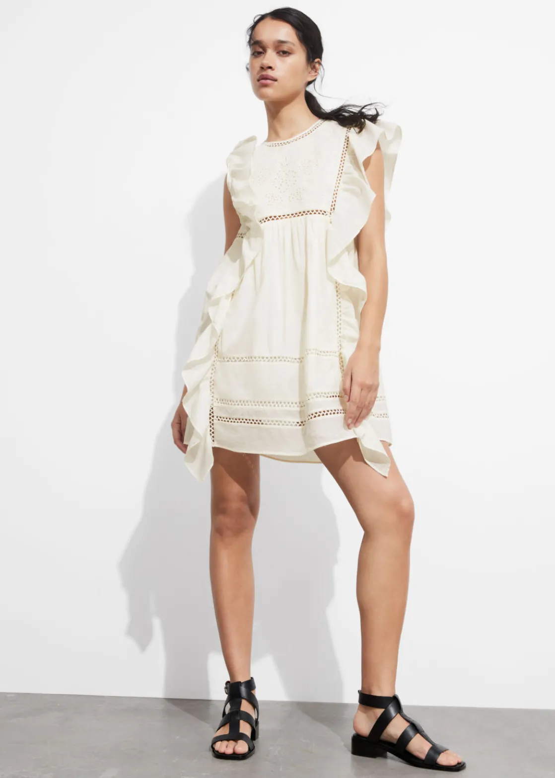 Mini dress featuring floral embroidery at the chest. Traced with cascading ruffles along the shoulders and down the sides.
