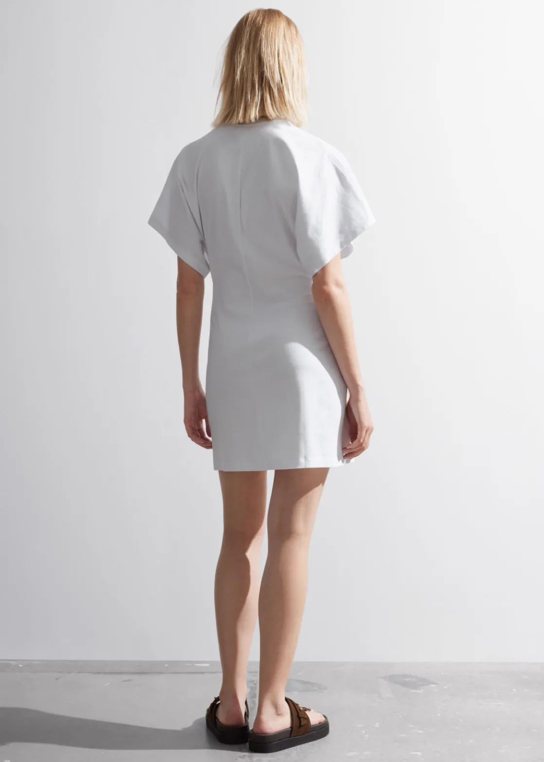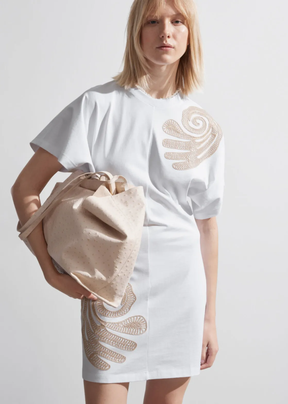 T-shirt mini dress featuring an accentuated waistline. Detailed with duo embroidered motifs.