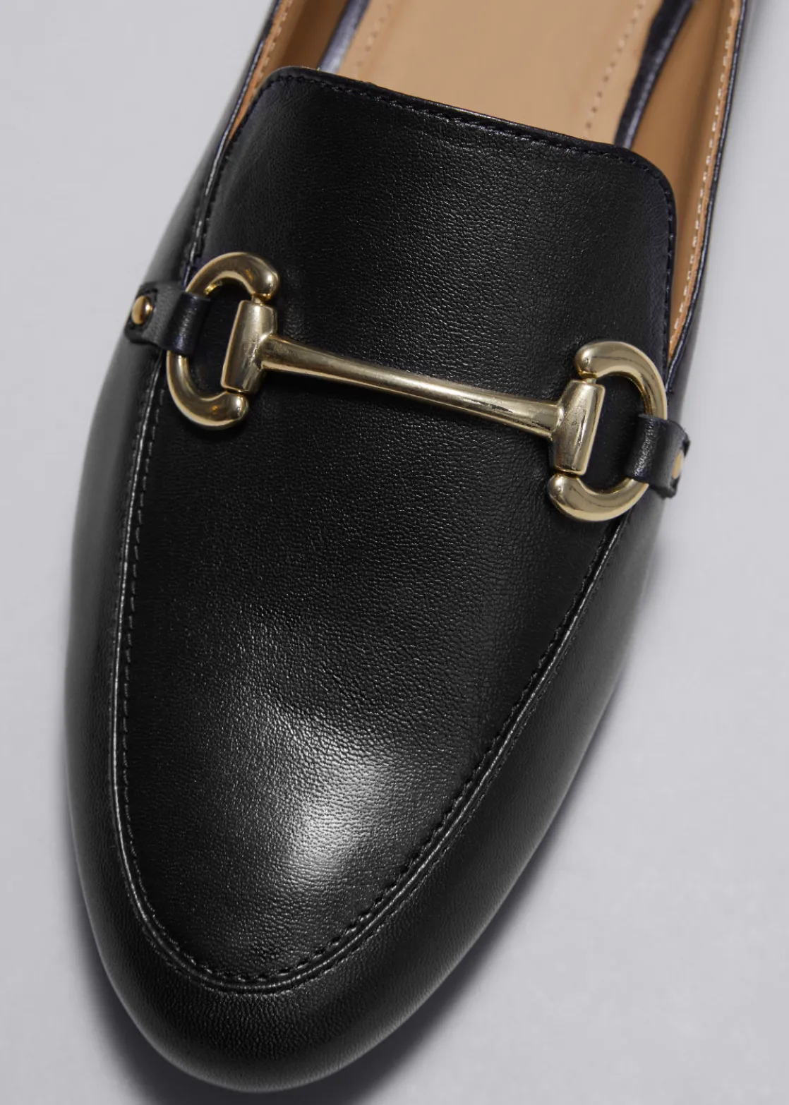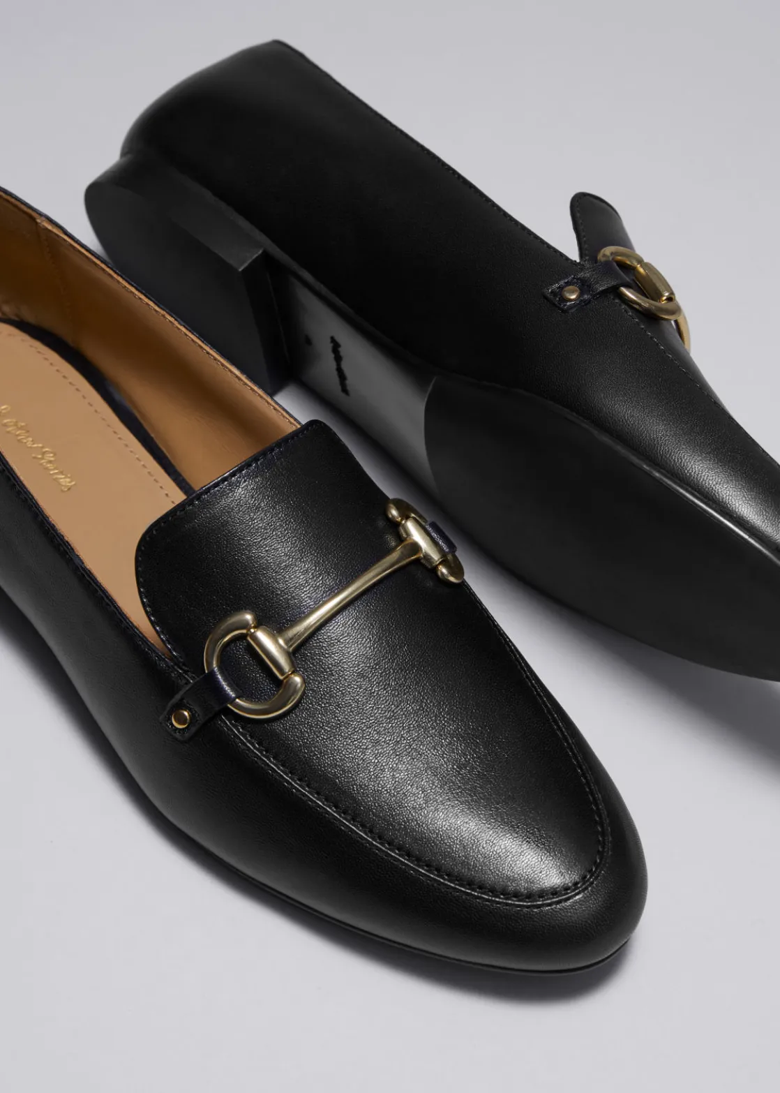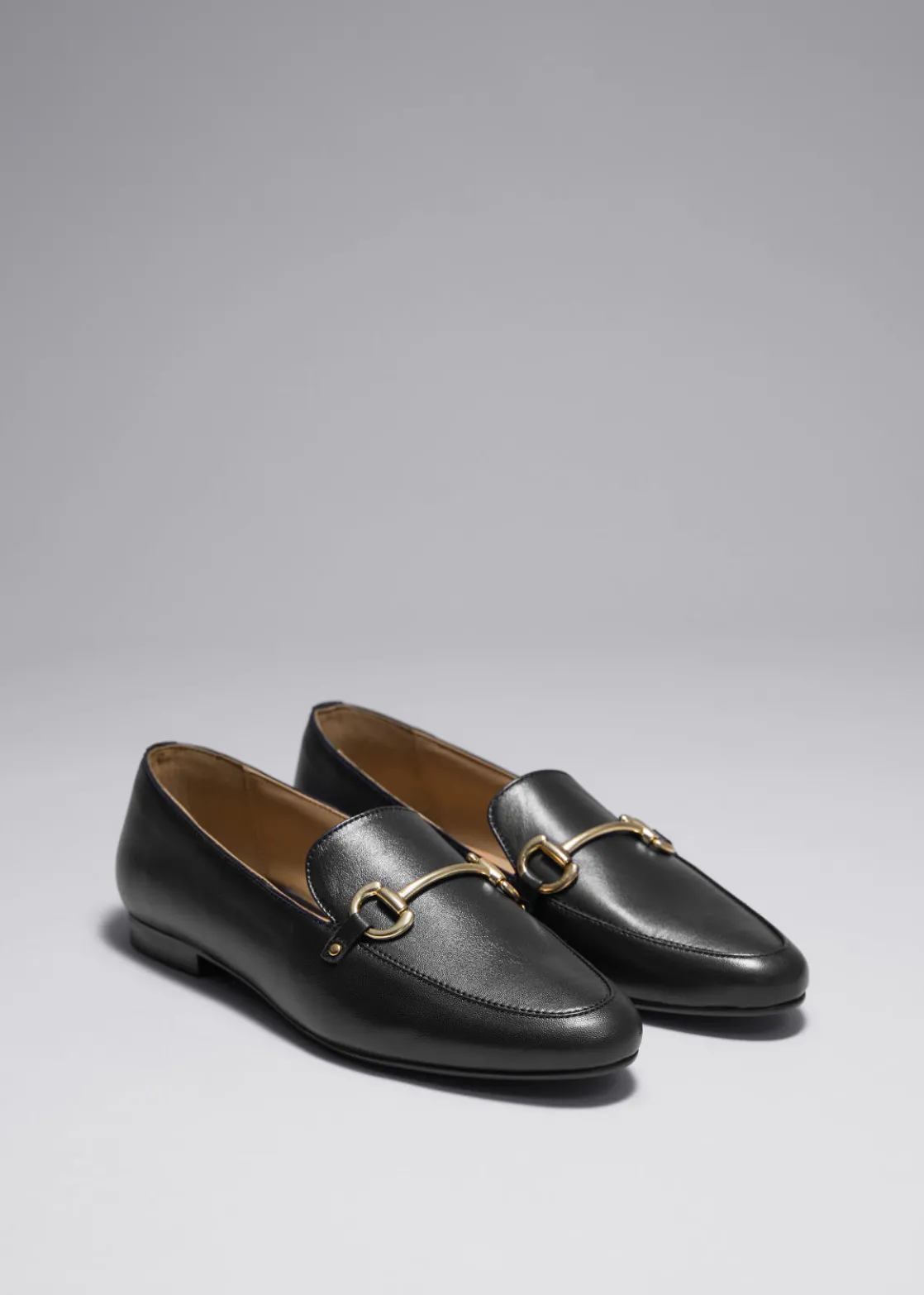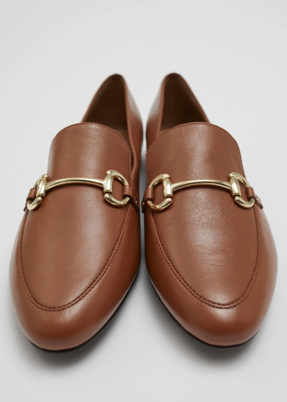 Leather loafers with an almond-shaped toe. Accented with a gold-toned buckle detail.