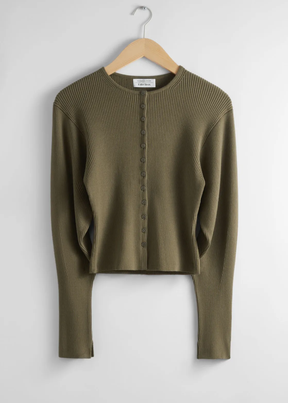 Ribbed knit cardigan featuring a fitted waistline and relaxed sleeves.