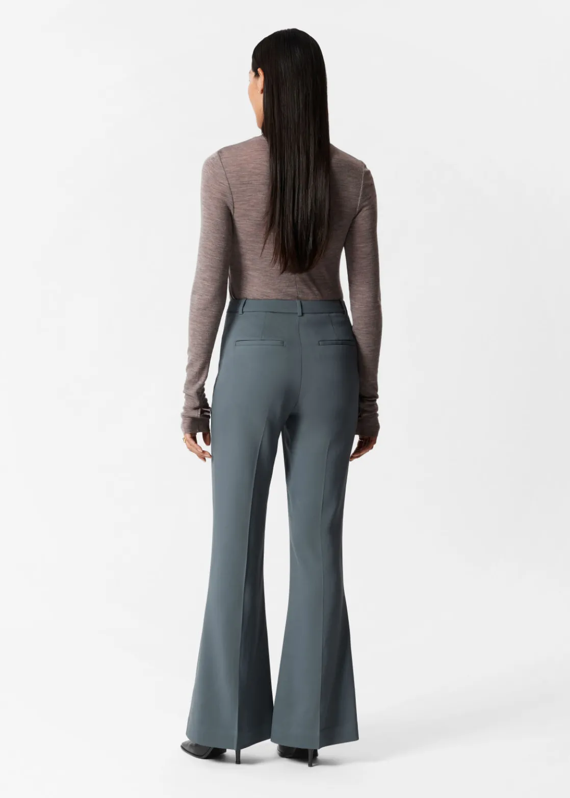 Trousers featuring a flared silhouette. Detailed with vertical pintucks along the legs.