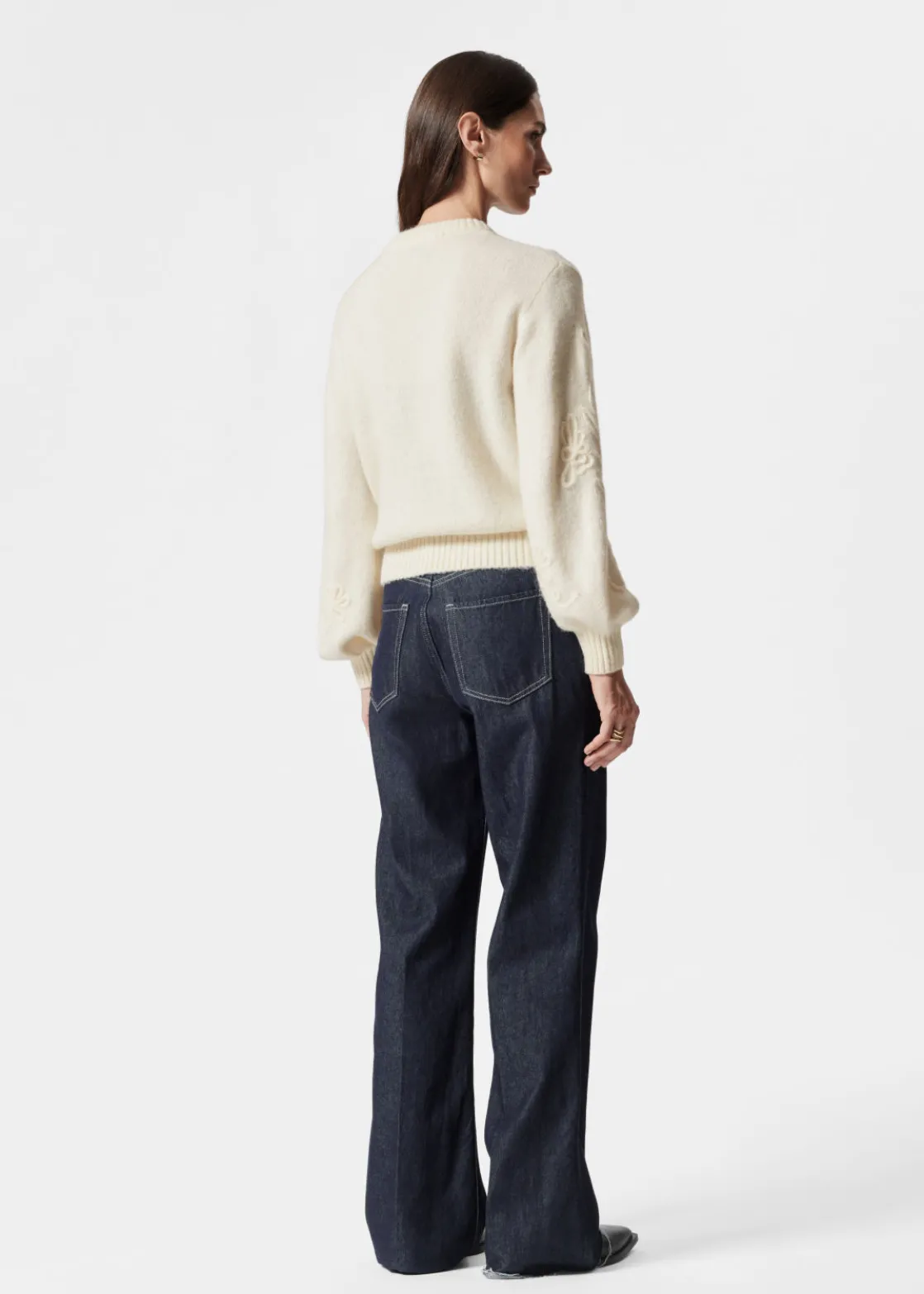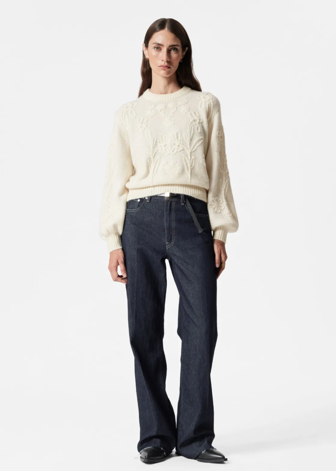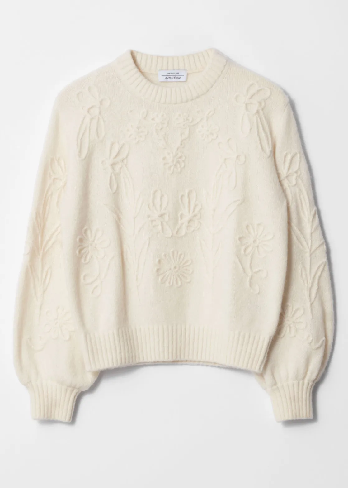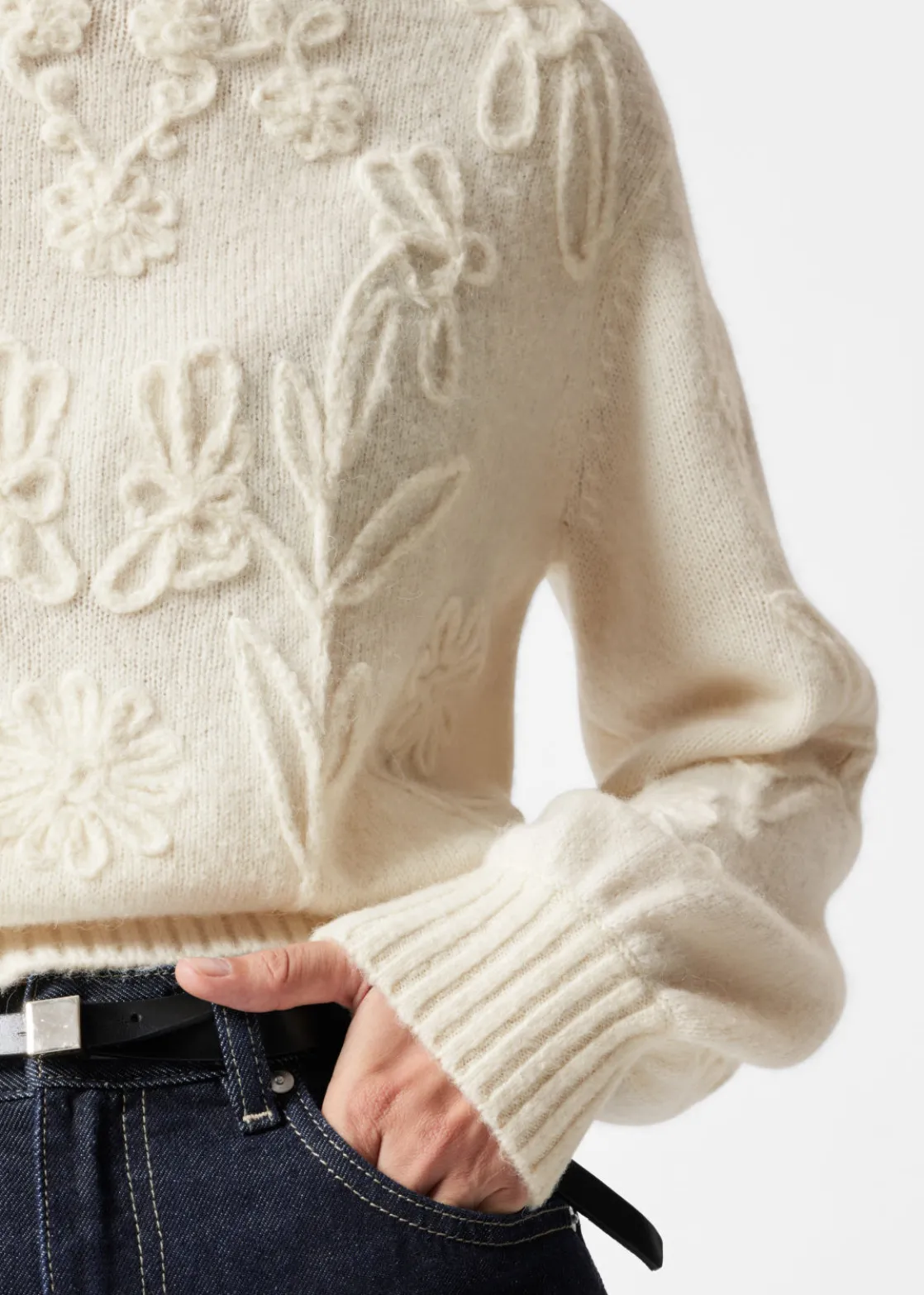 Long-sleeve jumper knitted from an alpaca and wool blend. Adorned with floral yarn appliqués.