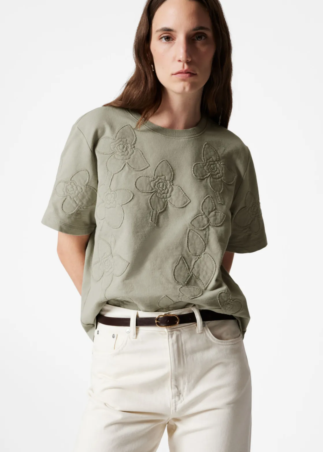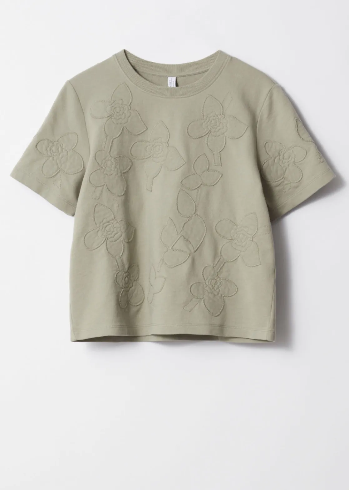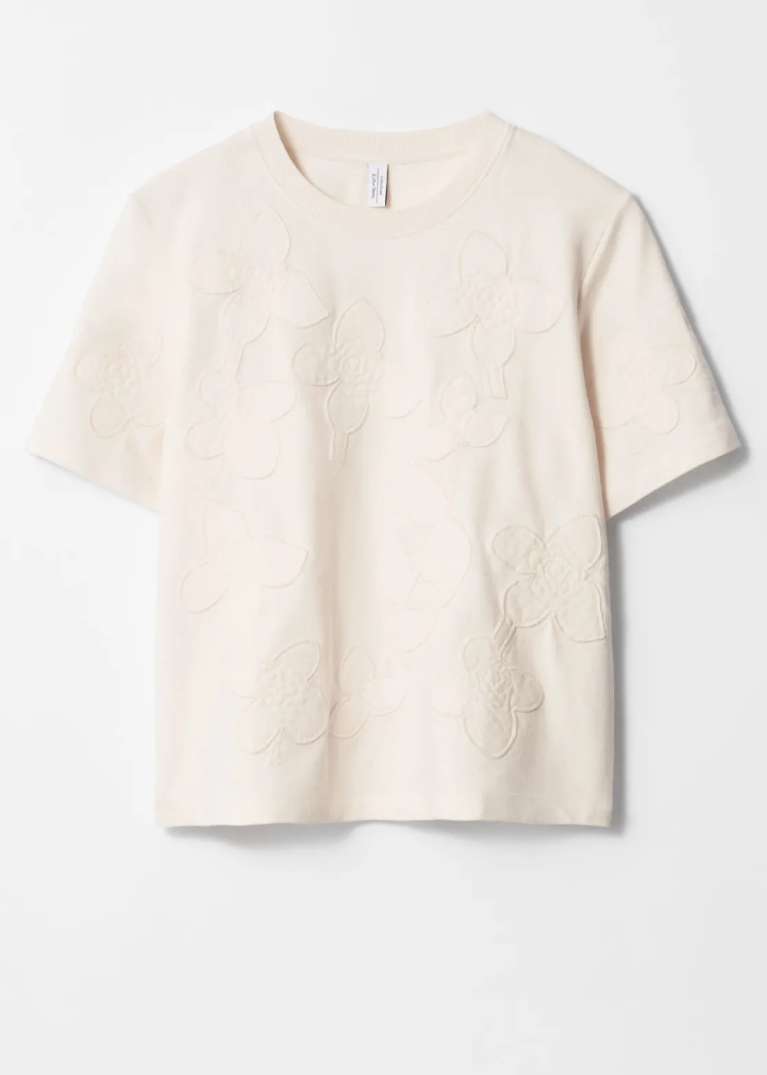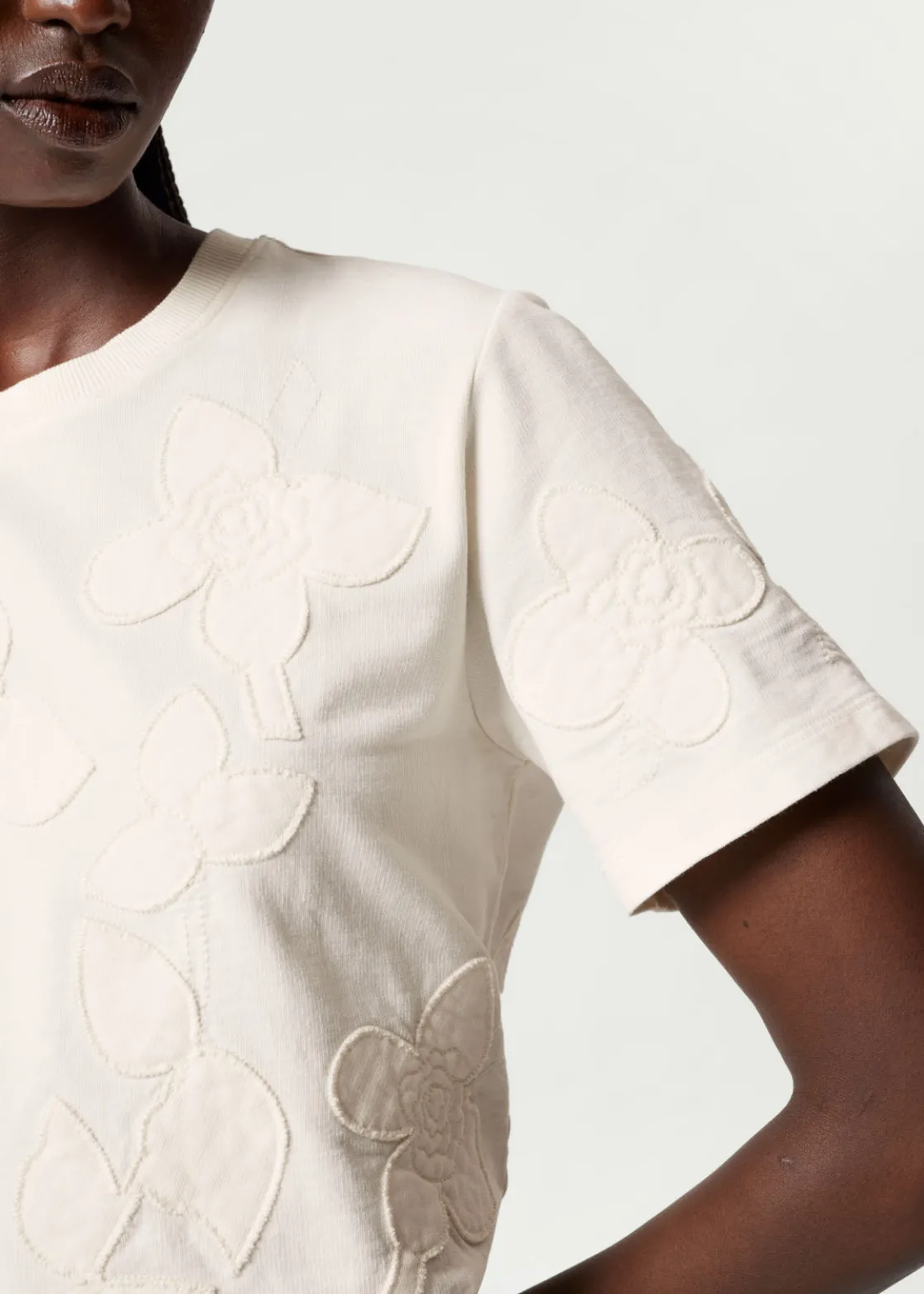 Boxy crewneck t-shirt featuring allover floral appliqué detailing.