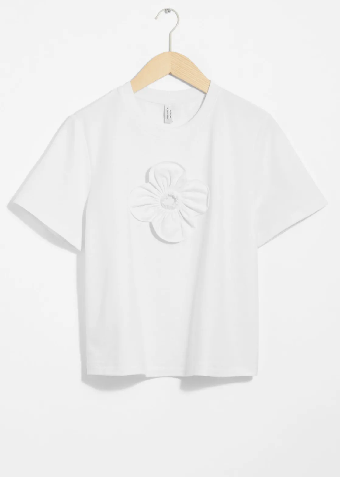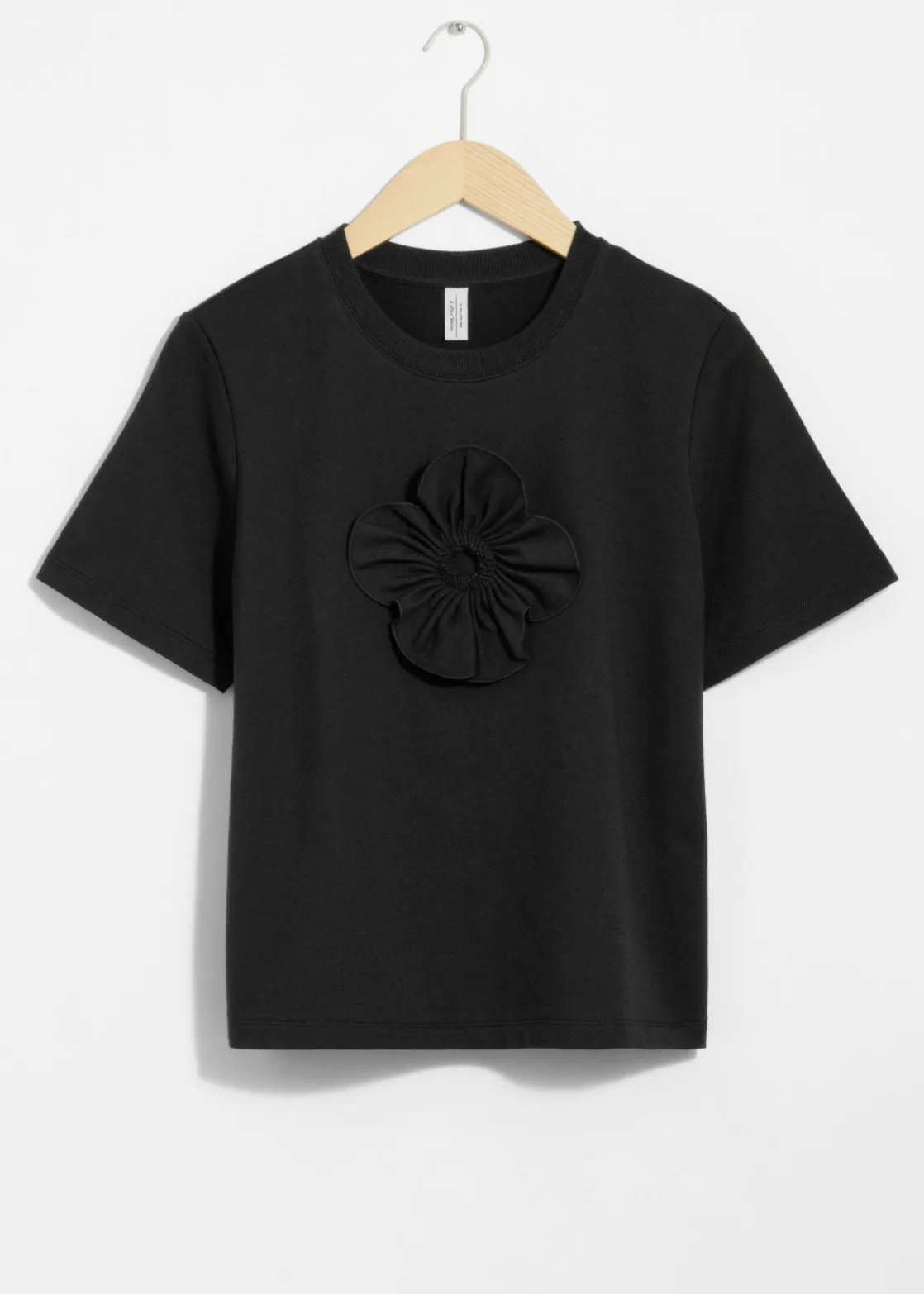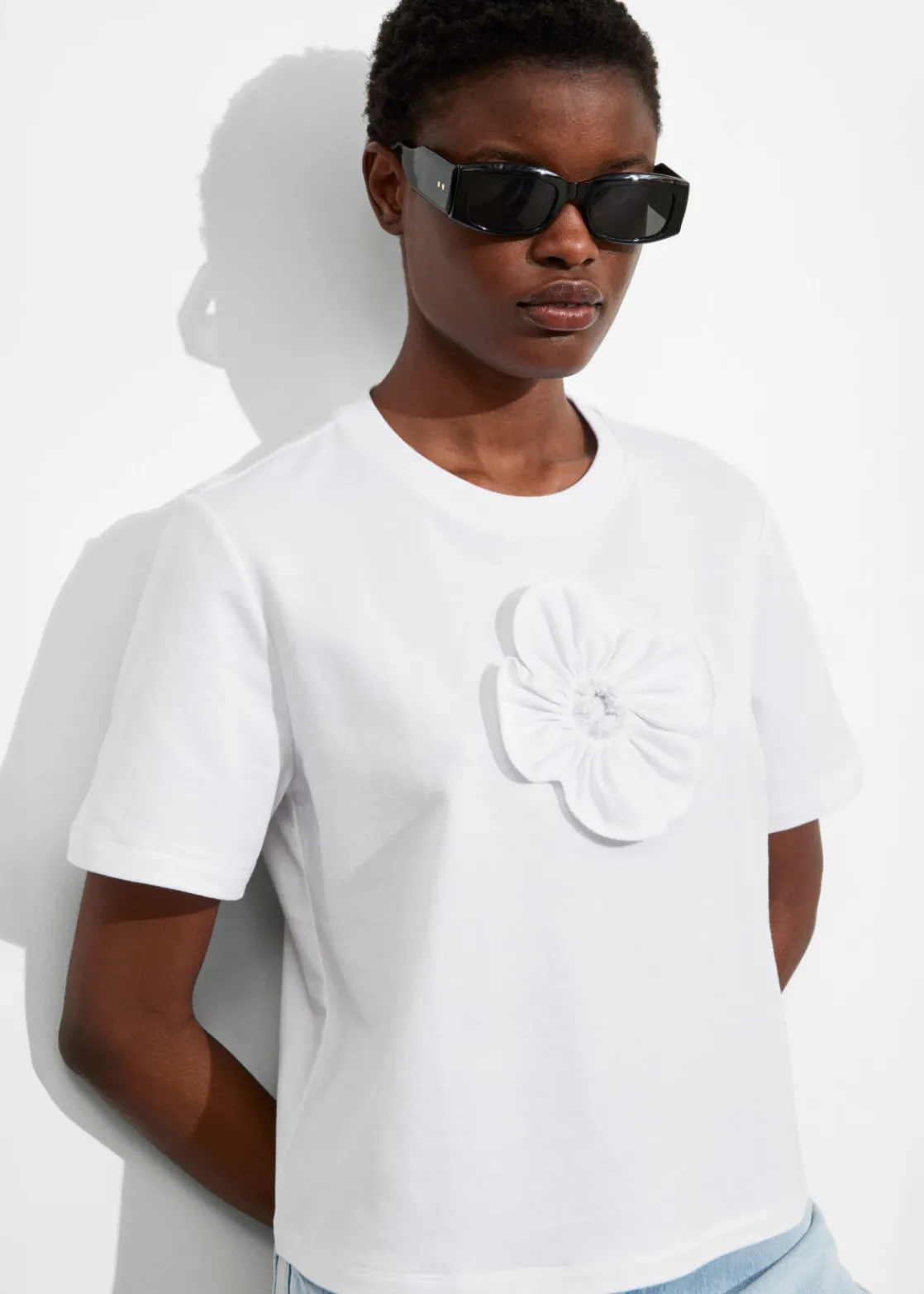 Boxy round-neck t-shirt detailed with a large floral appliqué at the centre front.
