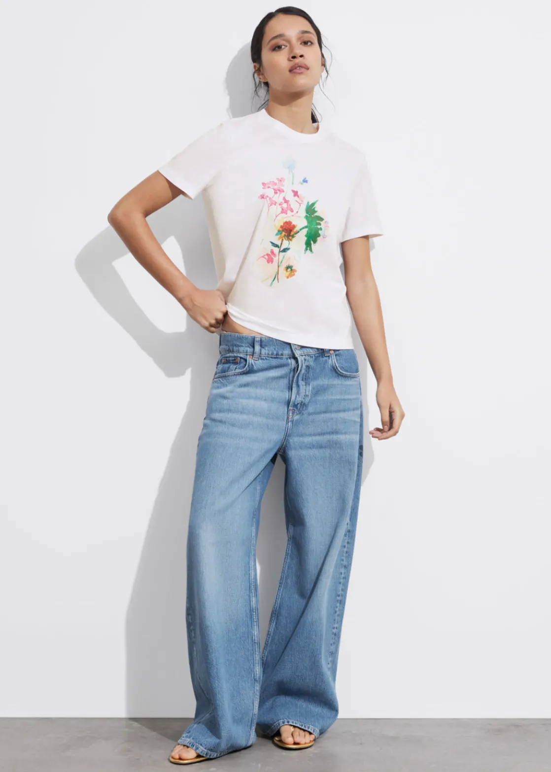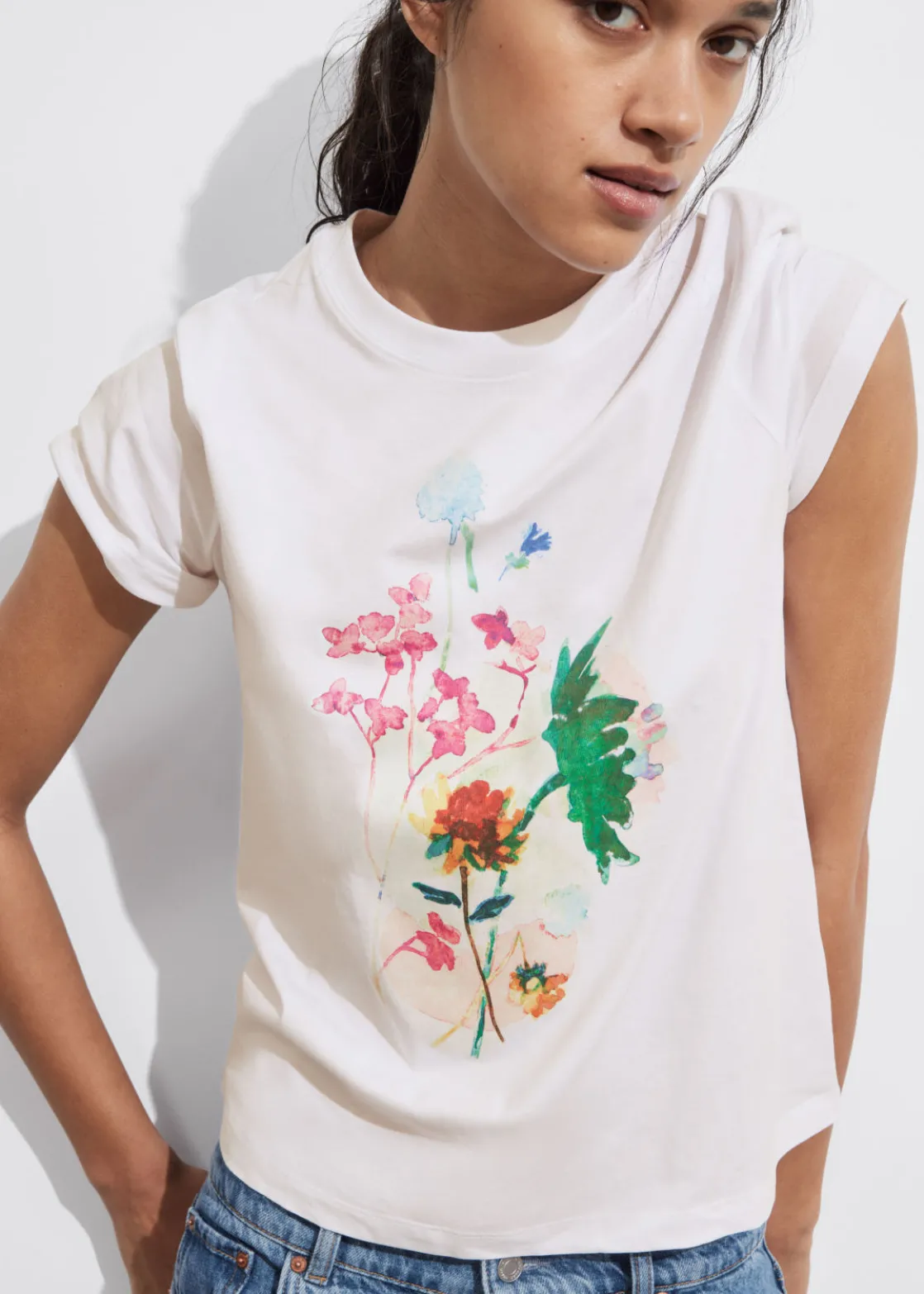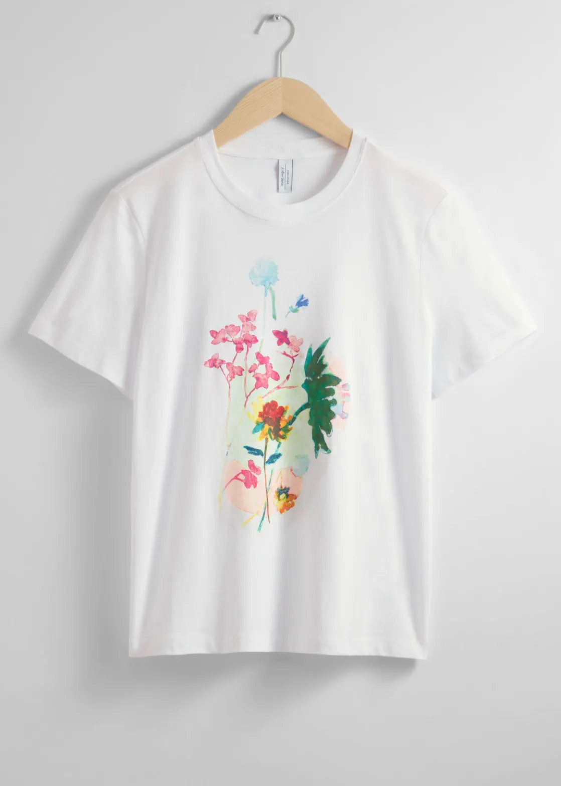Floral print jersey t-shirt crafted from cotton jersey fabric with a round-cut ribbed neckline and centre front floral print. Finished with stitch detailing on the sleeves and hemline.