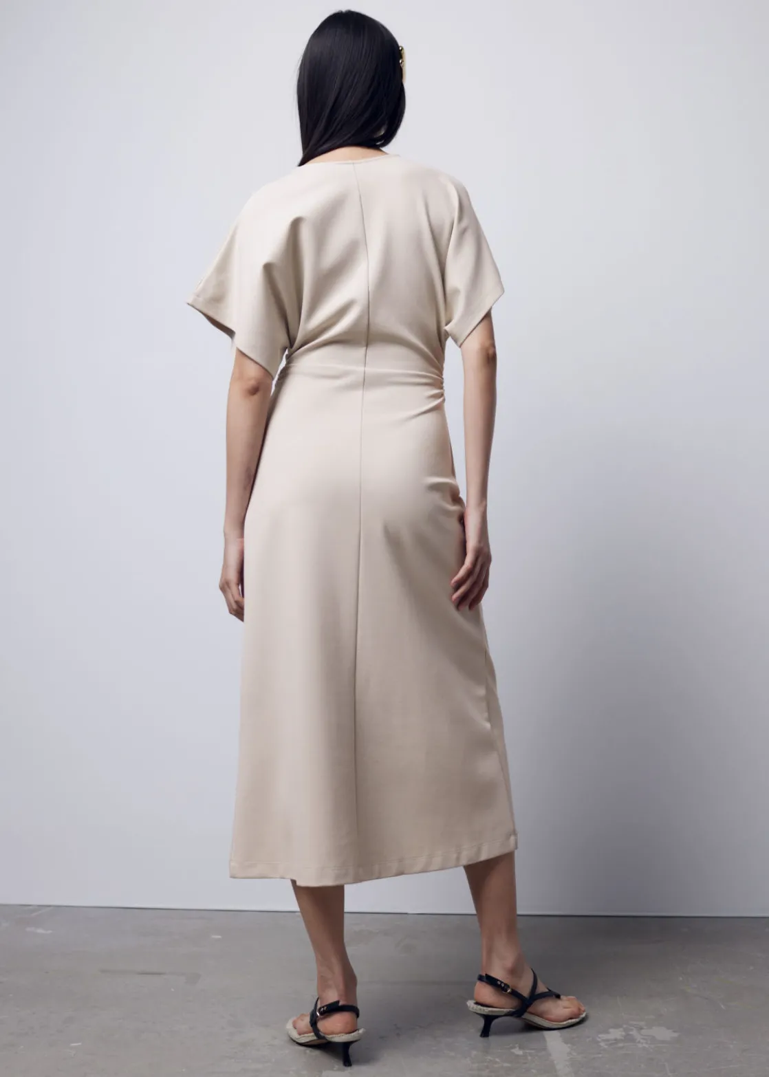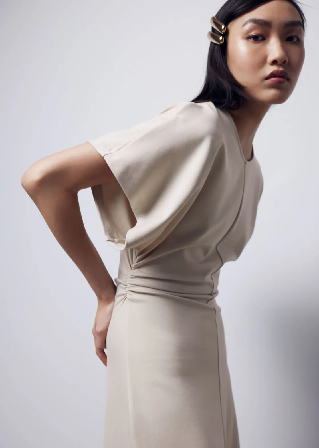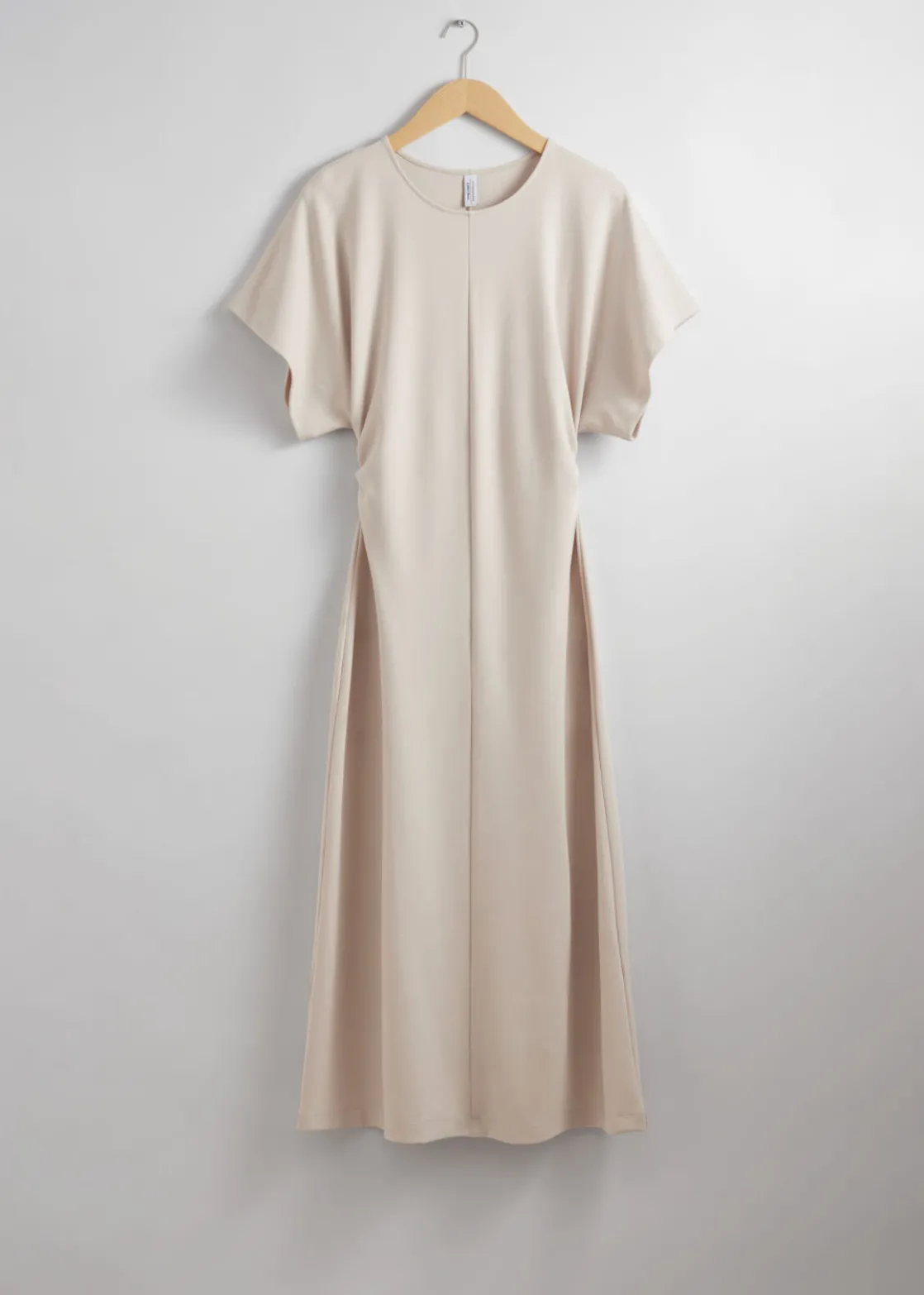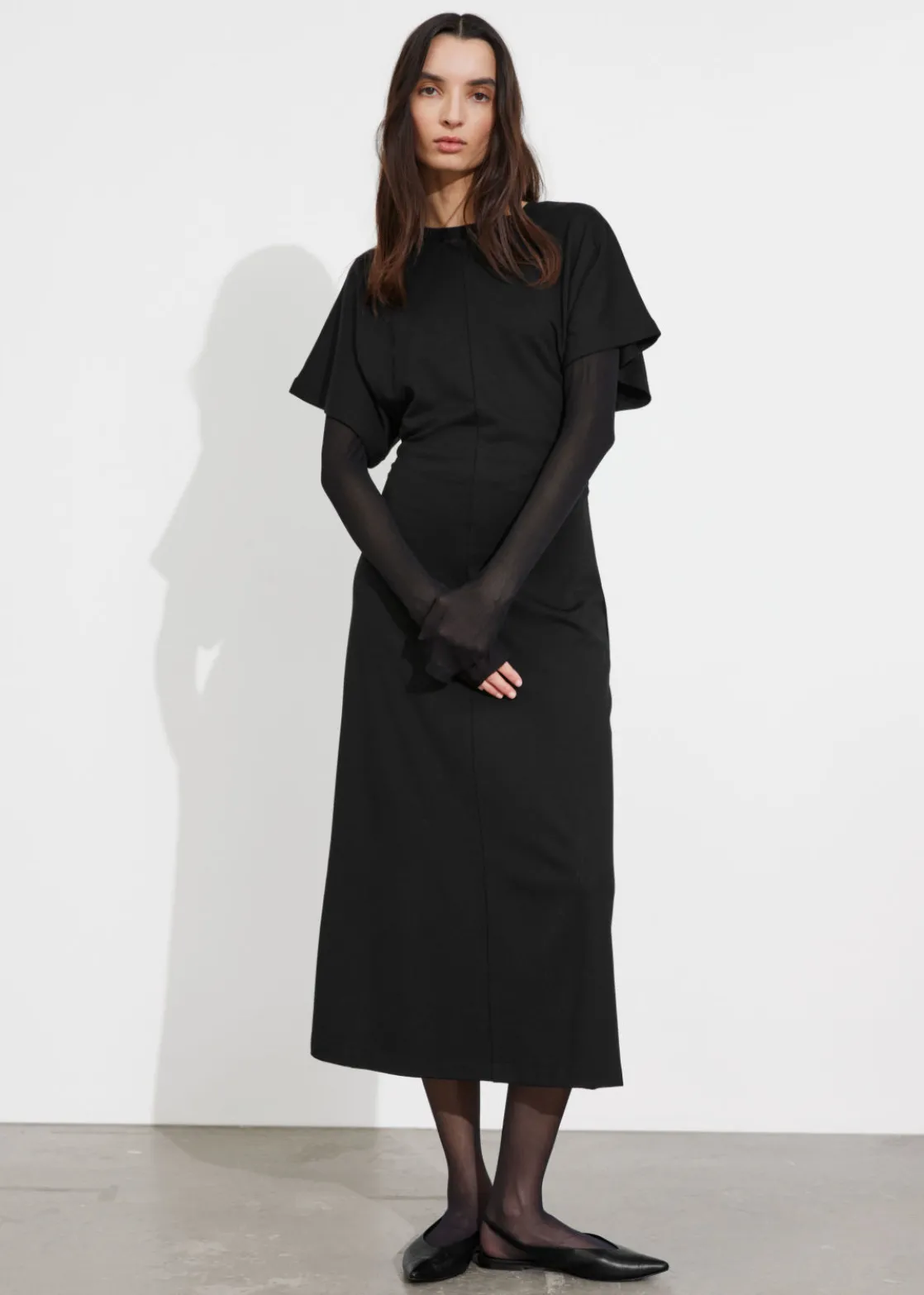 Midi dress featuring short, flutter sleeves. Detailed with a visible vertical seam along the front and back.