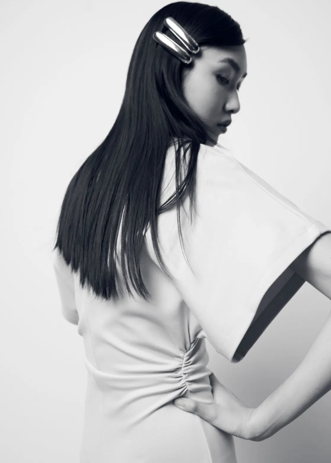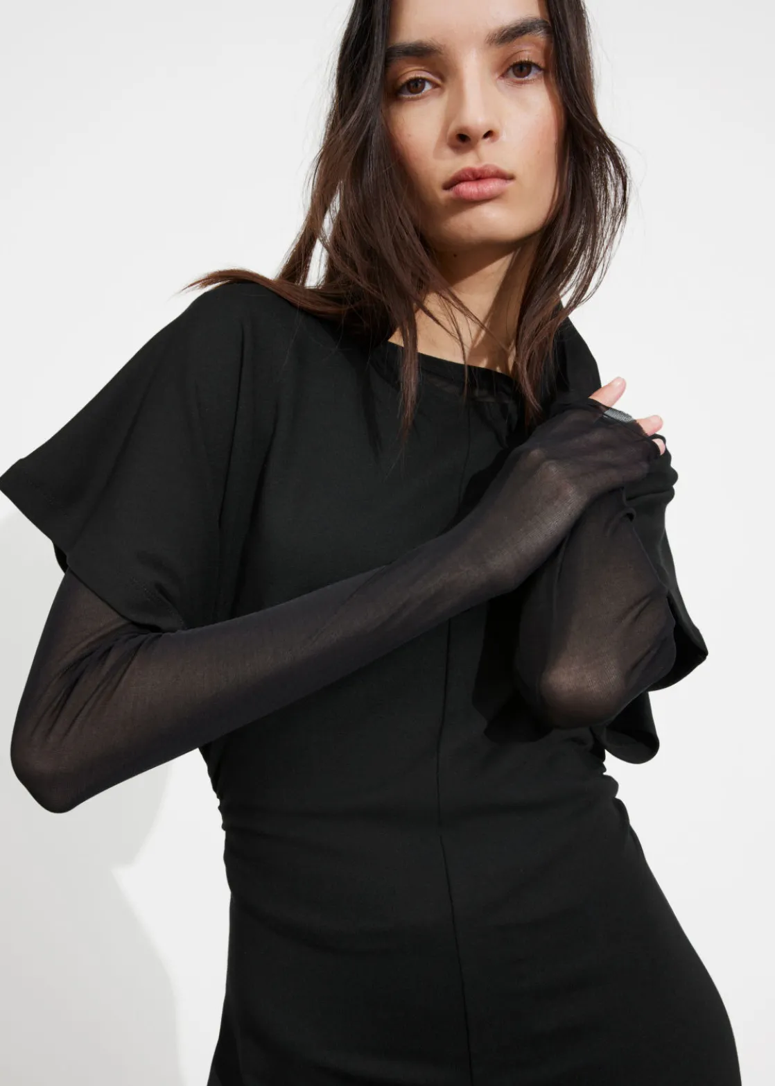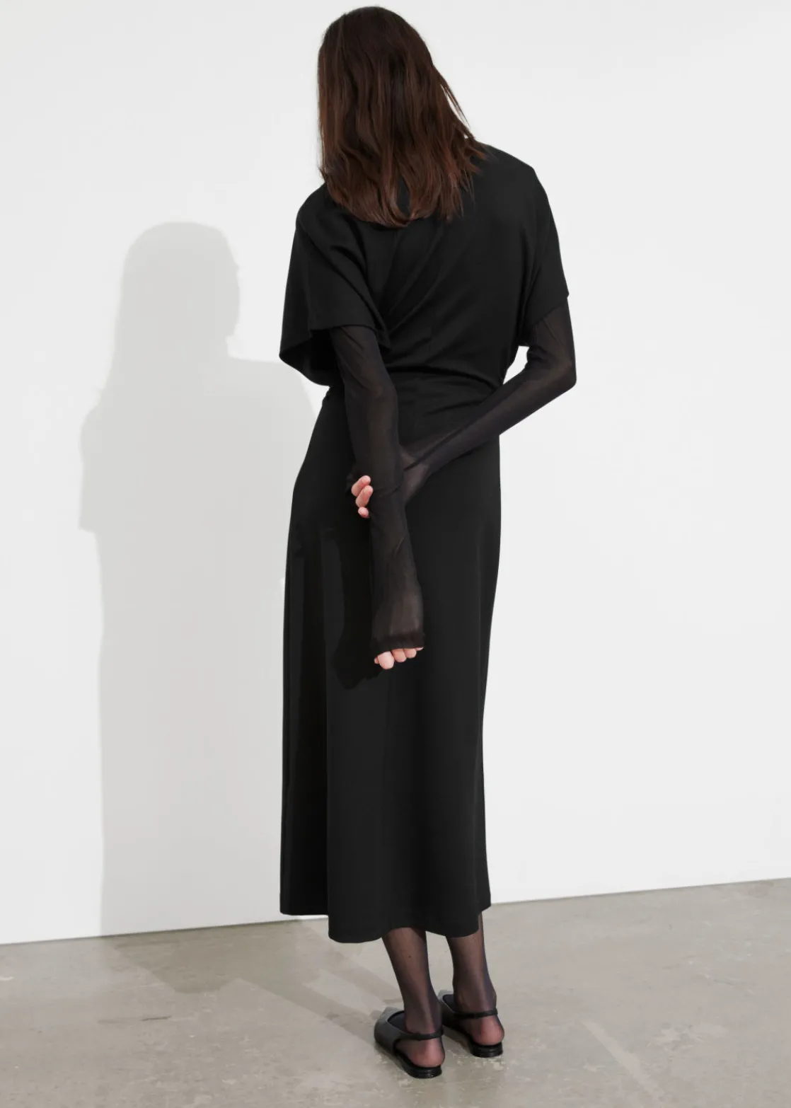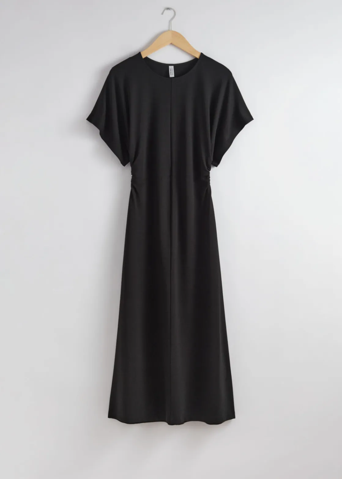 Midi dress featuring short, flutter sleeves. Detailed with a visible vertical seam along the front and back.