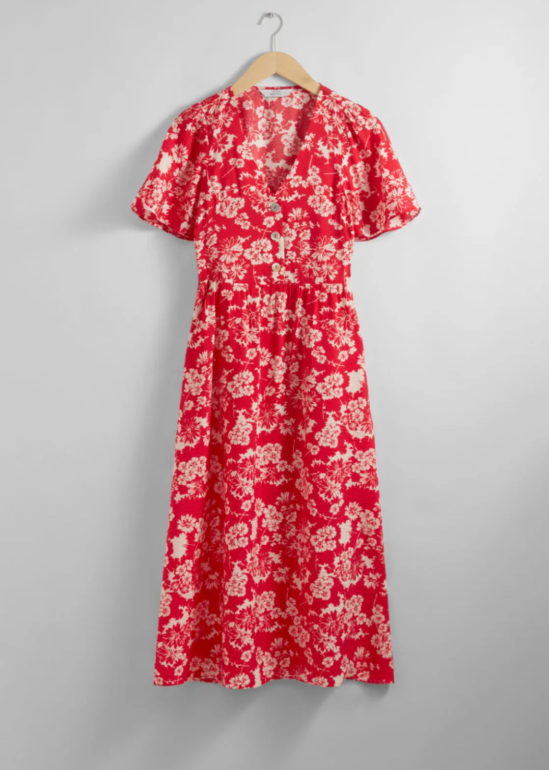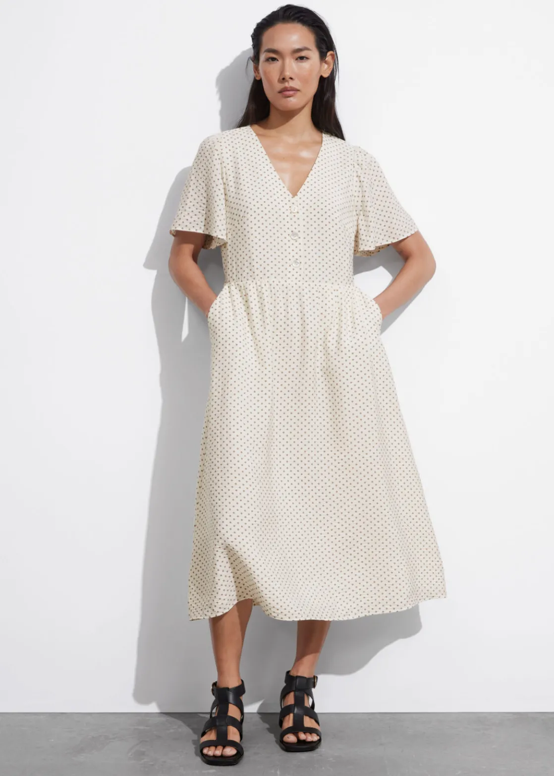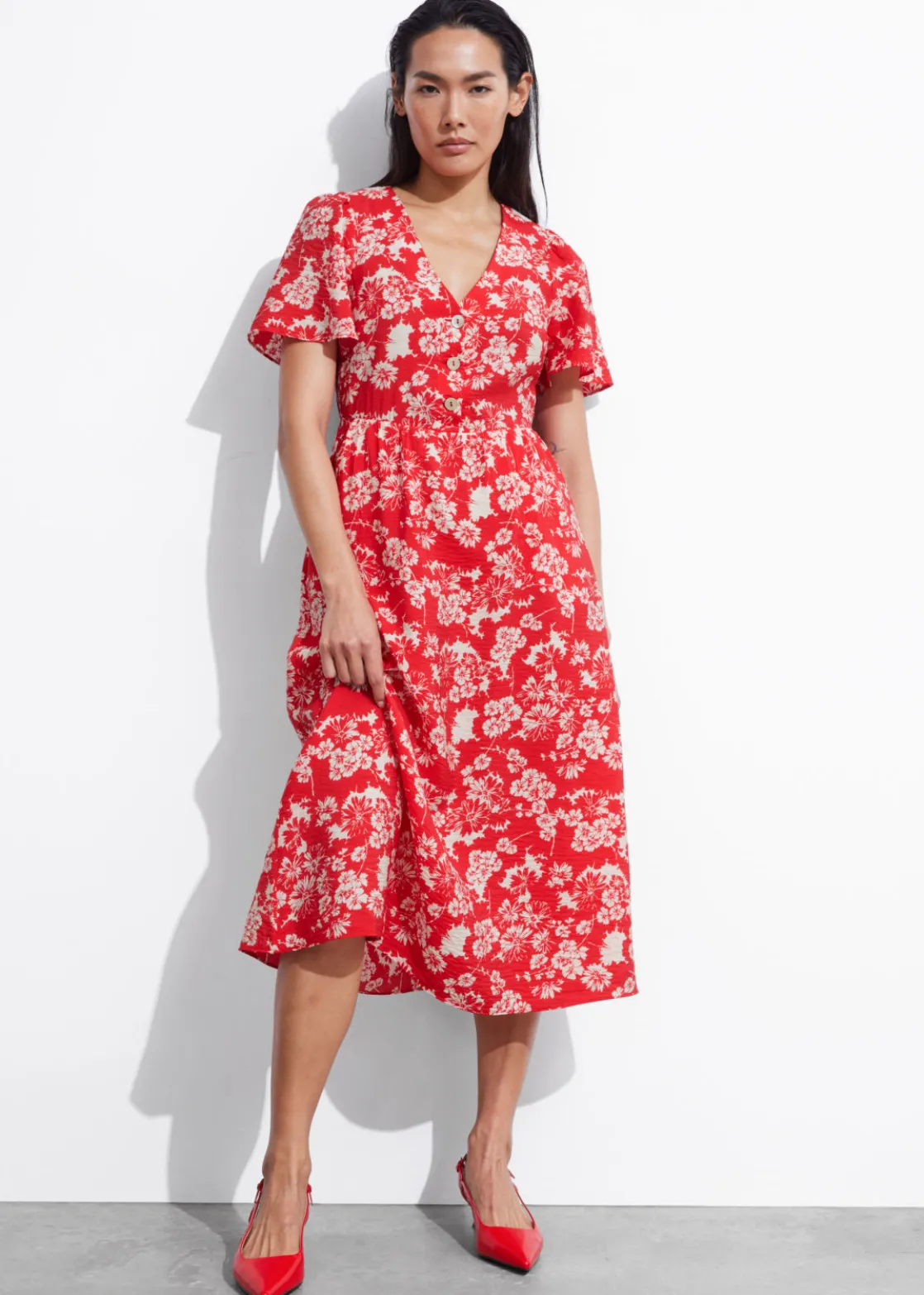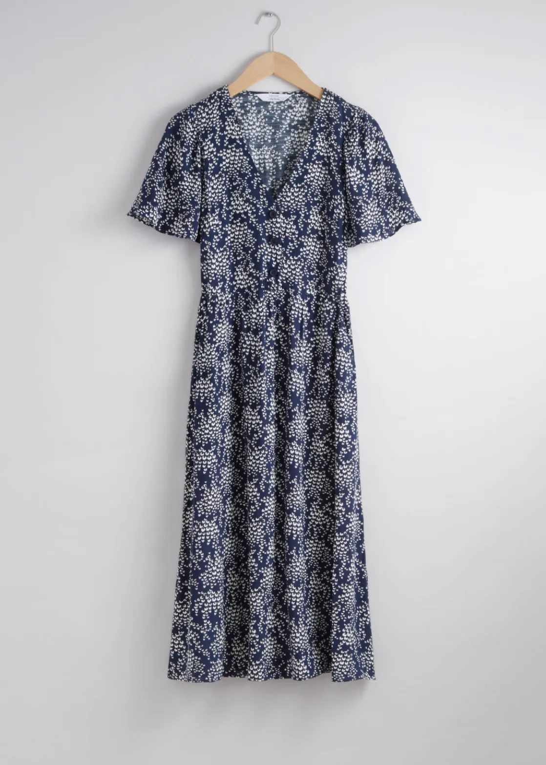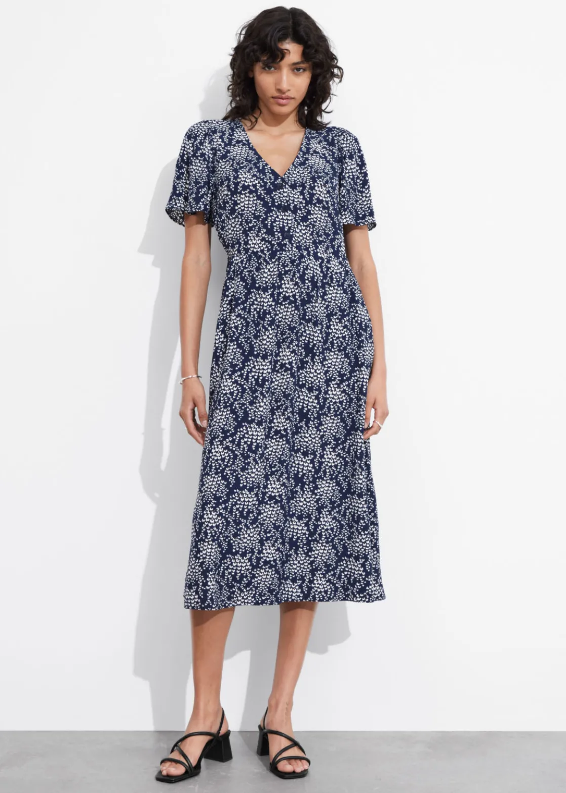 V-cut midi dress with a buttoned bodice, a defined waistline and flutter sleeves.