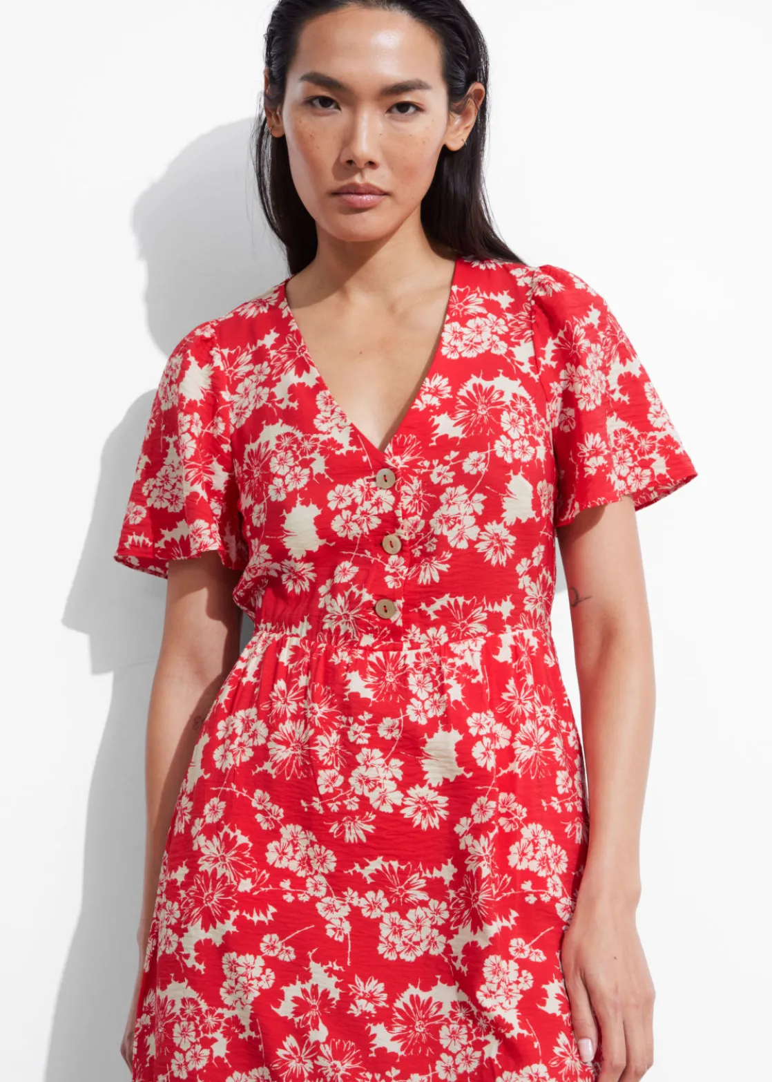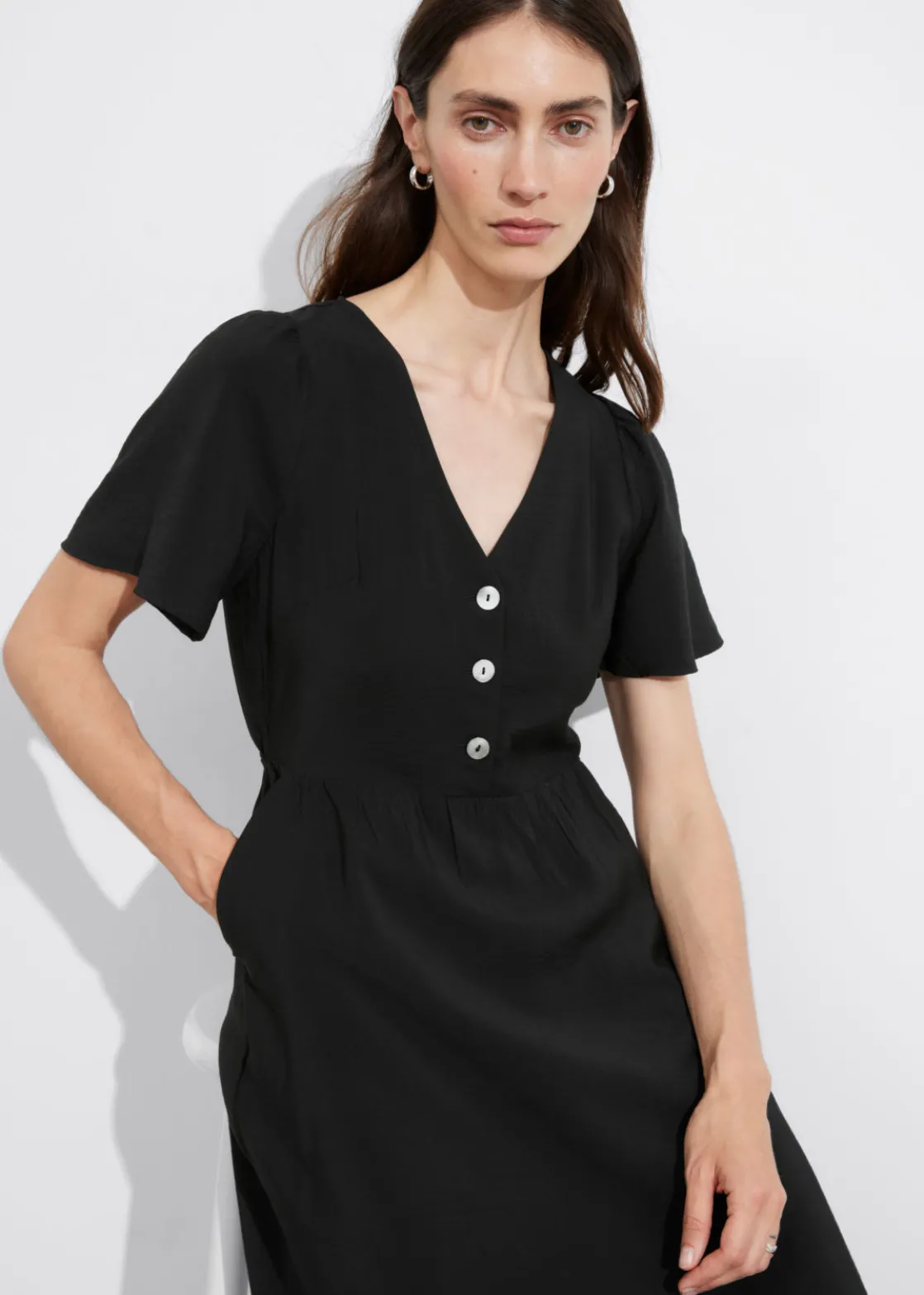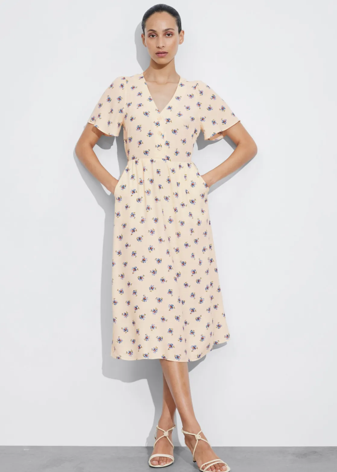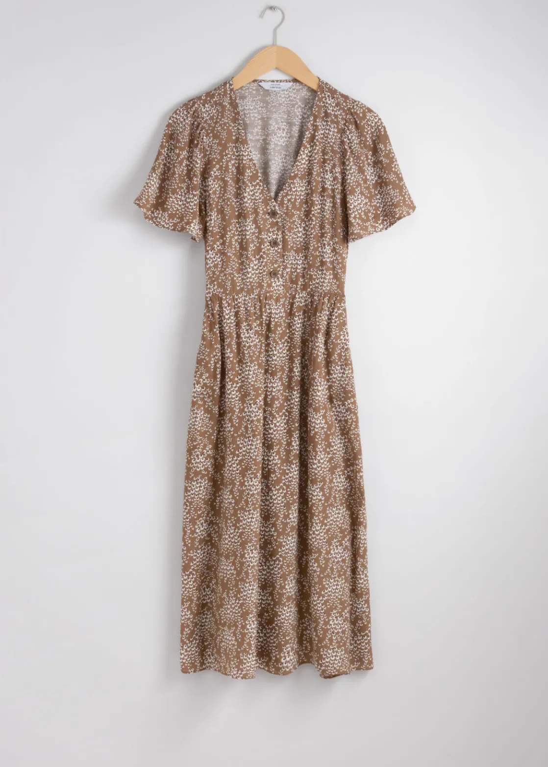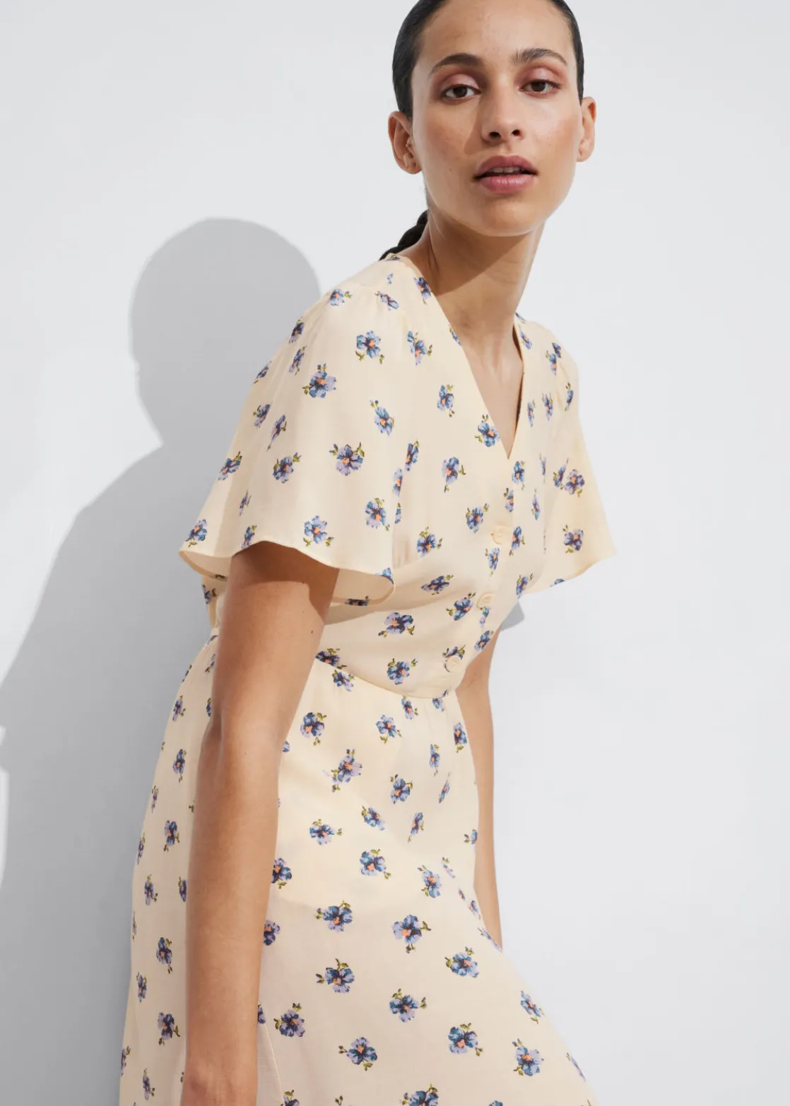 V-cut midi dress with a buttoned bodice, a defined waistline and flutter sleeves.