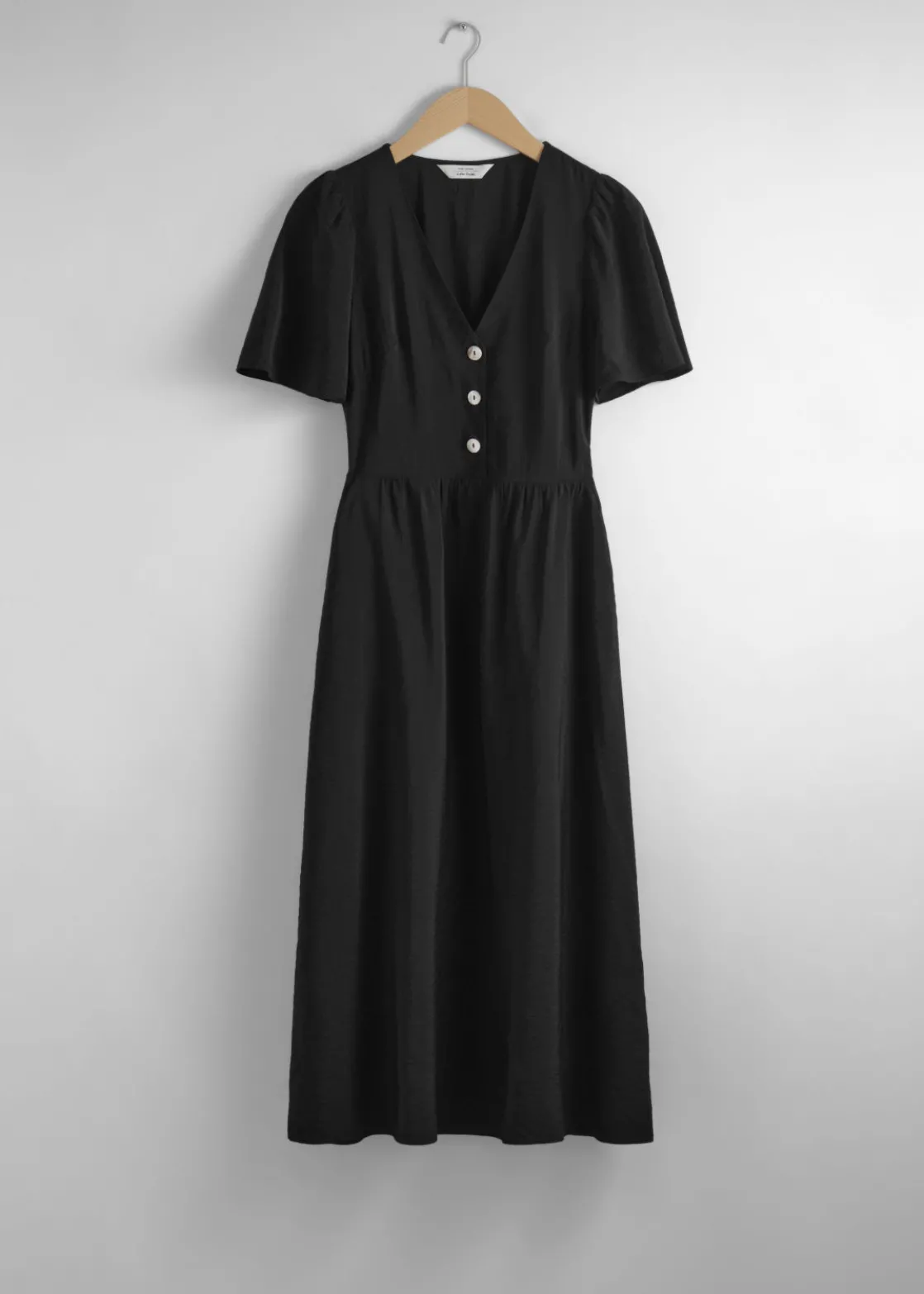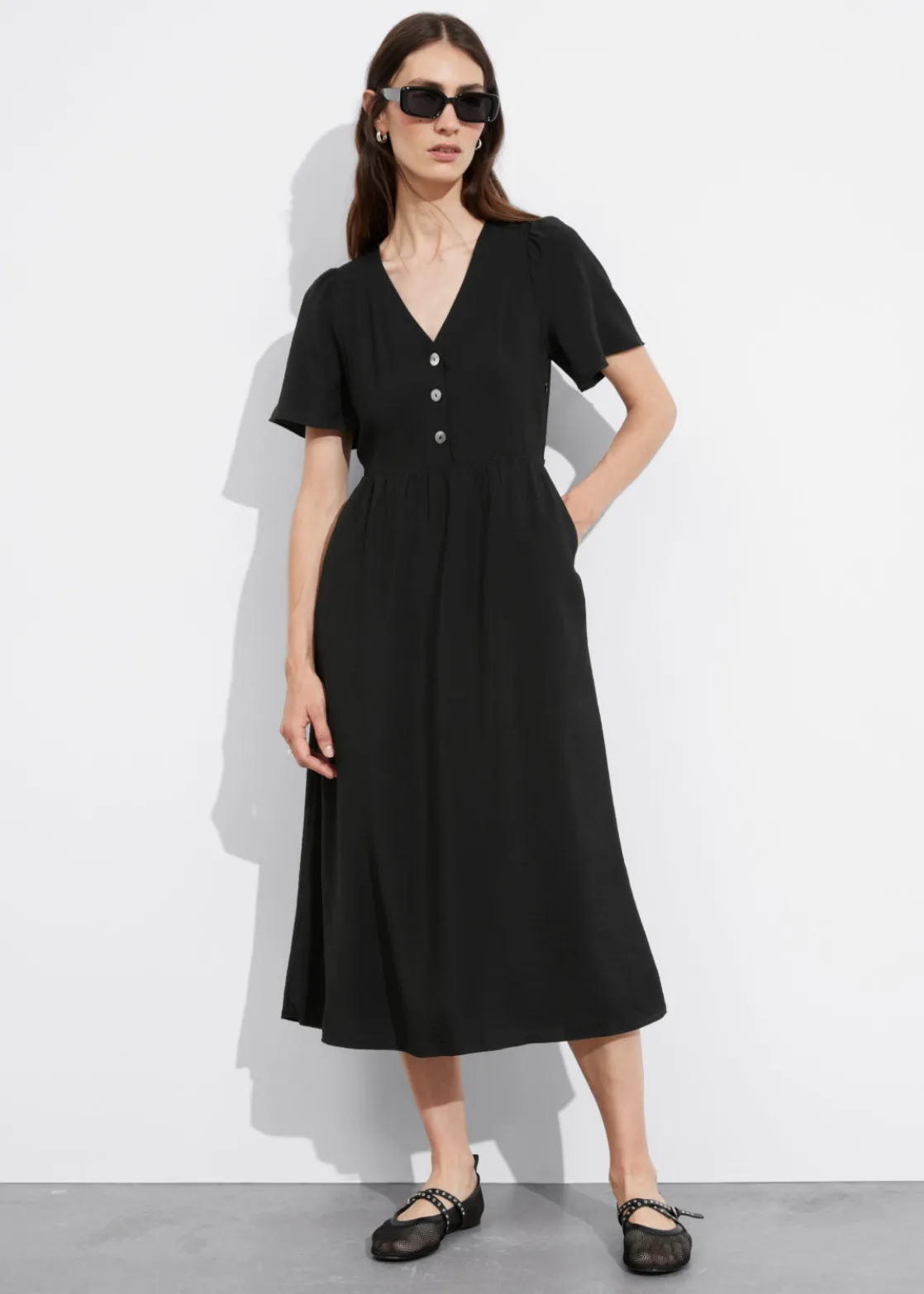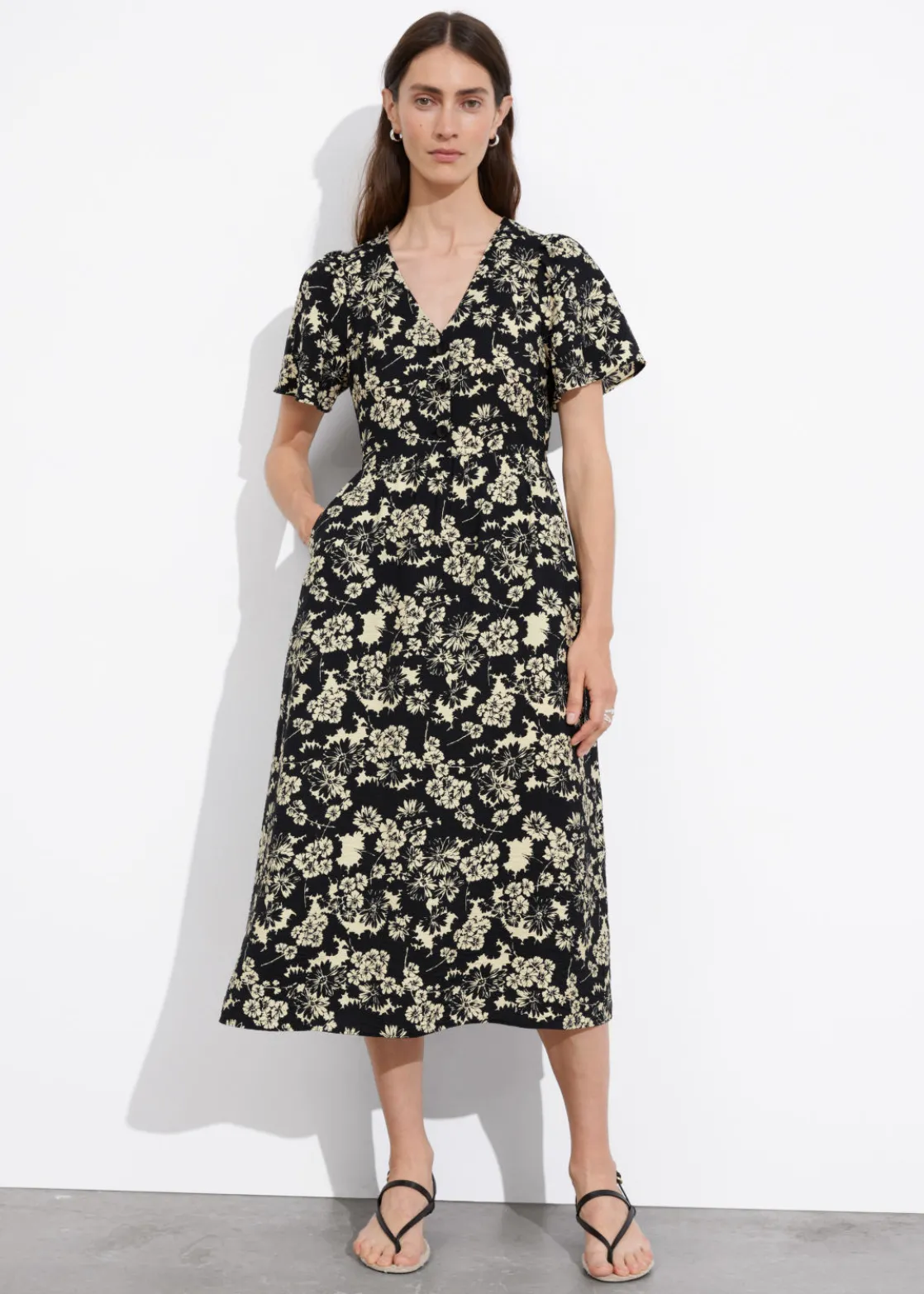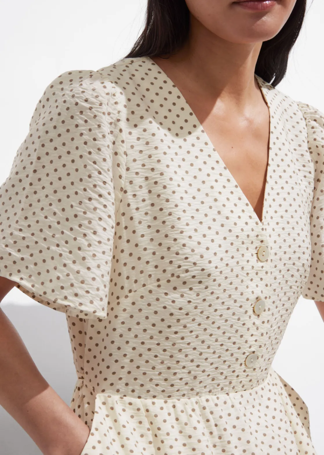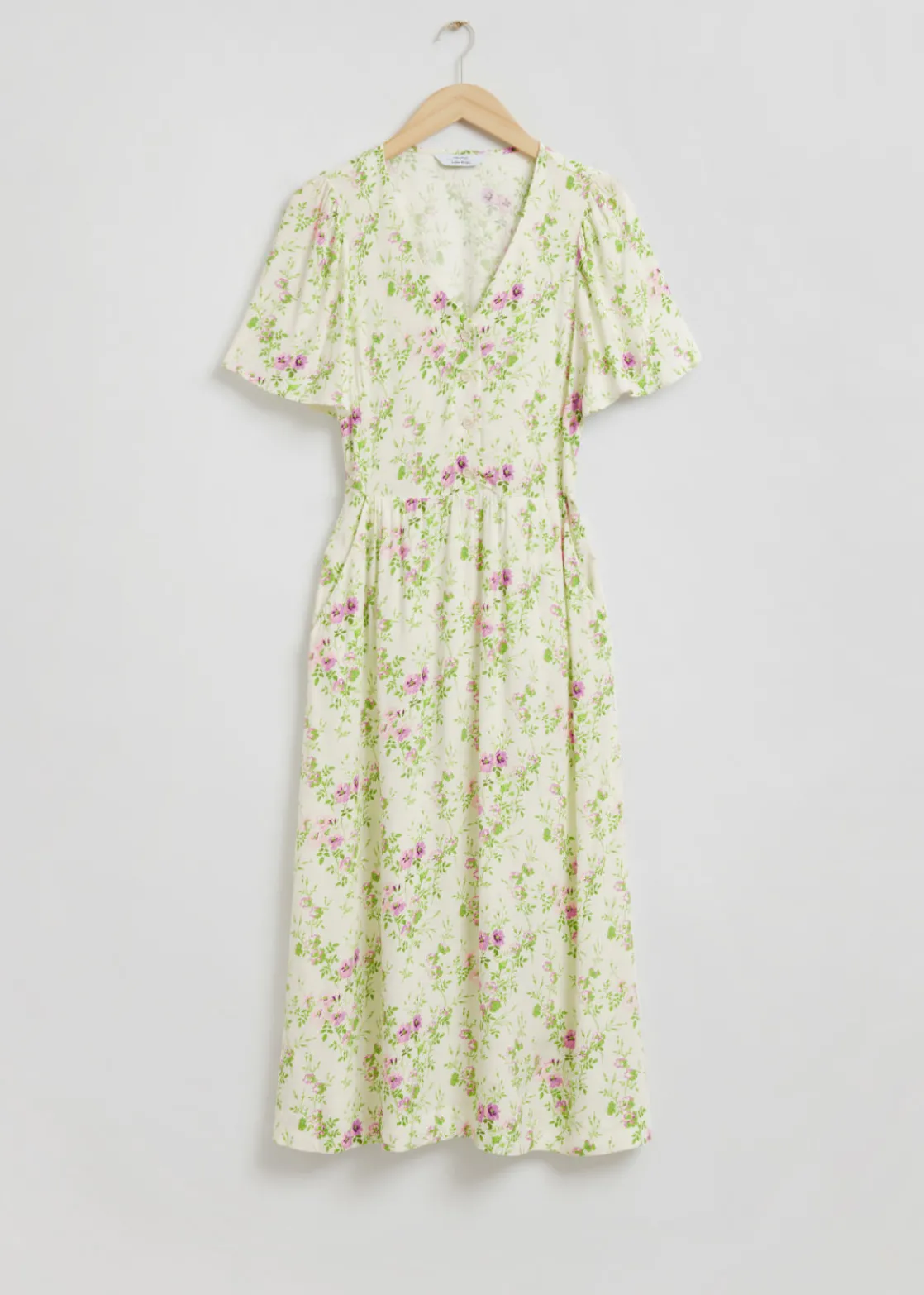 V-cut midi dress with a buttoned bodice, a defined waistline and flutter sleeves.