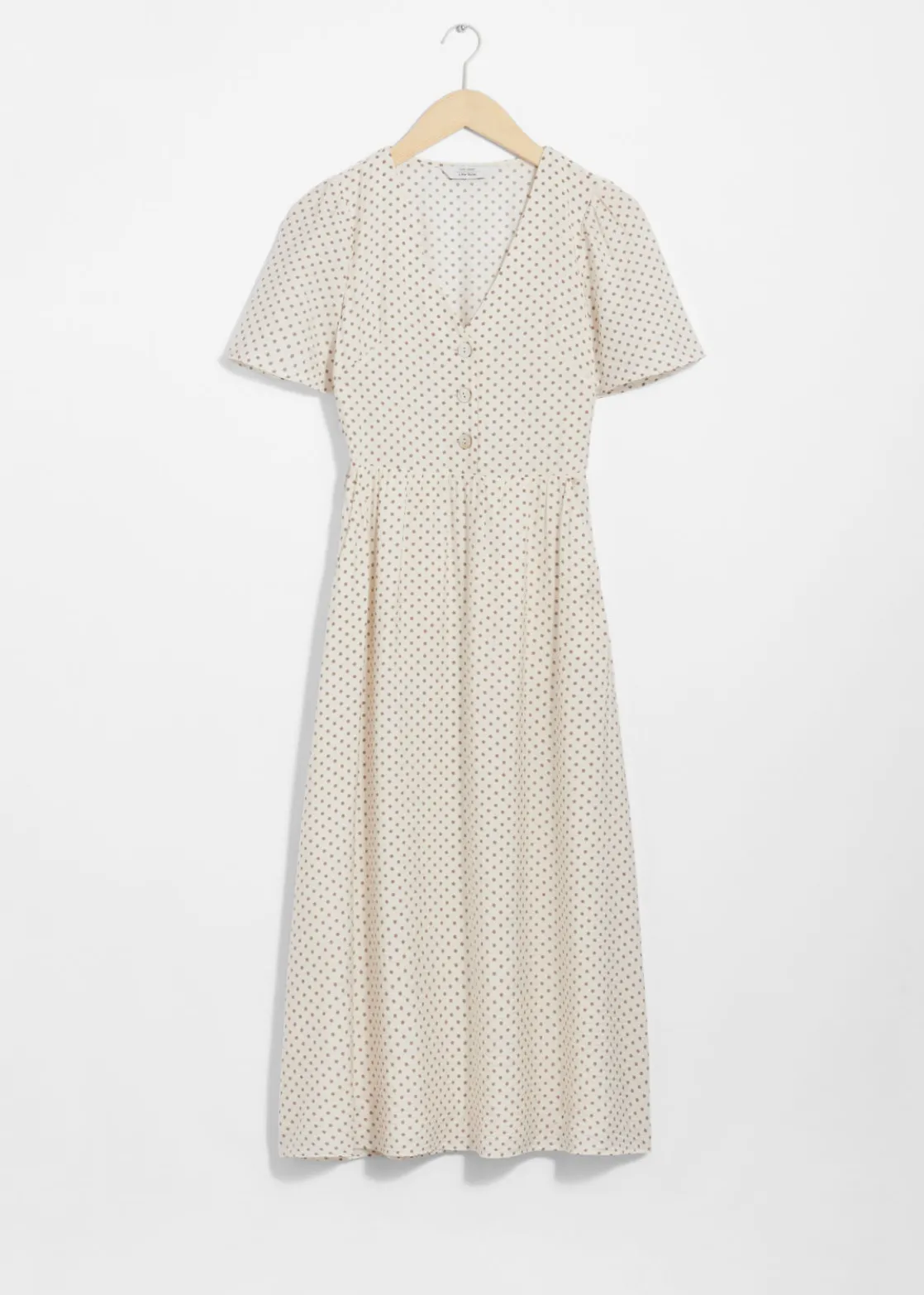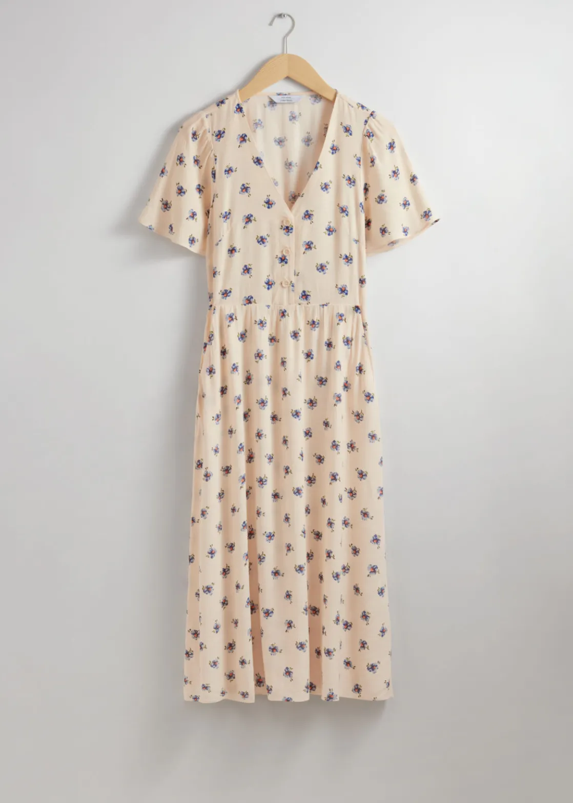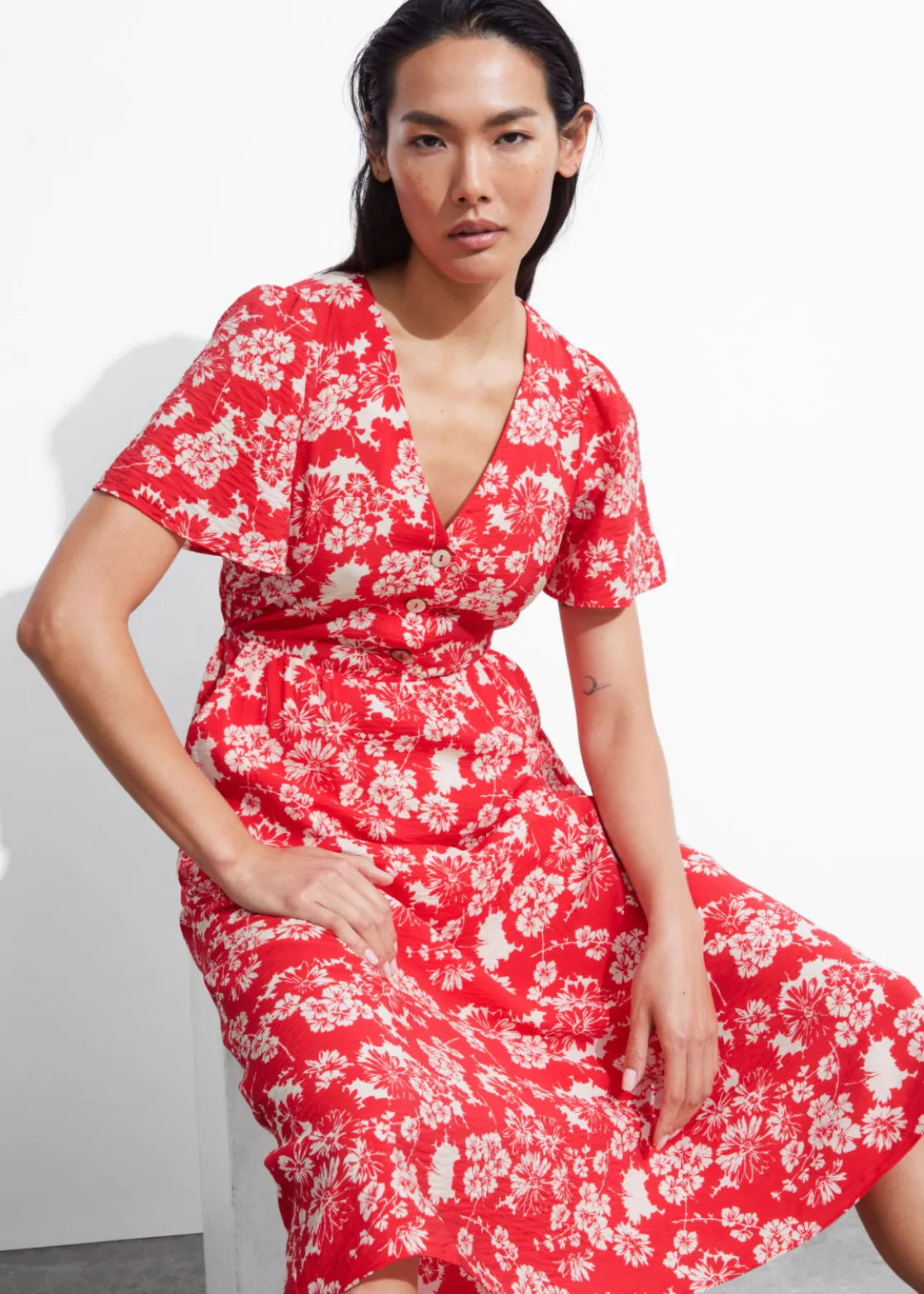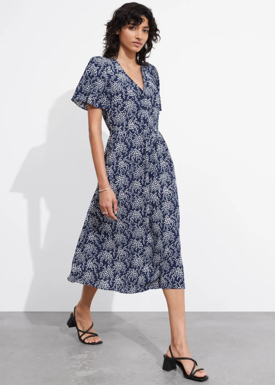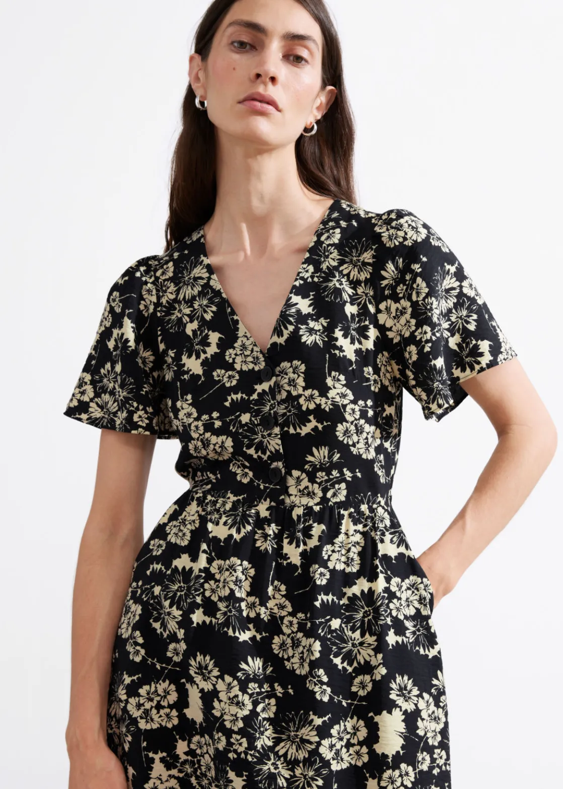 V-cut midi dress with a buttoned bodice, a defined waistline and flutter sleeves.