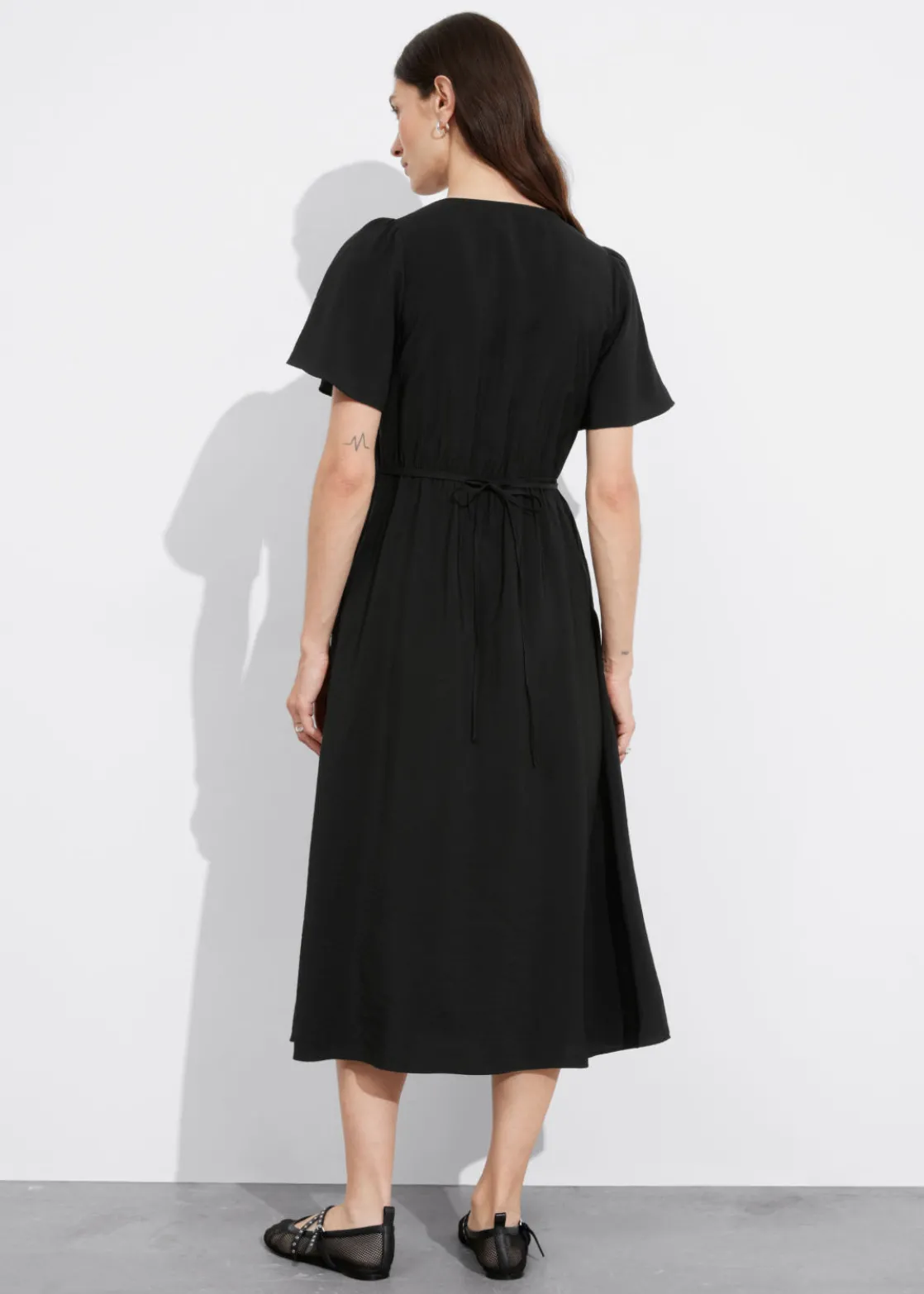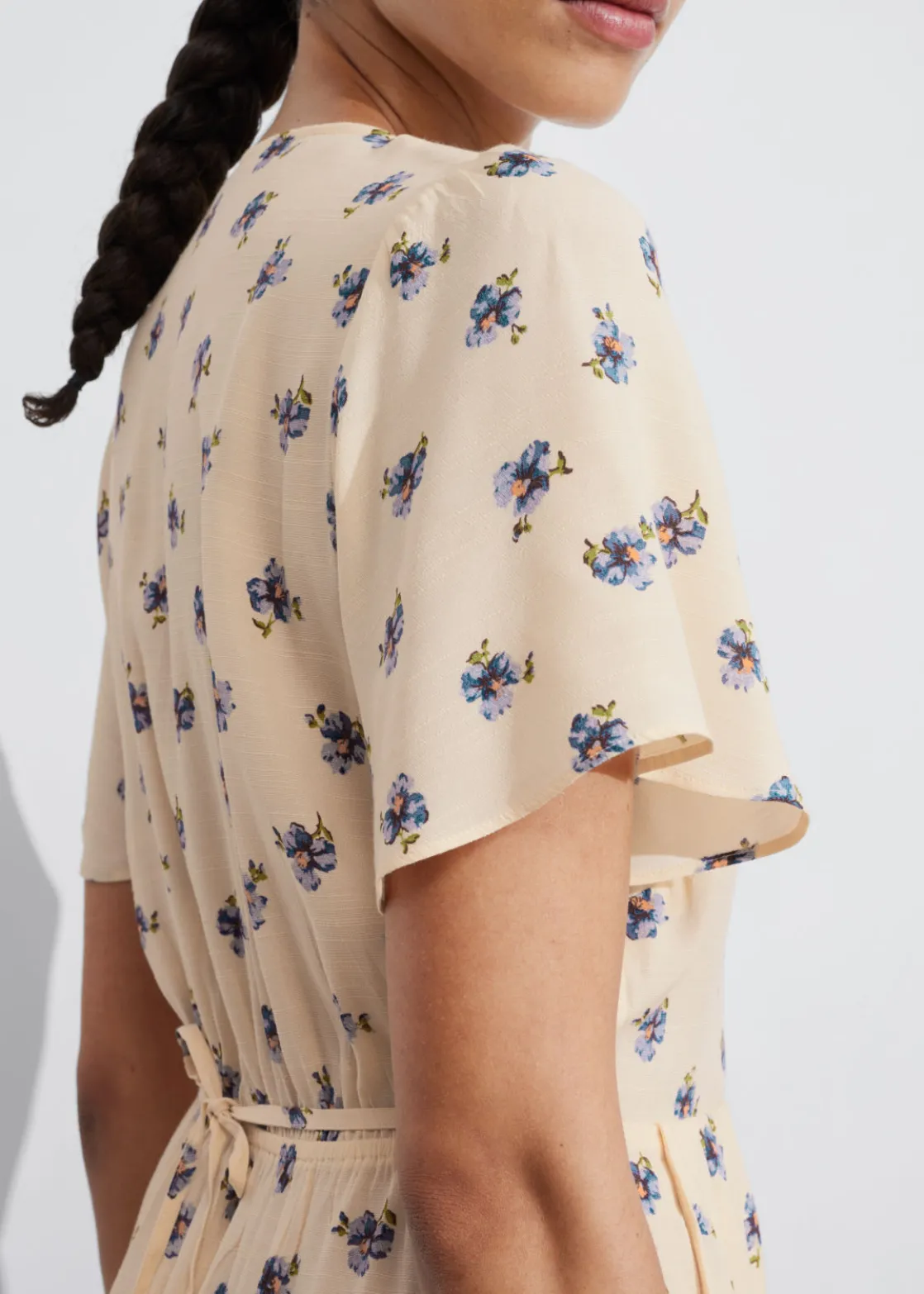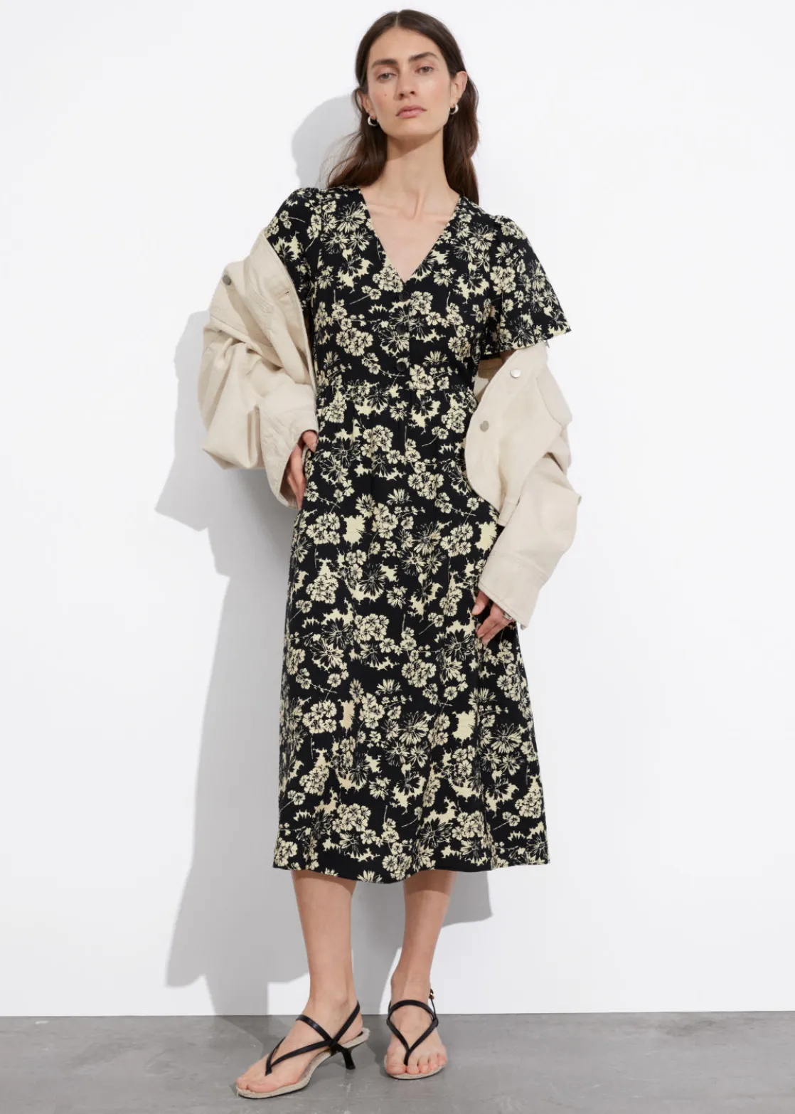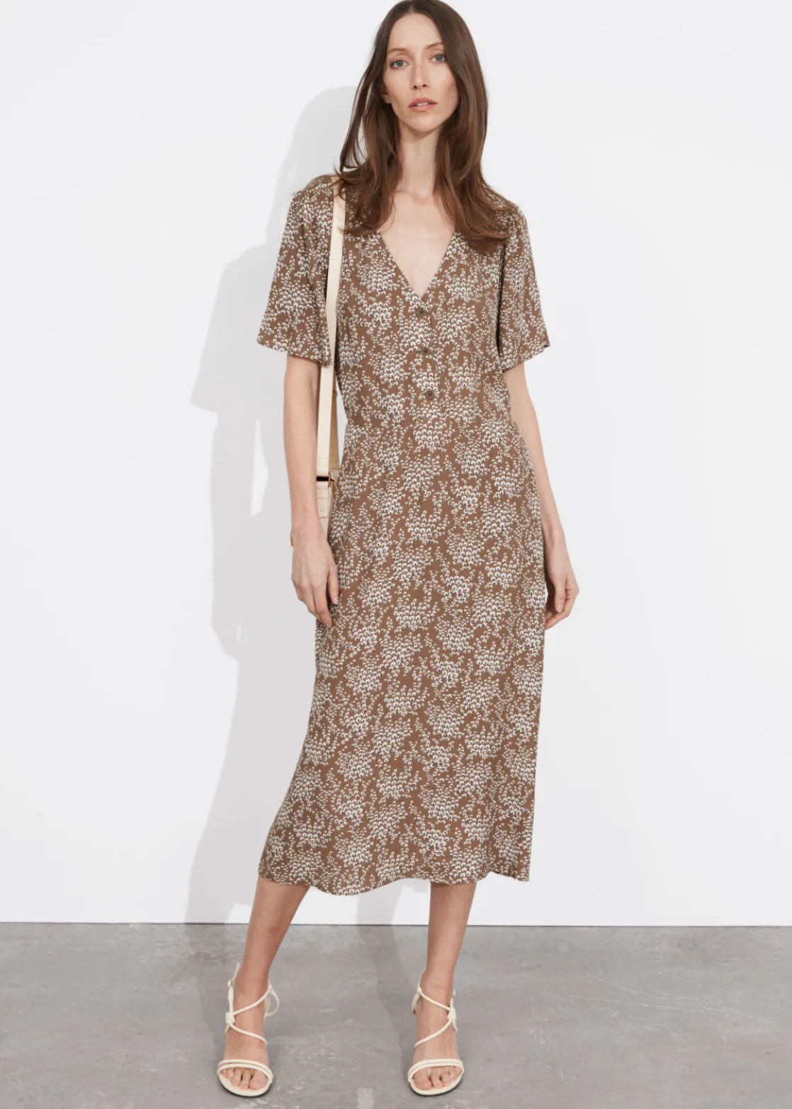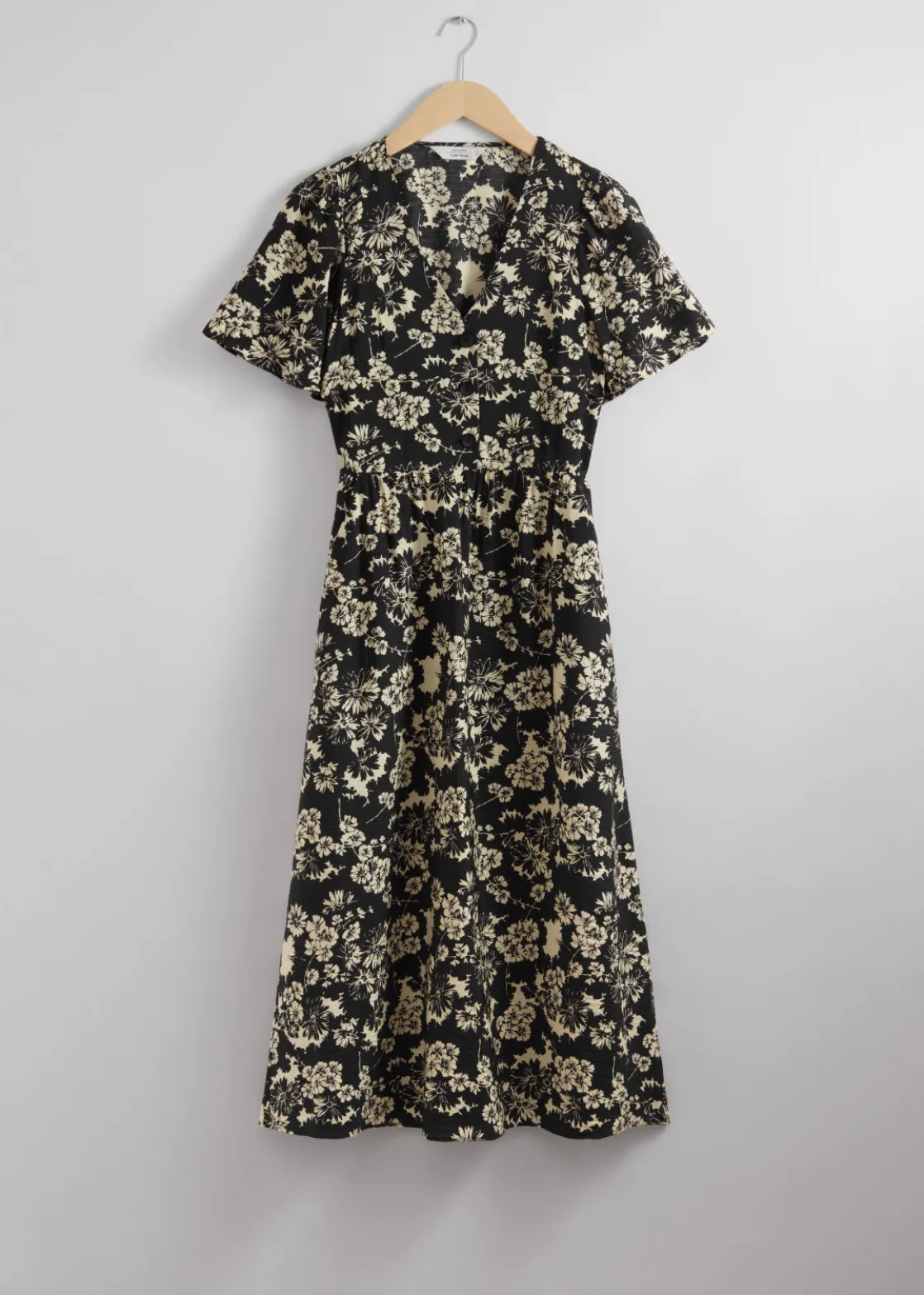 V-cut midi dress with a buttoned bodice, a defined waistline and flutter sleeves.