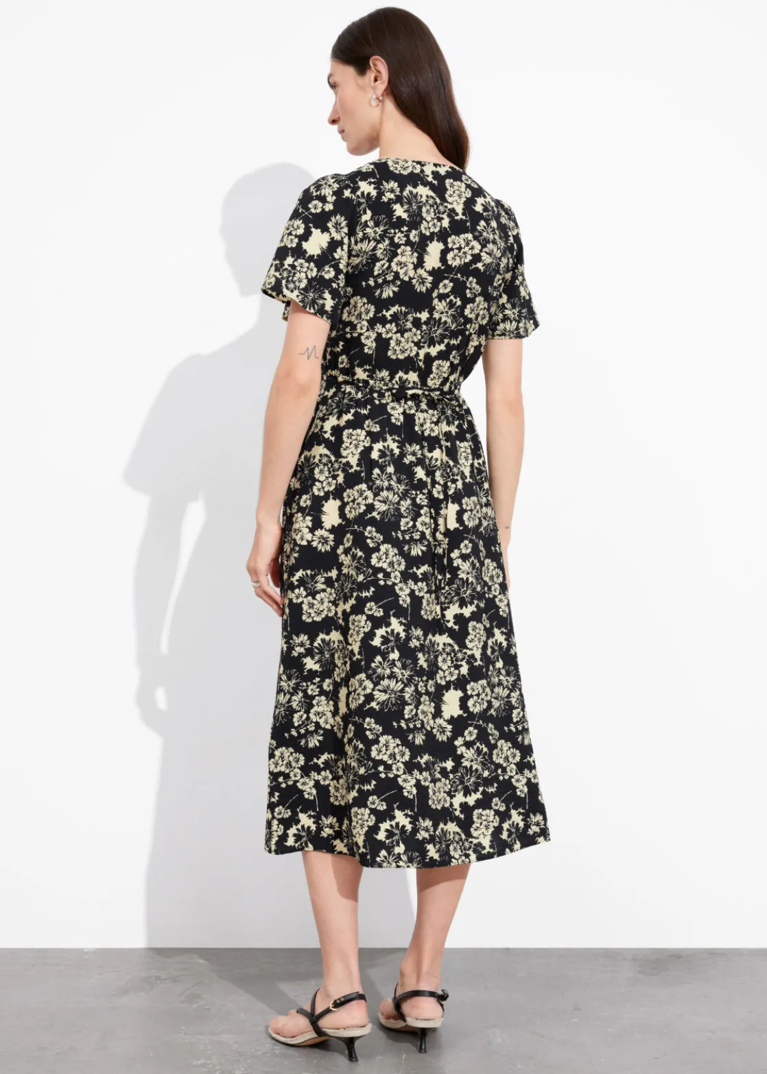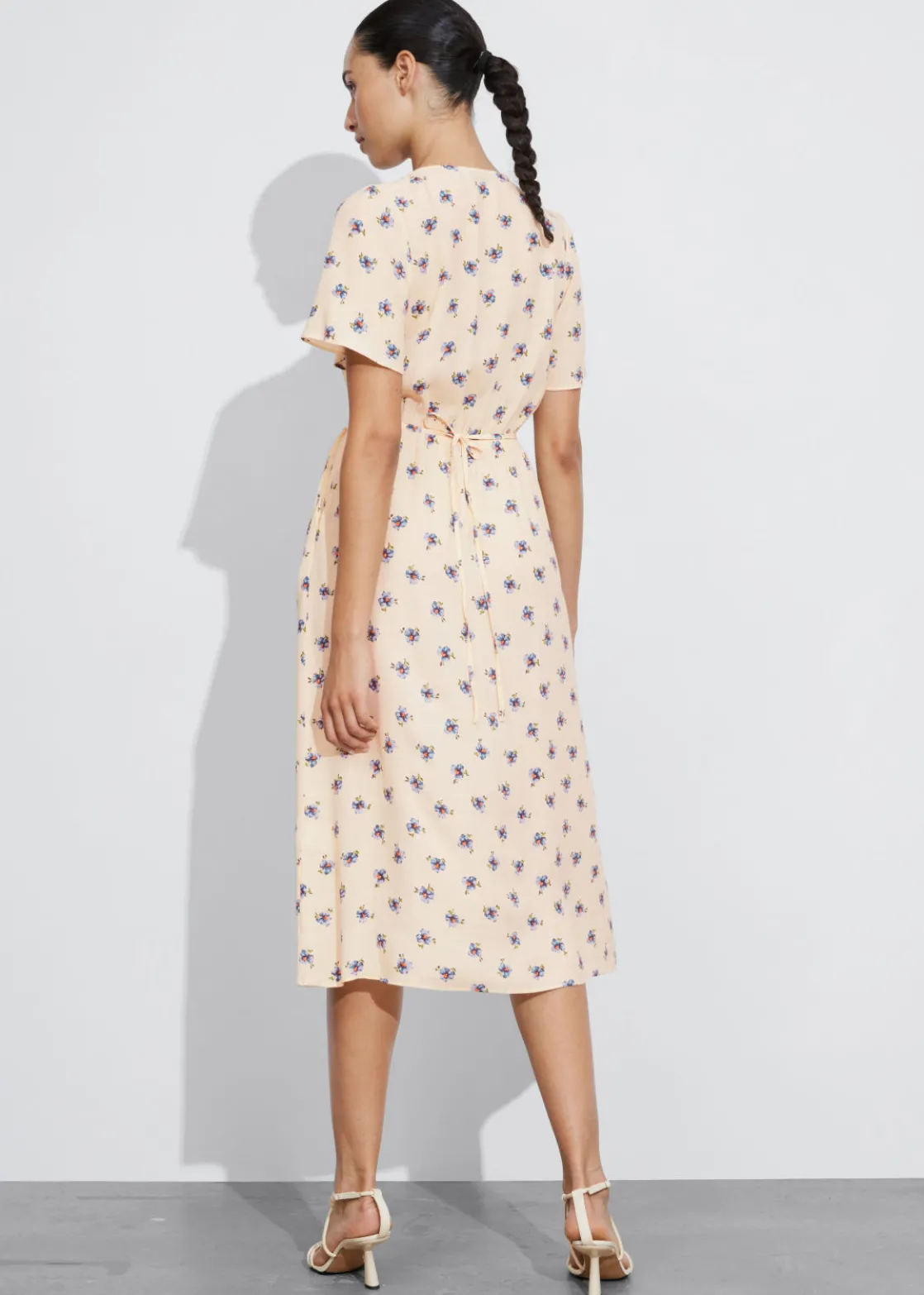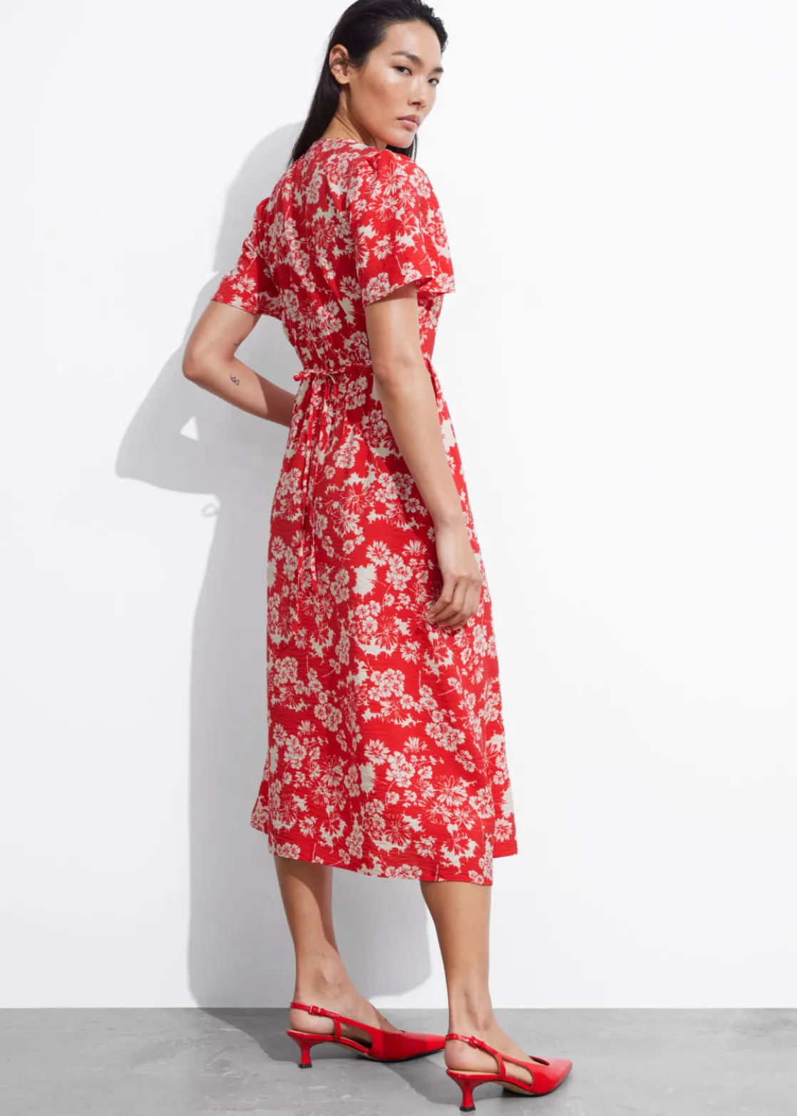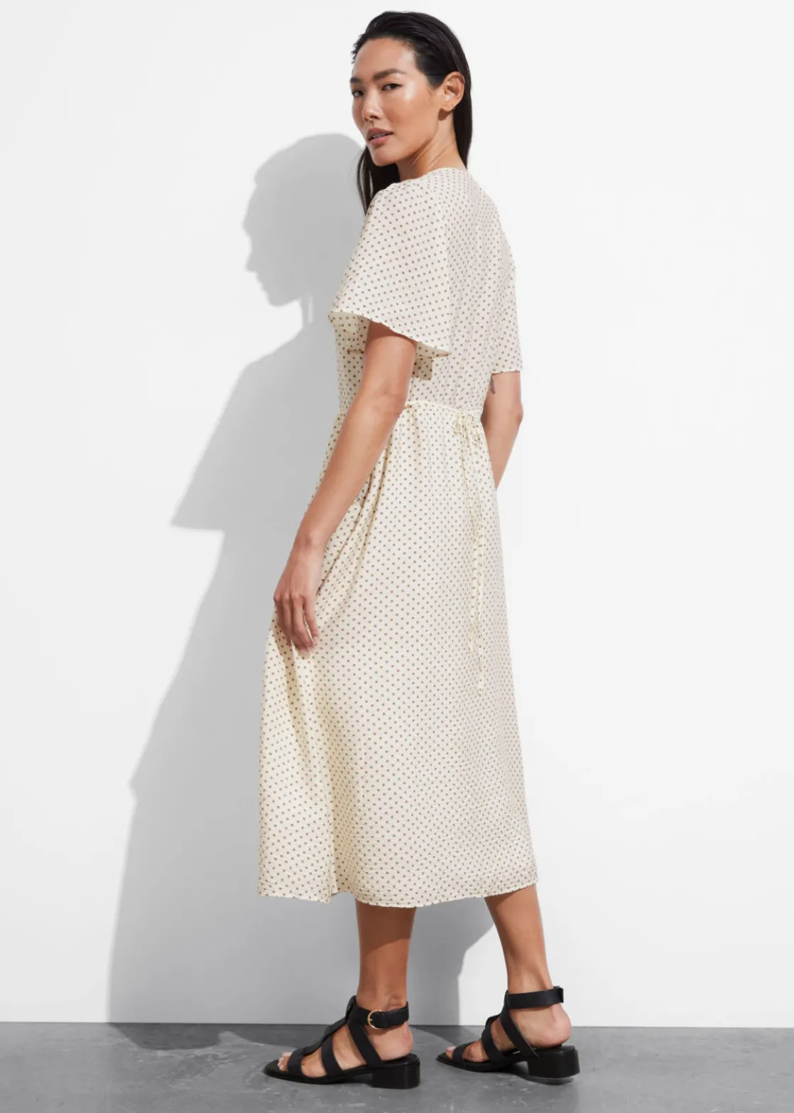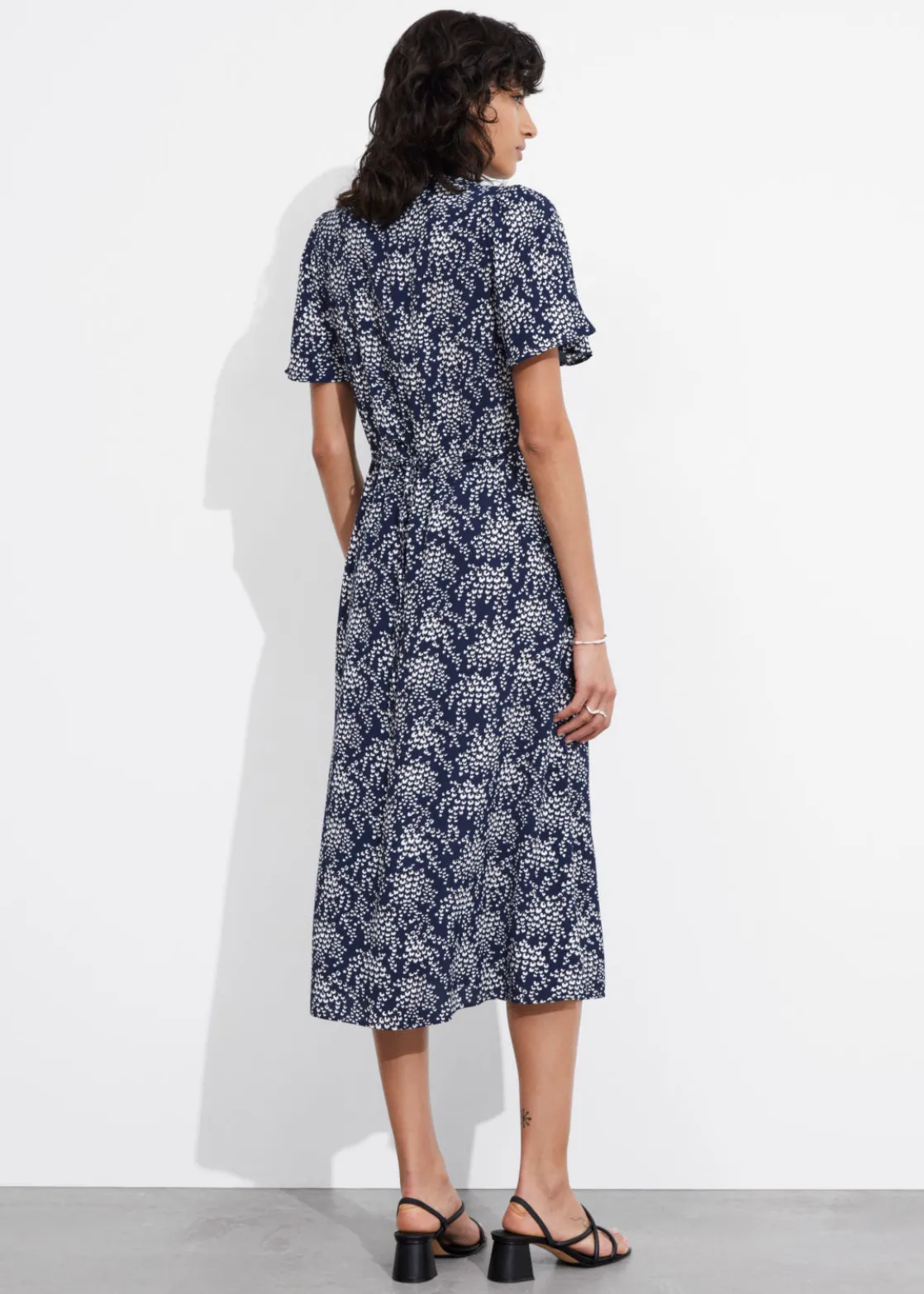 V-cut midi dress with a buttoned bodice, a defined waistline and flutter sleeves.