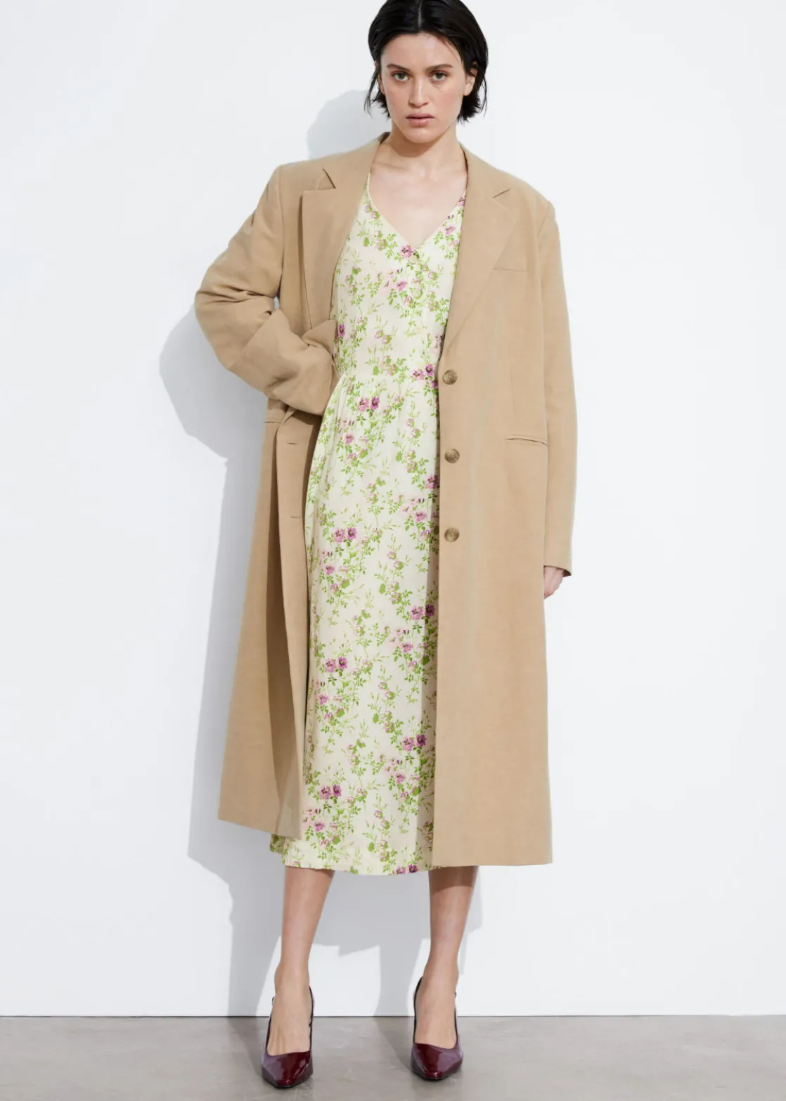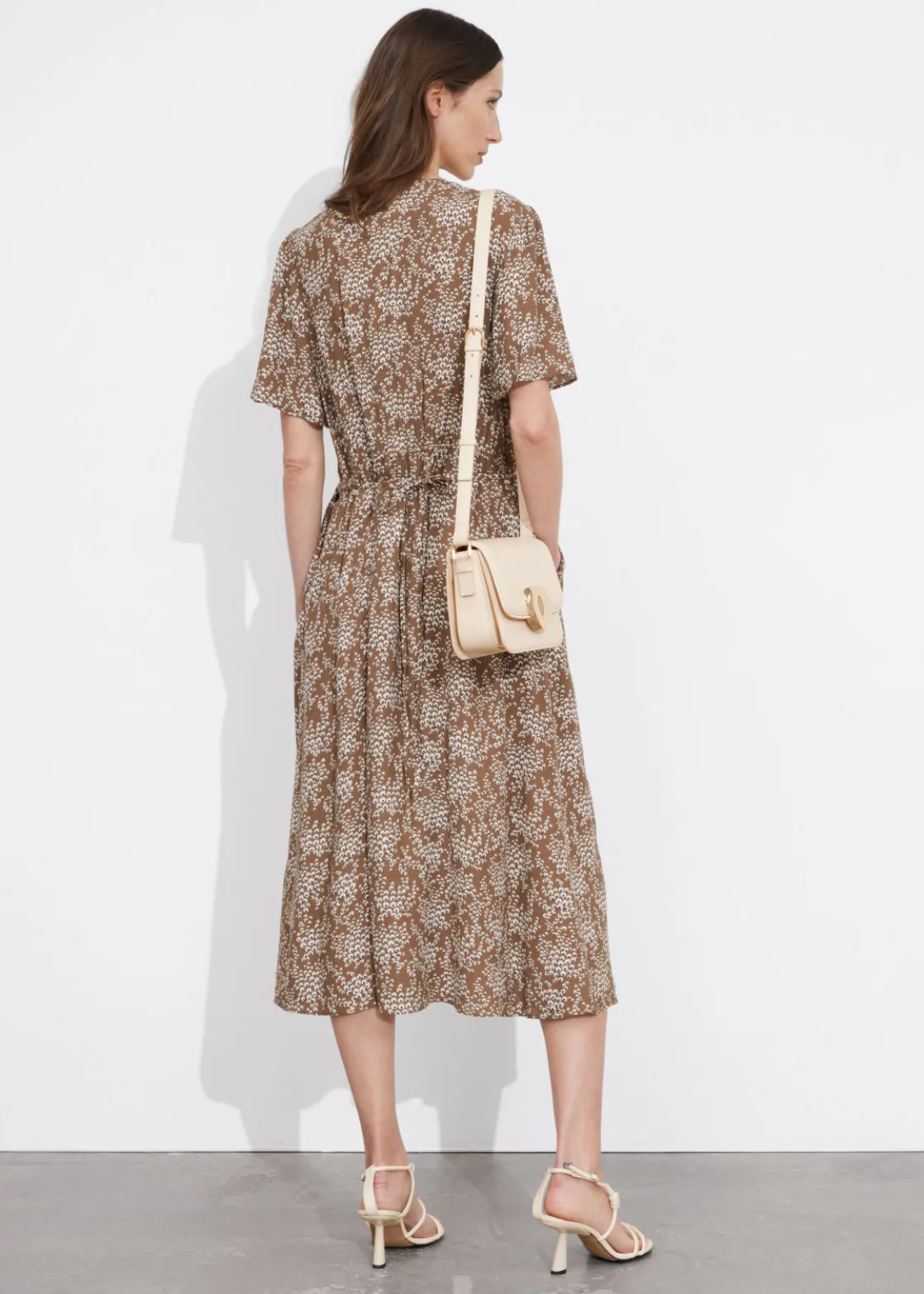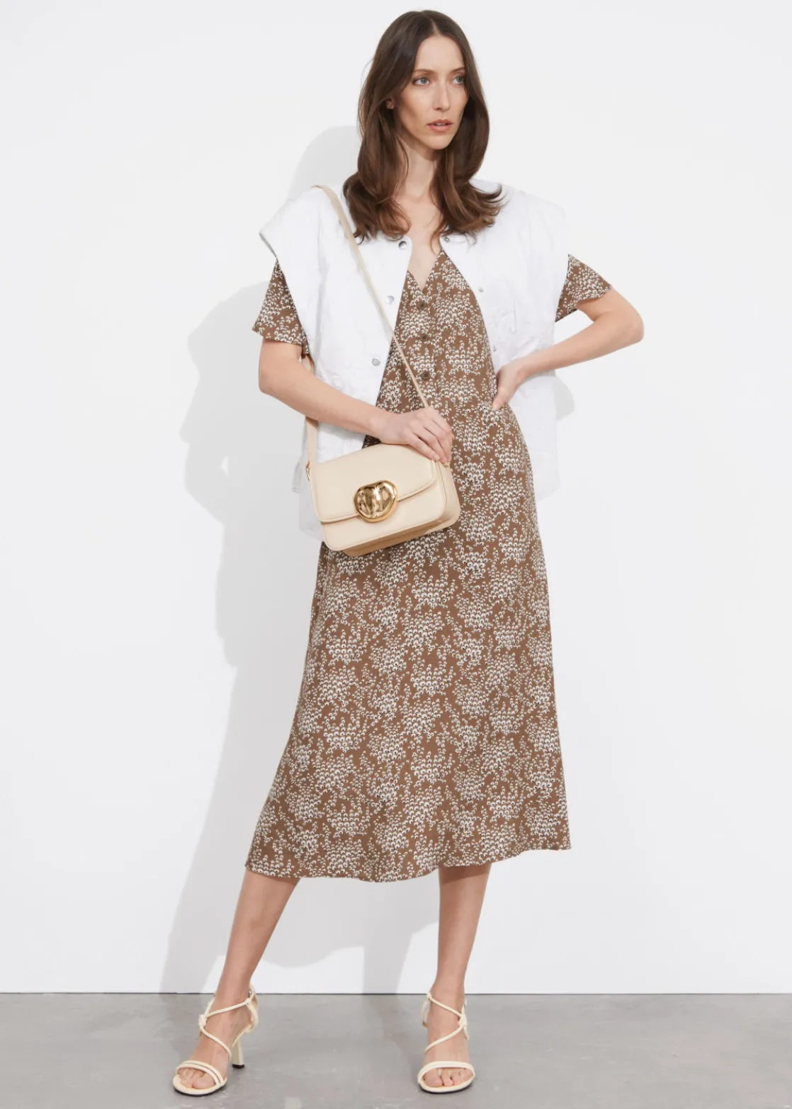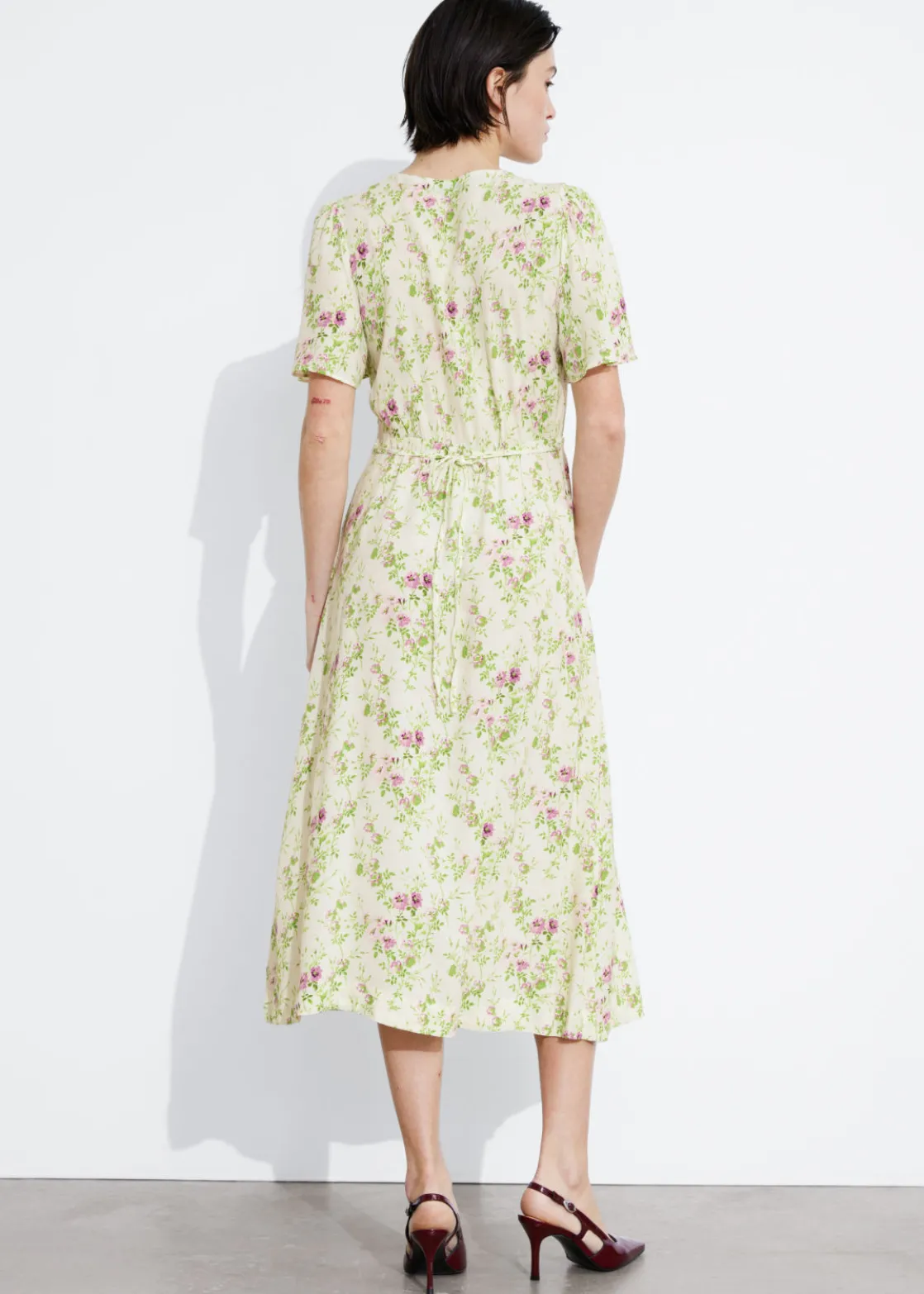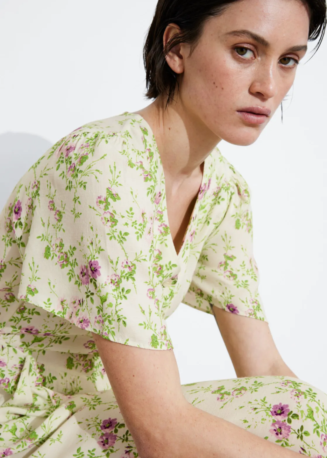 V-cut midi dress with a buttoned bodice, a defined waistline and flutter sleeves.