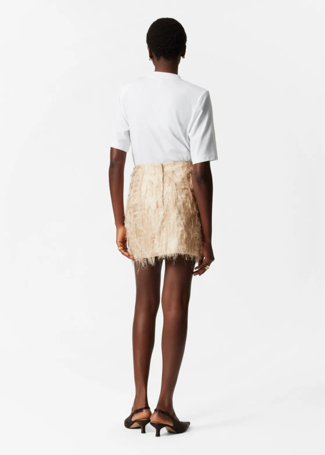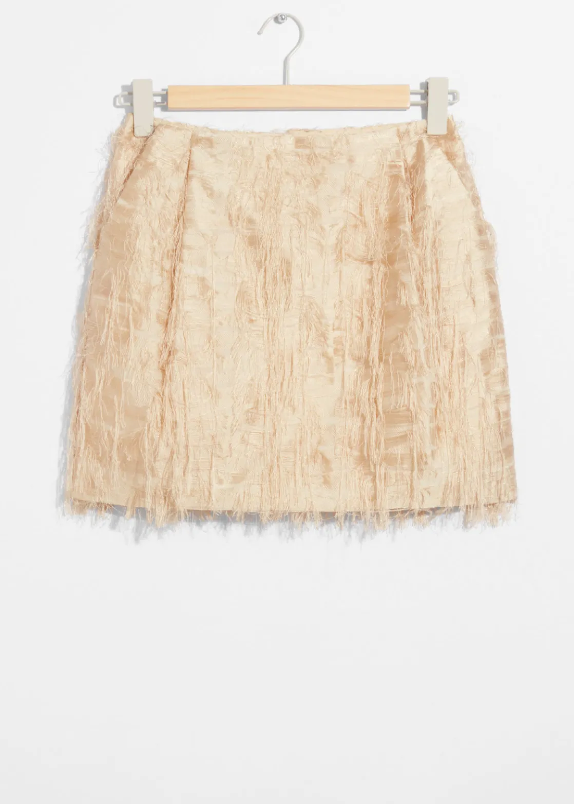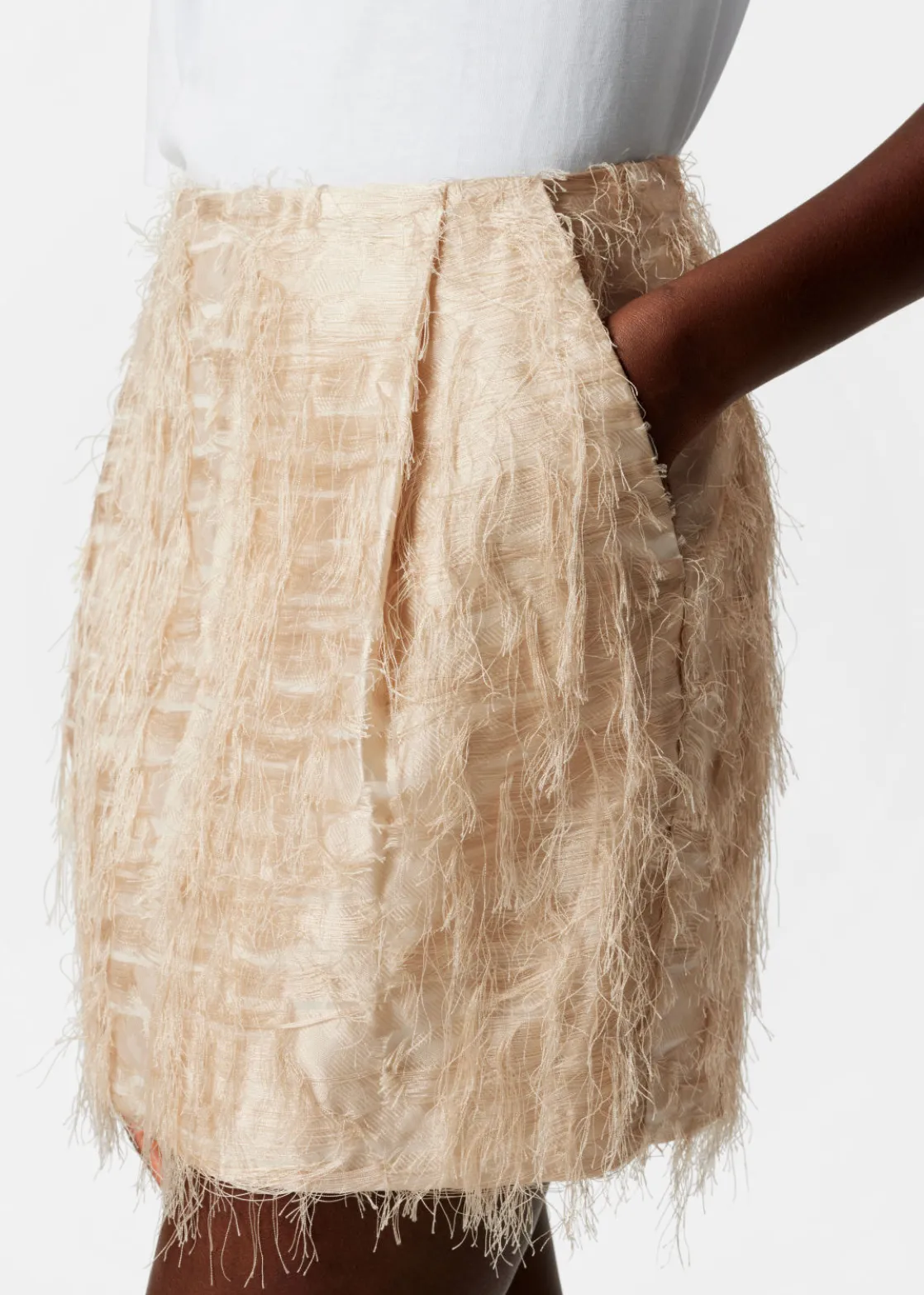 Mini skirt featuring an allover frayed finish and duo slanted pockets.