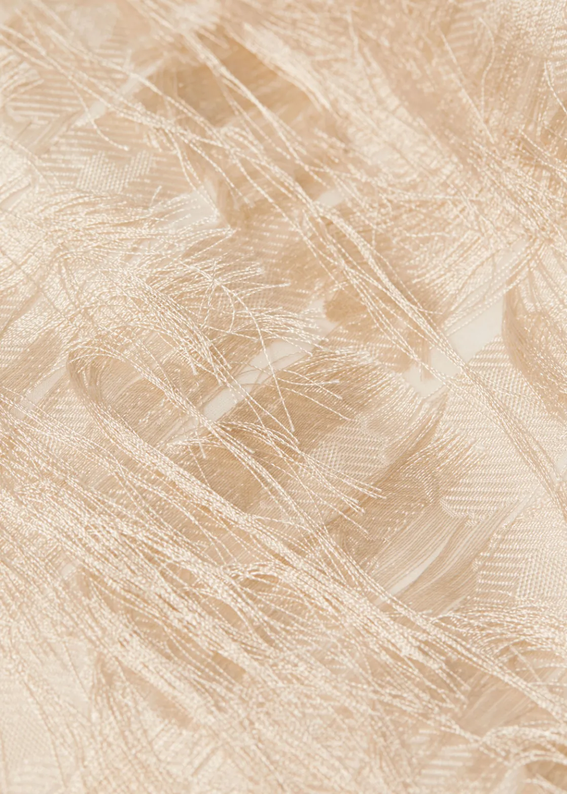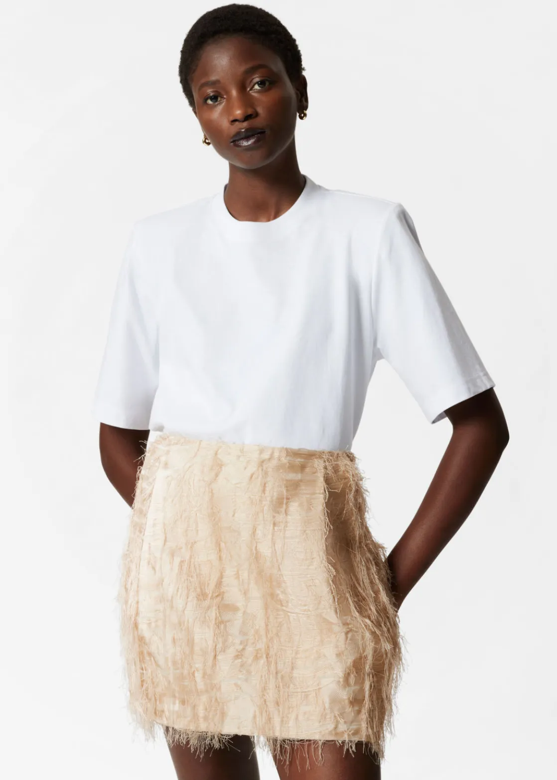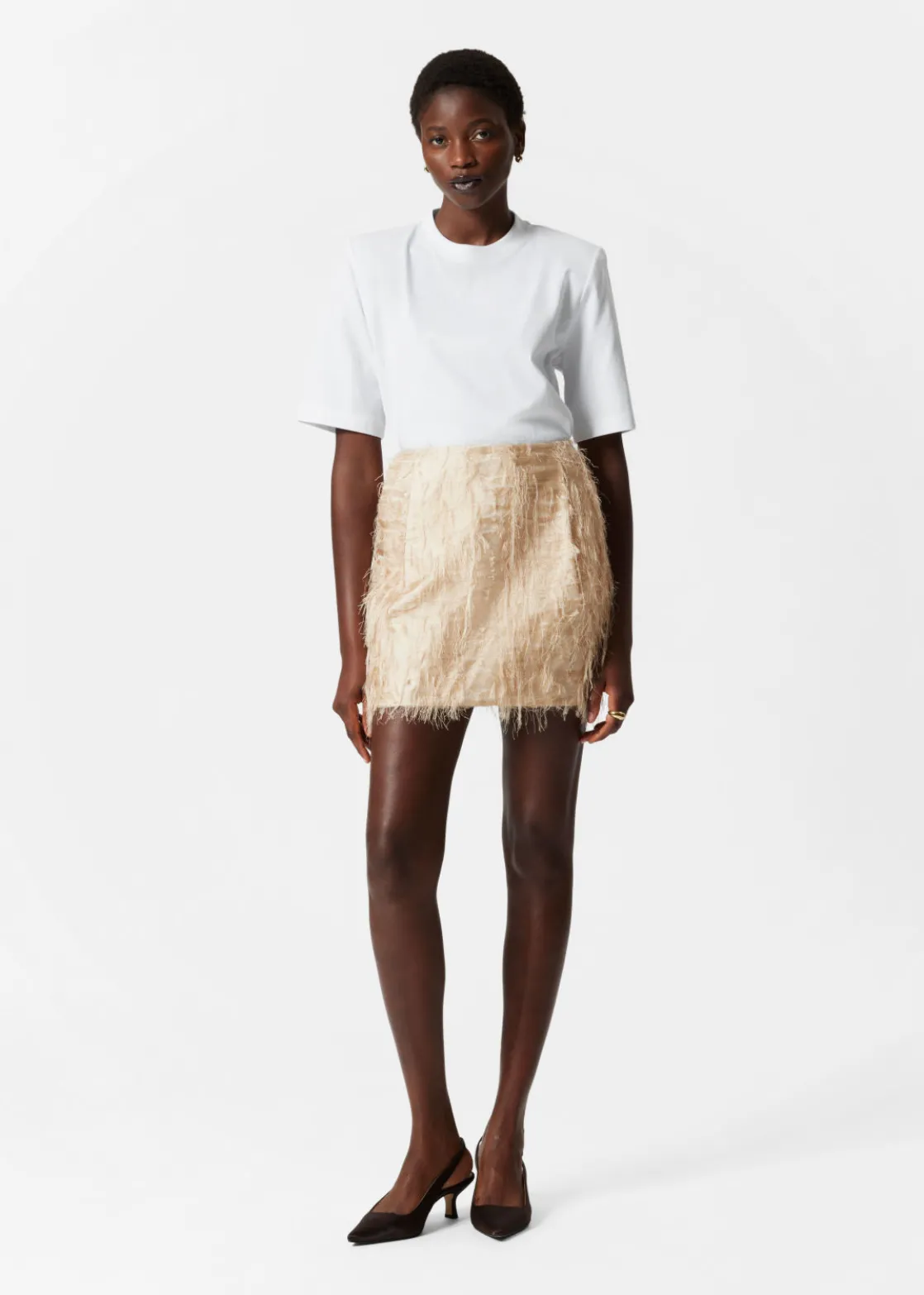 Mini skirt featuring an allover frayed finish and duo slanted pockets.