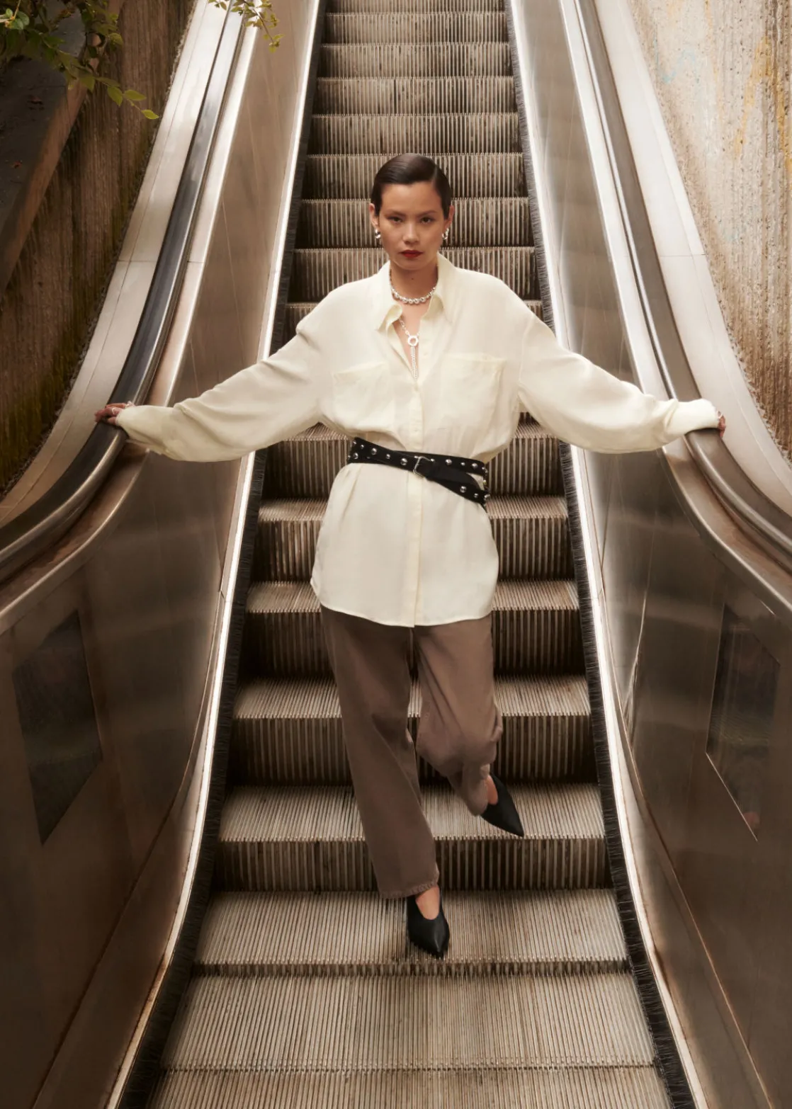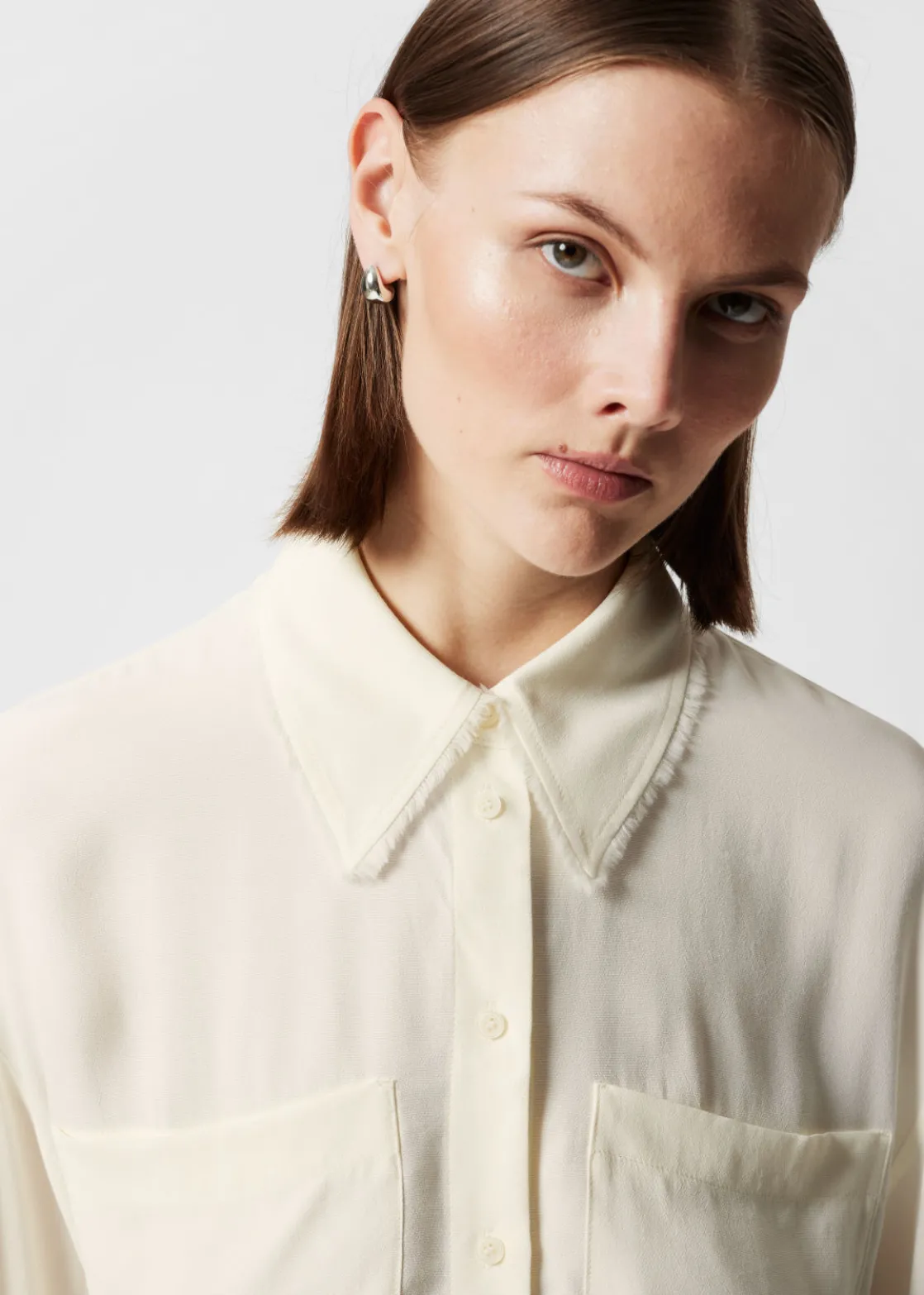 Long-sleeve shirt designed with duo chest patch pockets and frayed detailing at the collar and cuffs.