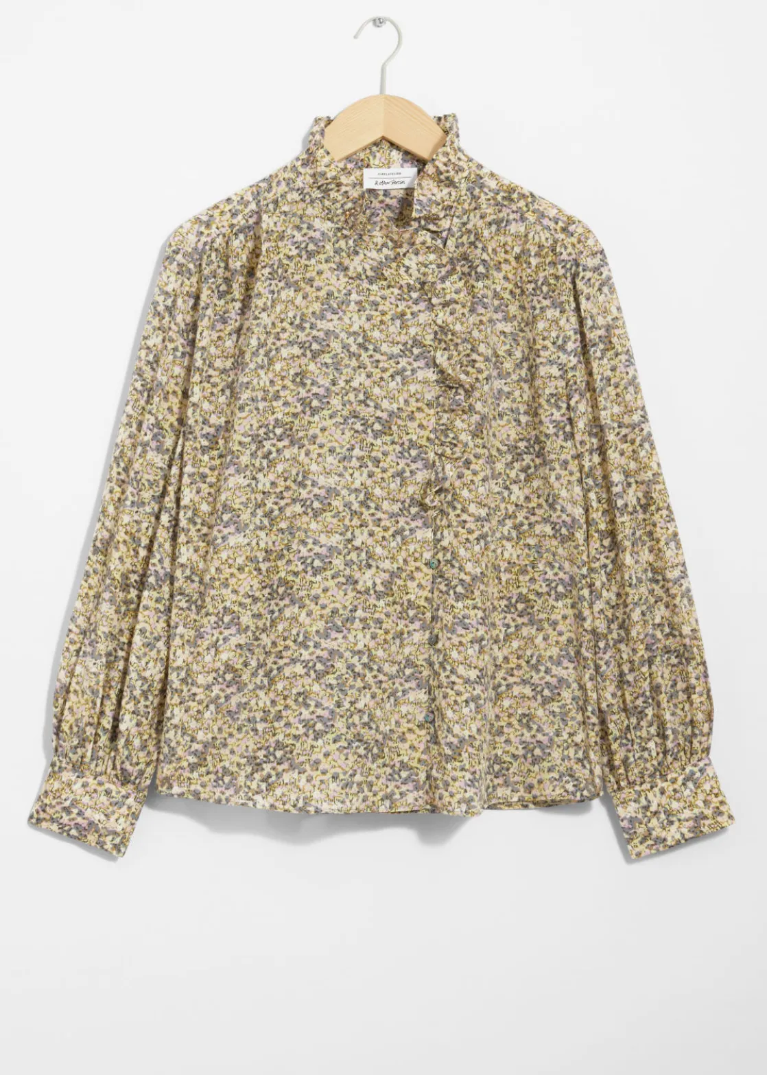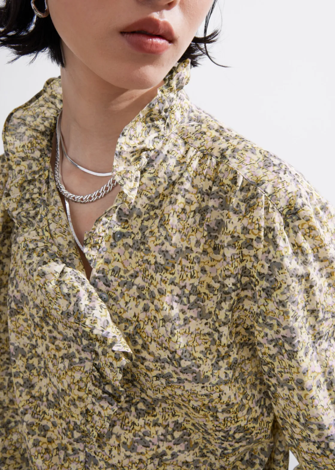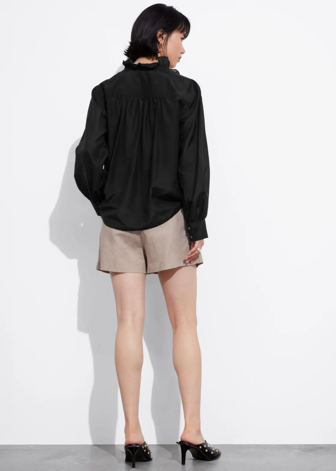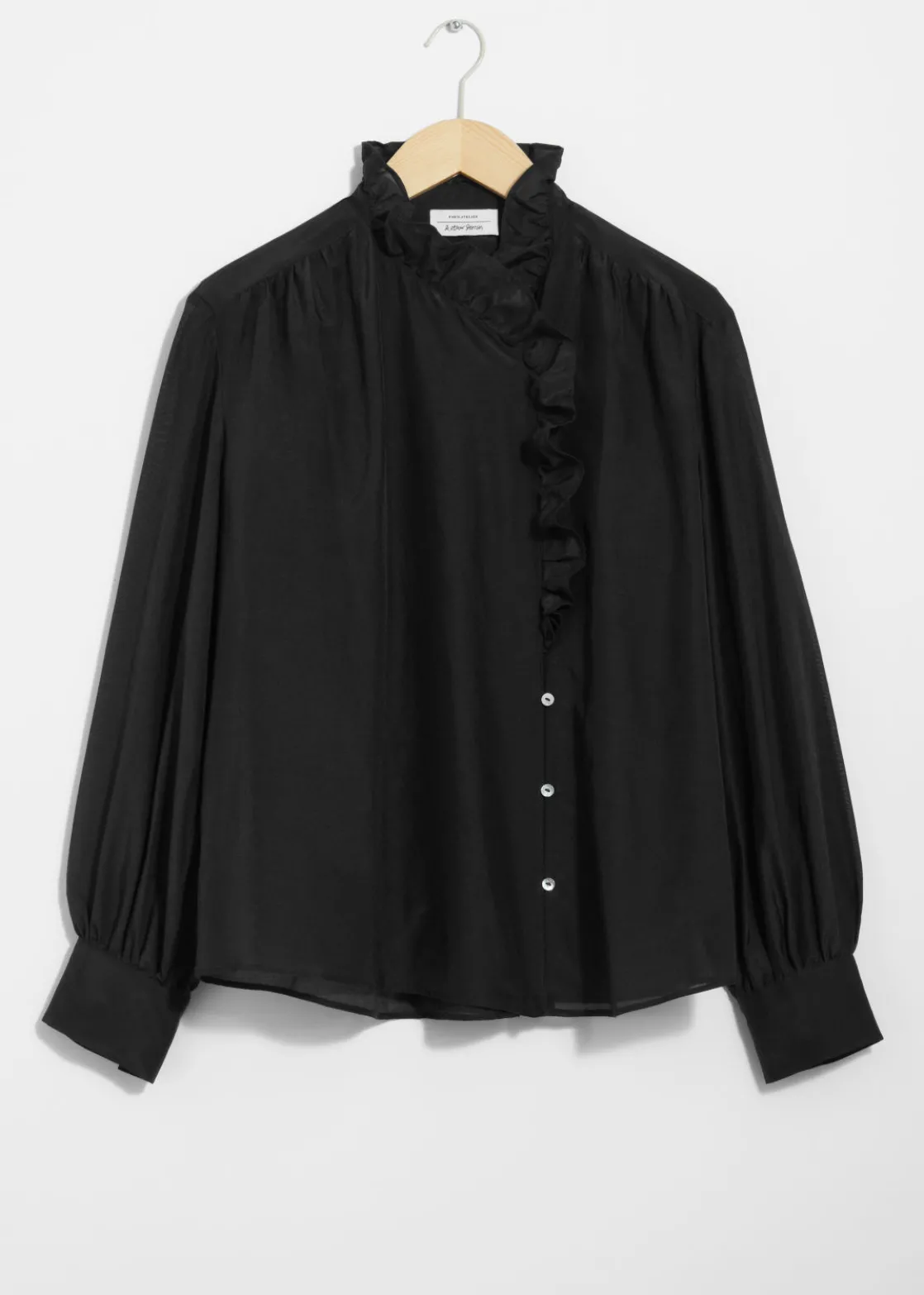 Long-sleeve blouse traced with frilled detailing along the collar and upper lapel.